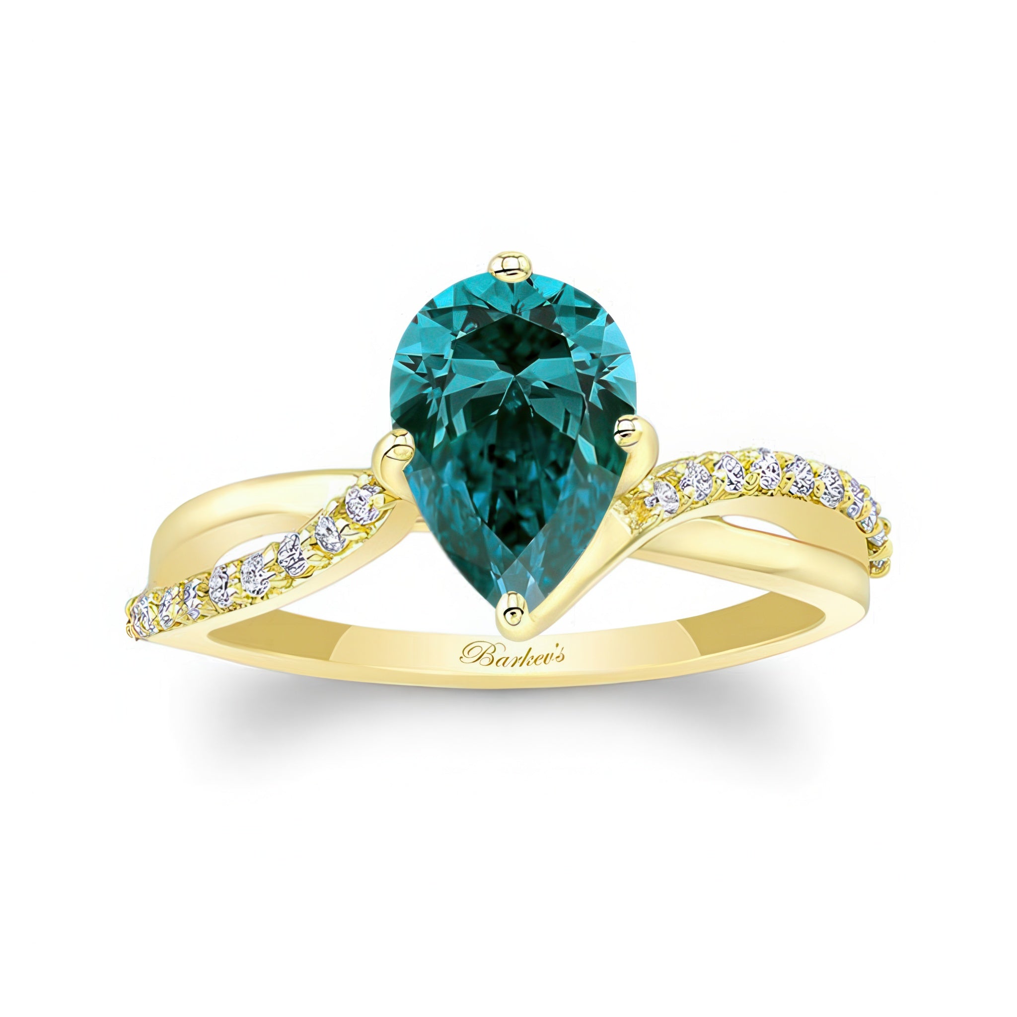 This pear shaped blue and white diamond ring with twisted band features open curving shoulders sweeping up to create the prongs that hold the almond shaped center while the opposing sides of the shank are adorned with shared-prong set diamonds for a subtle sparkle that will draw the eye.