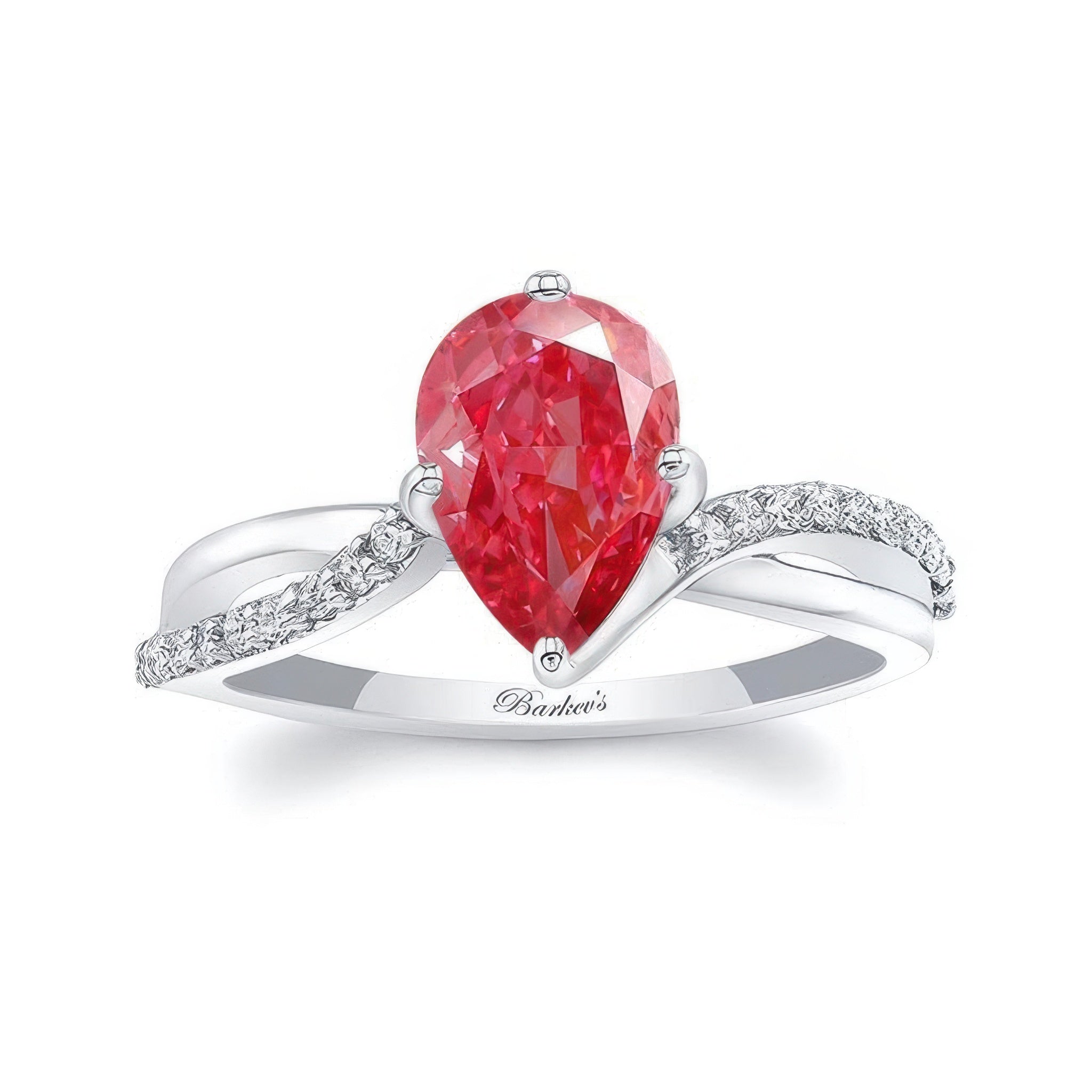 This pear shaped lab grown pink diamond engagement ring with twisted band features open curving shoulders sweeping up to create the prongs that hold the almond shaped center while the opposing sides of the shank are adorned with shared-prong set diamonds for a subtle sparkle that will draw the eye.