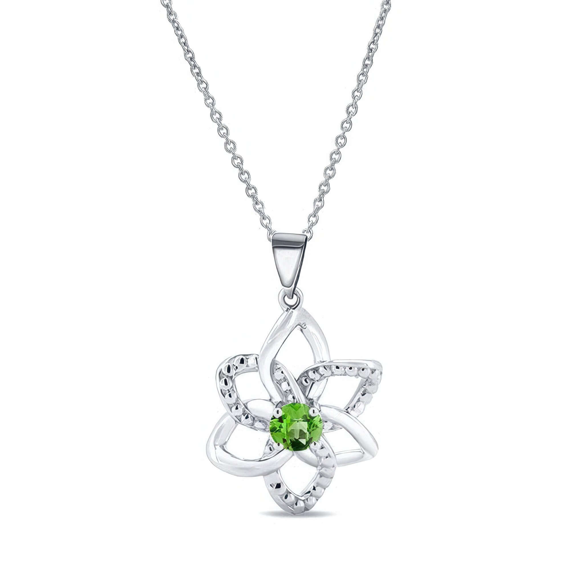 A beautiful peridot silver flower necklace featuring intertwined leaf shapes and a half carat peridot center.