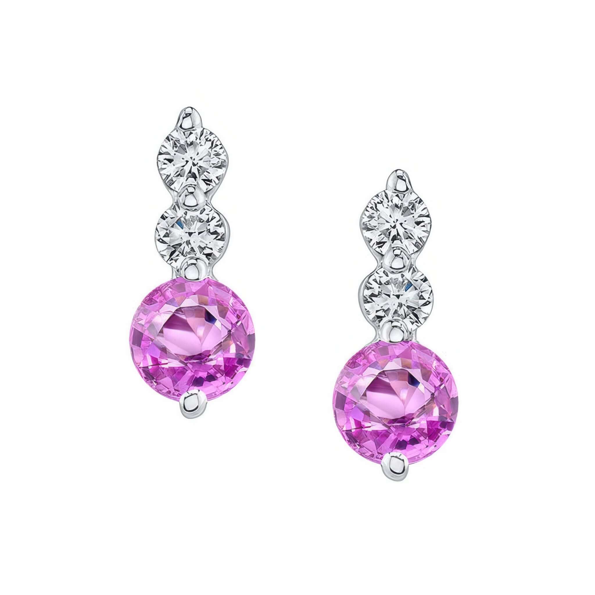 These beautiful pink sapphire and diamond earrings feature shared prong set diamonds with posts and friction backs.