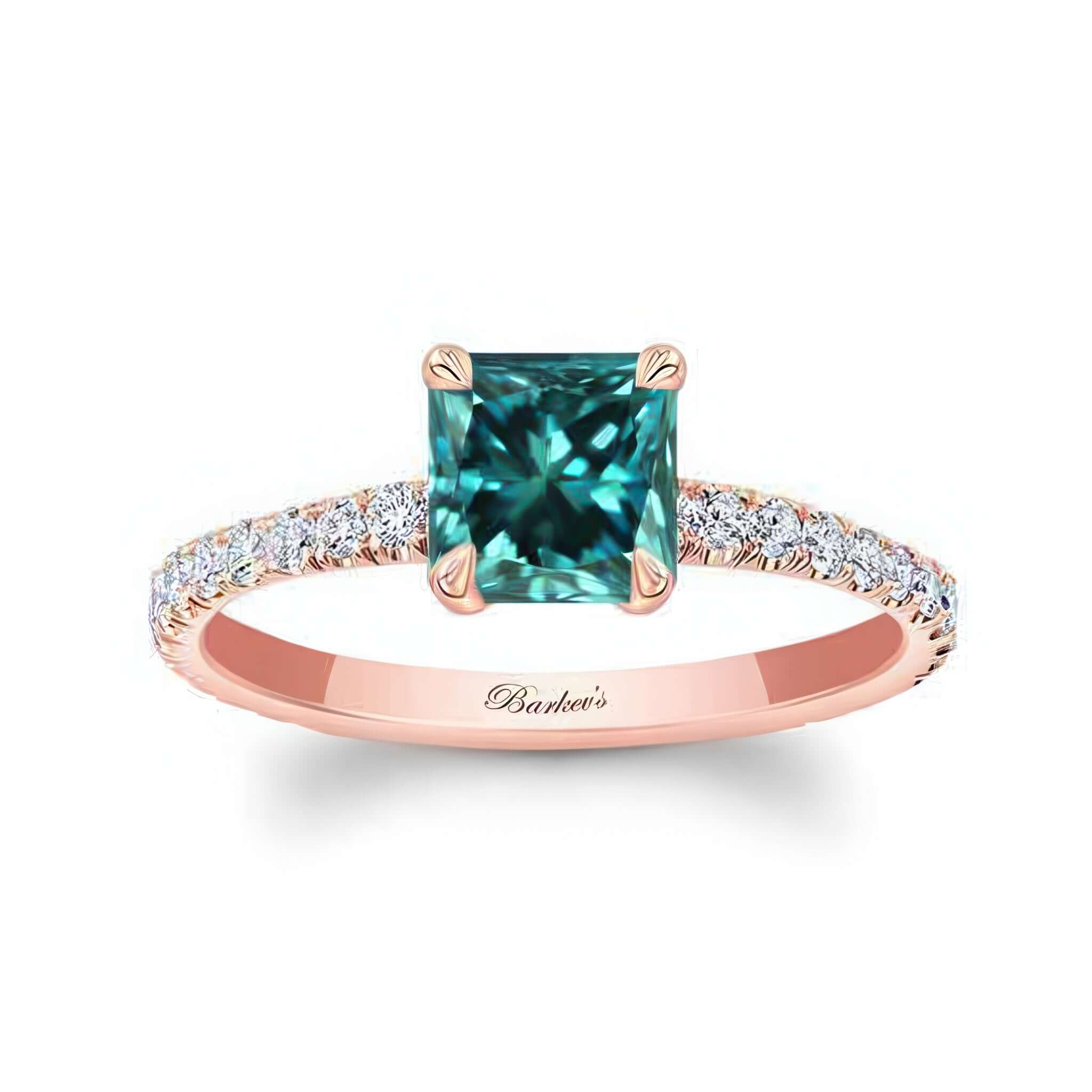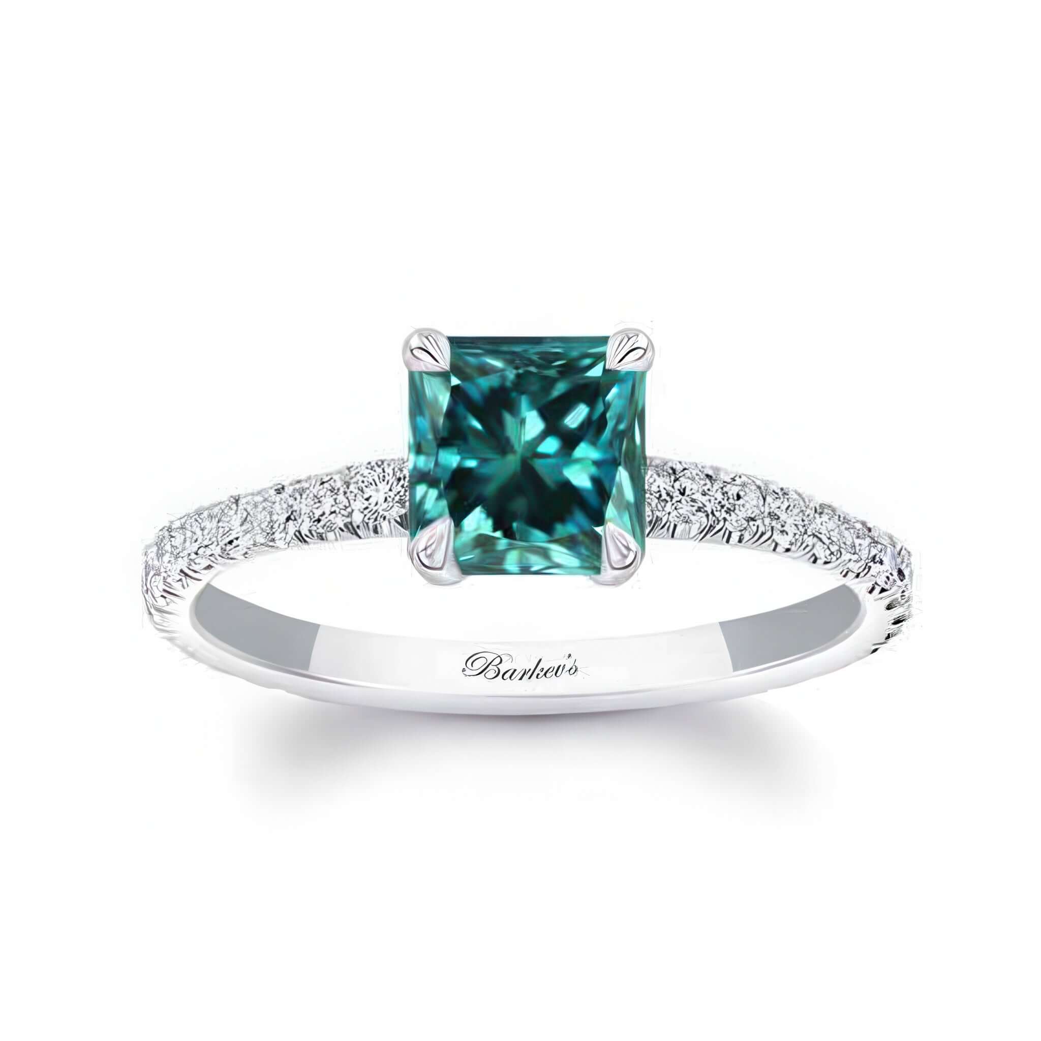 This stunning princess blue and white diamond ring features a prong set princess cut center with a french cut pave set diamond halo underneath it and more brilliant diamonds cascading down the shank for a look that's nothing short of spectacular.