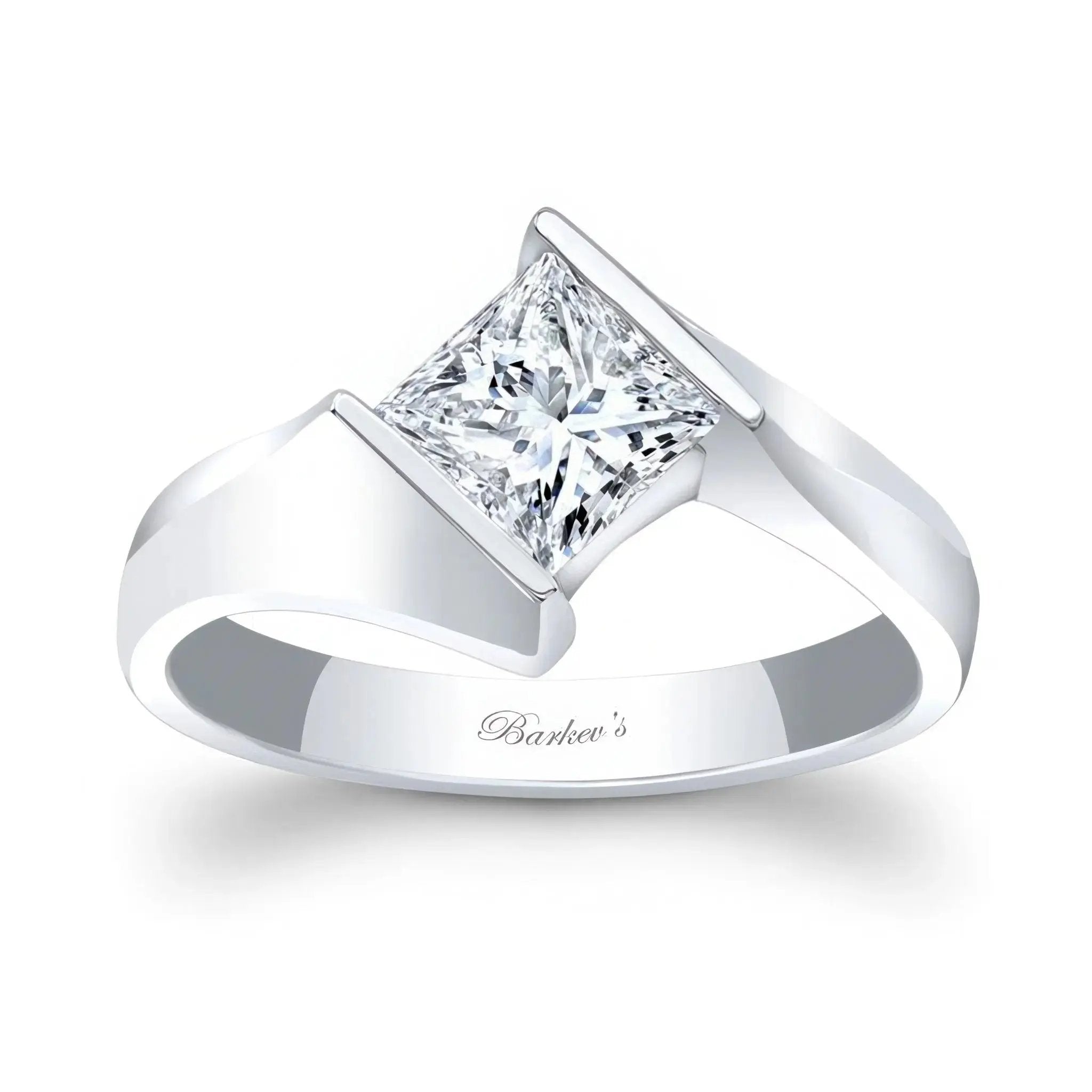This princess moissanite solitaire ring features a channel set center with a polished shank and twisted ridges for a stunning look.