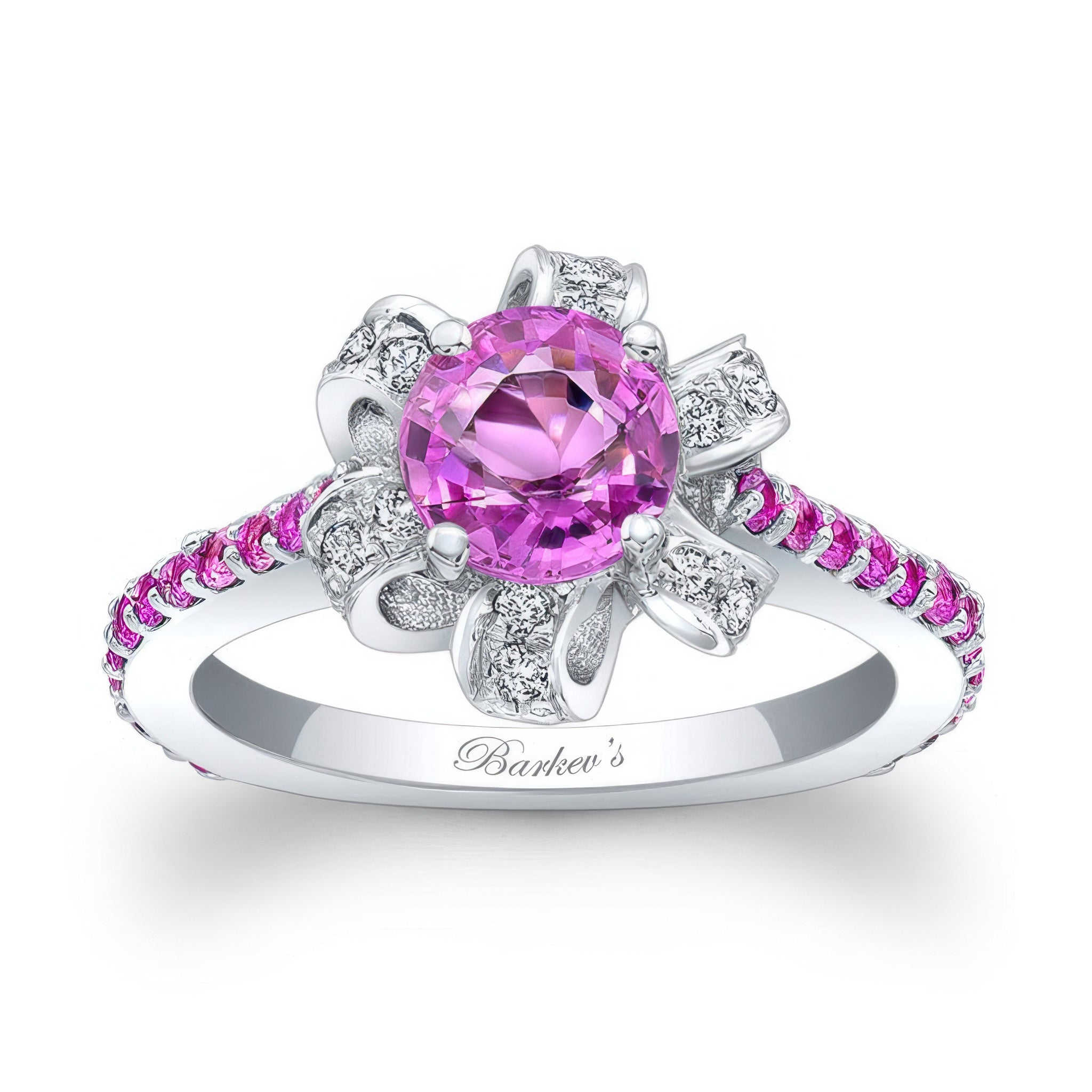 This ribbon pink sapphire ring features a halo of pave set diamond ribbons encircling the round prong set center with shared prong set pink sapphires cascading down the dainty shank for an elegant finish.