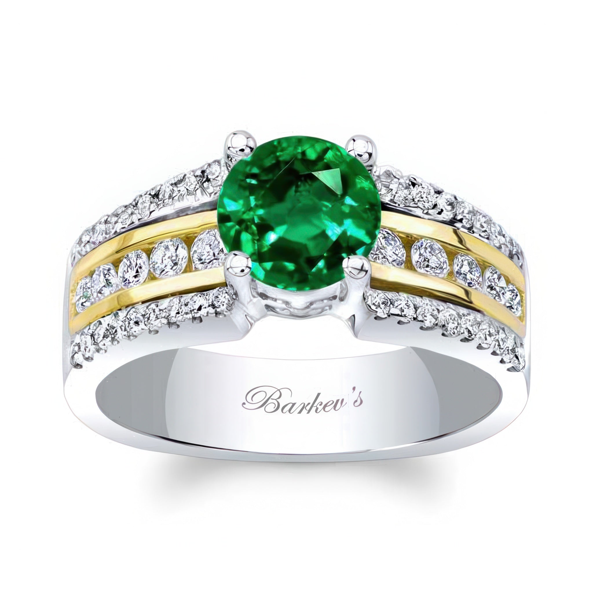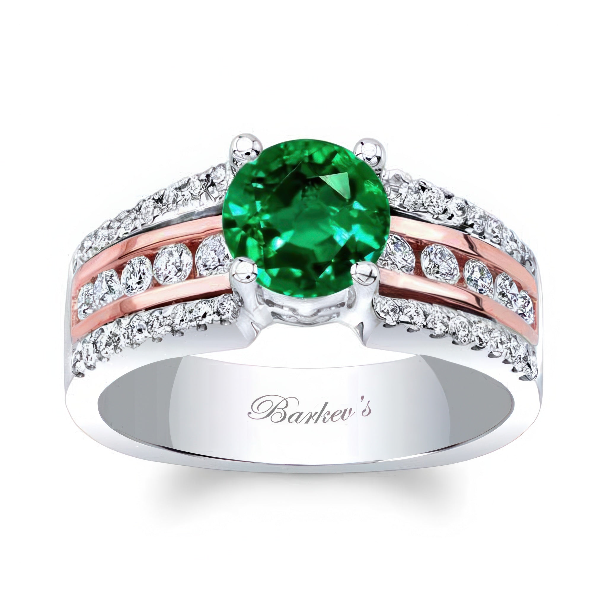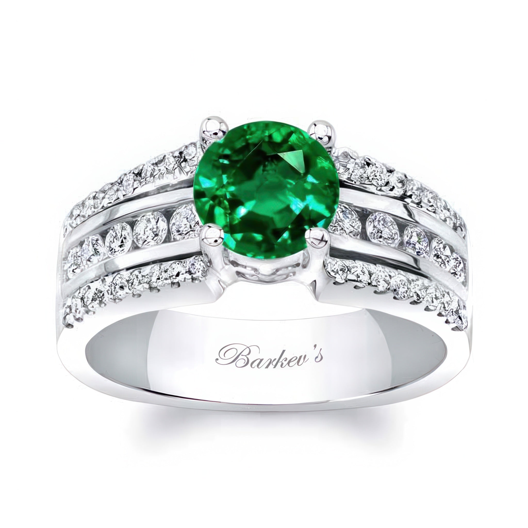 Romance is in the air with this round emerald and diamond channel set engagement ring featuring a prong set round center with three rows of diamonds cascading down the shoulders with the center row being channel set for an updated traditional look.