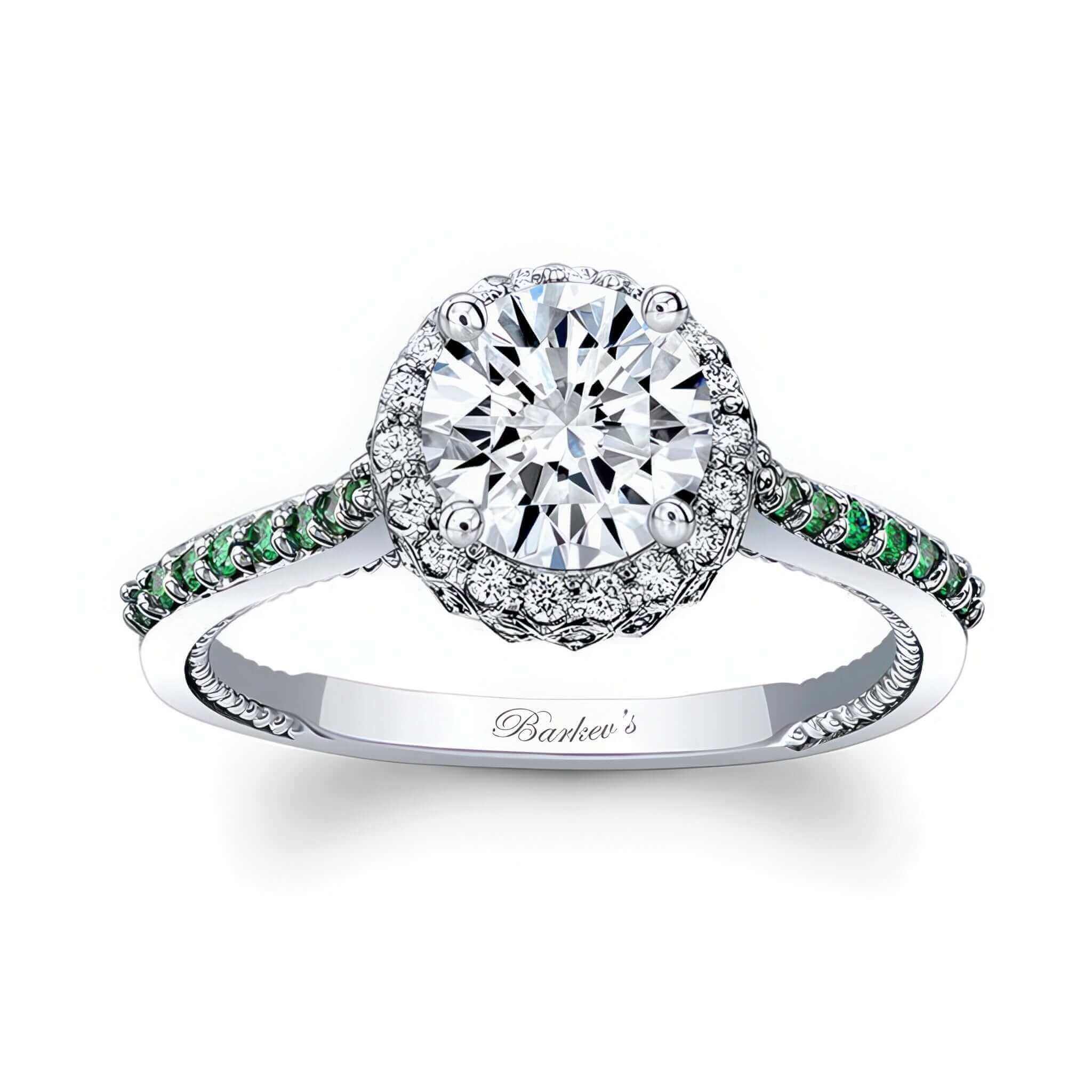 An exquisite round halo emerald accent ring with a center surrounded by shared prong melees that continue down the shoulders. The profile view reveals a second hidden halo around the sides and two larger bezel set emeralds sitting just beneath the center.