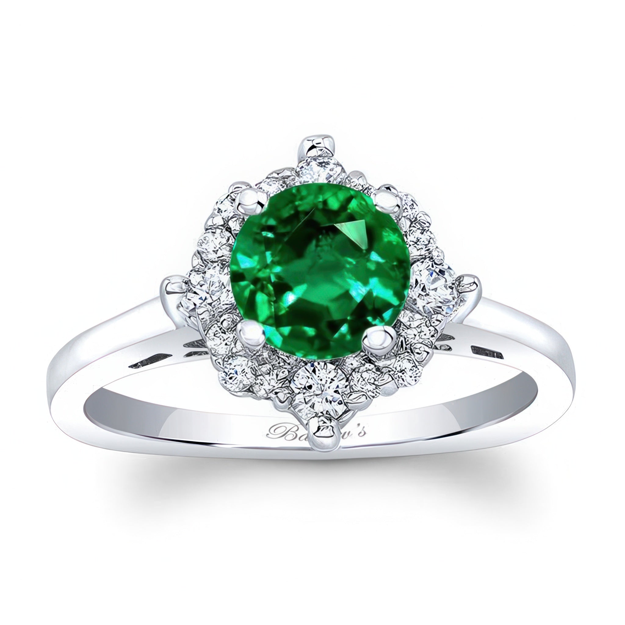 This round halo emerald and diamond engagement ring features a center embellished with diamond melees for a brilliant twist.