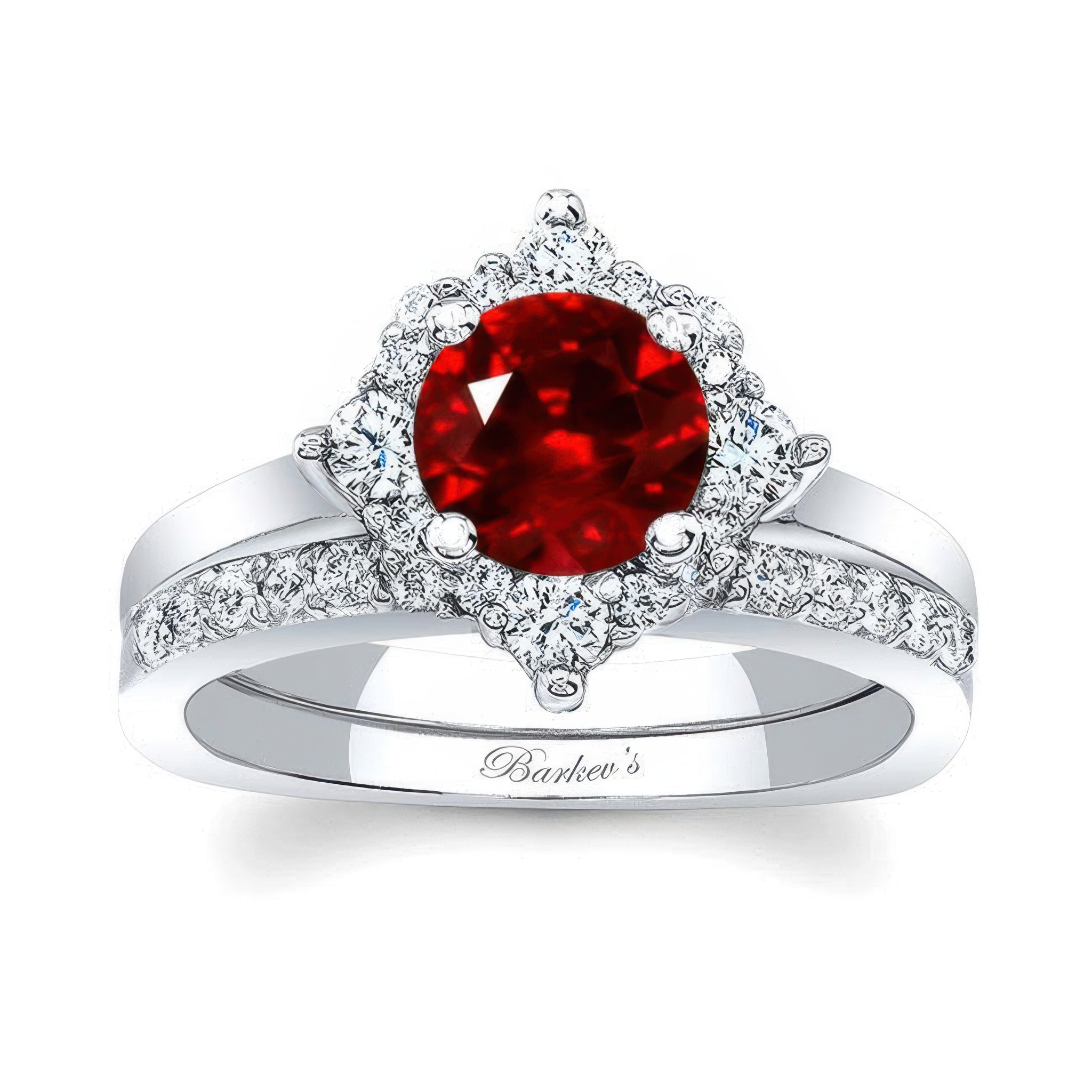 This round halo ruby and diamond bridal set features a center embellished with diamond melees for a brilliant twist. A narrow shared prong set diamond wedding band snuggles up to the side for an added touch of elegance.