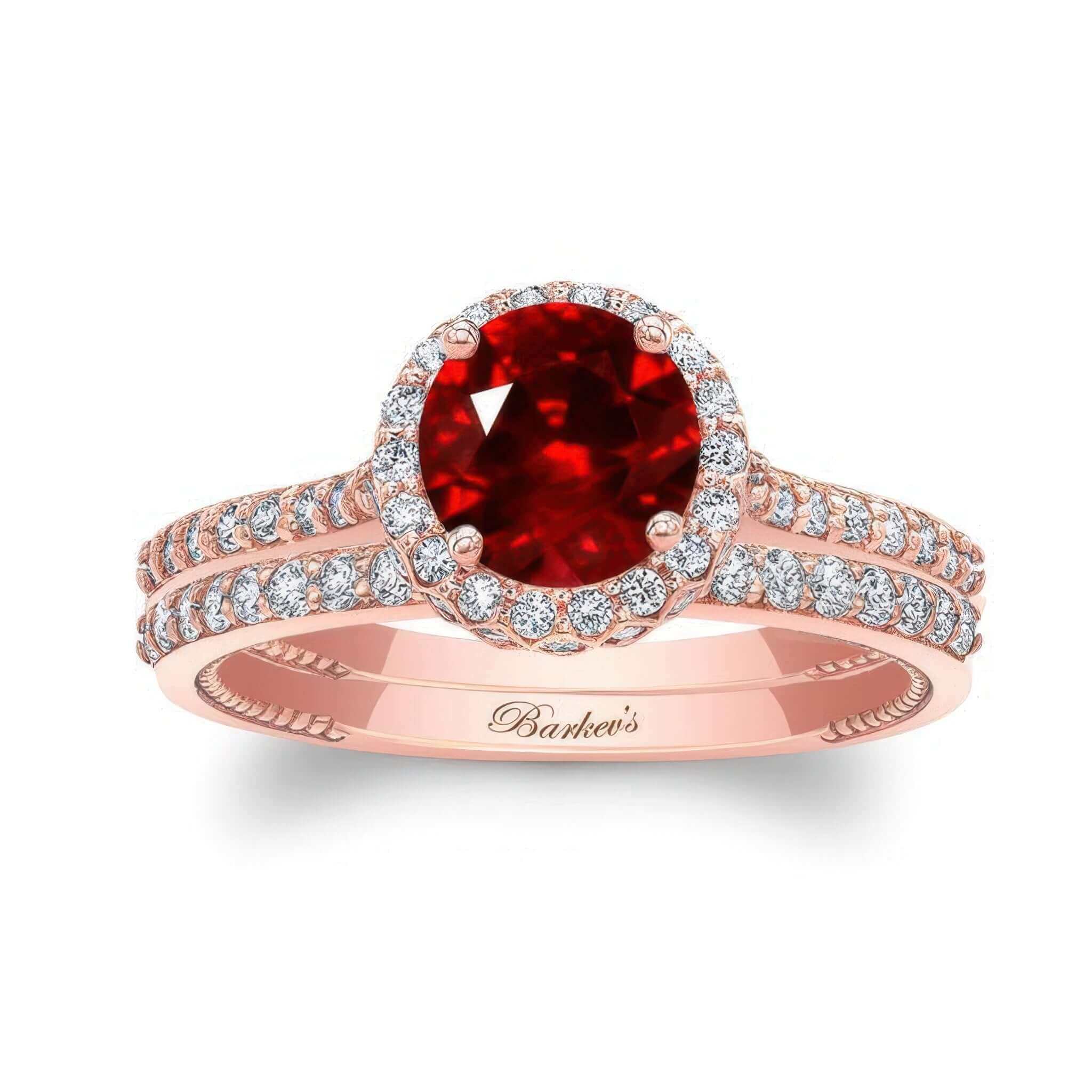 An exquisite round halo ruby and diamond wedding set with a center surrounded by shared prong melees that continue down the shoulders. The profile view reveals a second hidden halo around the sides and two larger bezel set diamonds sitting just beneath the center. A matching wedding band sits up closely on the side to emphasize the design.