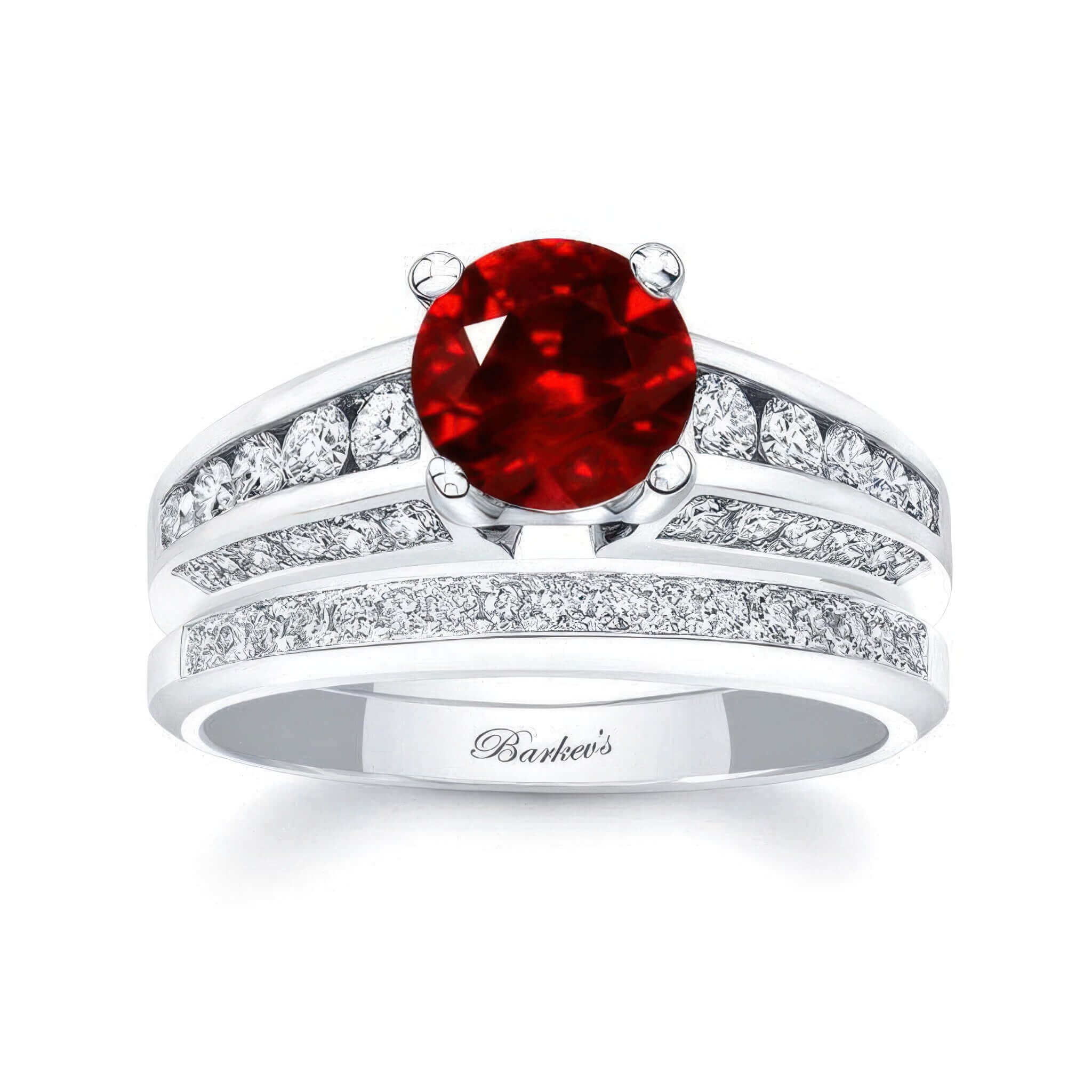 This magnificent ruby and diamond channel set wedding ring set boasts with sparkle from every angle featuring beveled edges and a round center that is met by a row of channel and pave diamonds adorning not only the top, but also each side of the shank. Adding to this brilliance, the diamond wedding band fits snuggly close to the engagement ring for an unparalleled look.