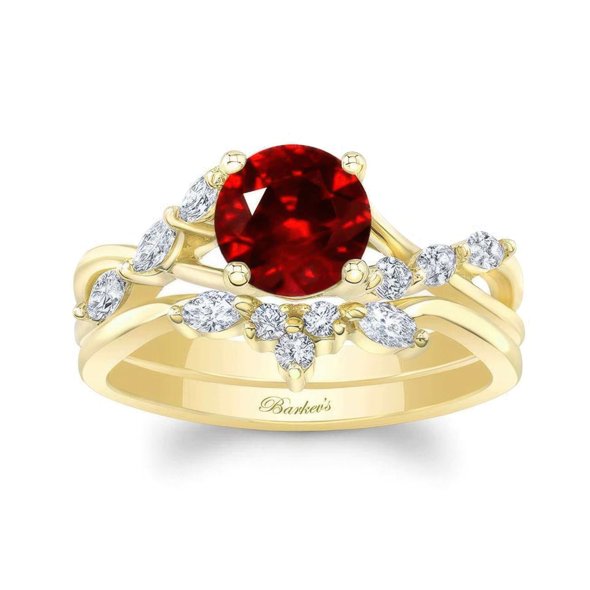 This ruby and diamond marquise accent wedding set gives off a classic vibe, with a round diamond center, diamonds adorning the sides and a sparkling wedding band with an elegant curve of diamonds.