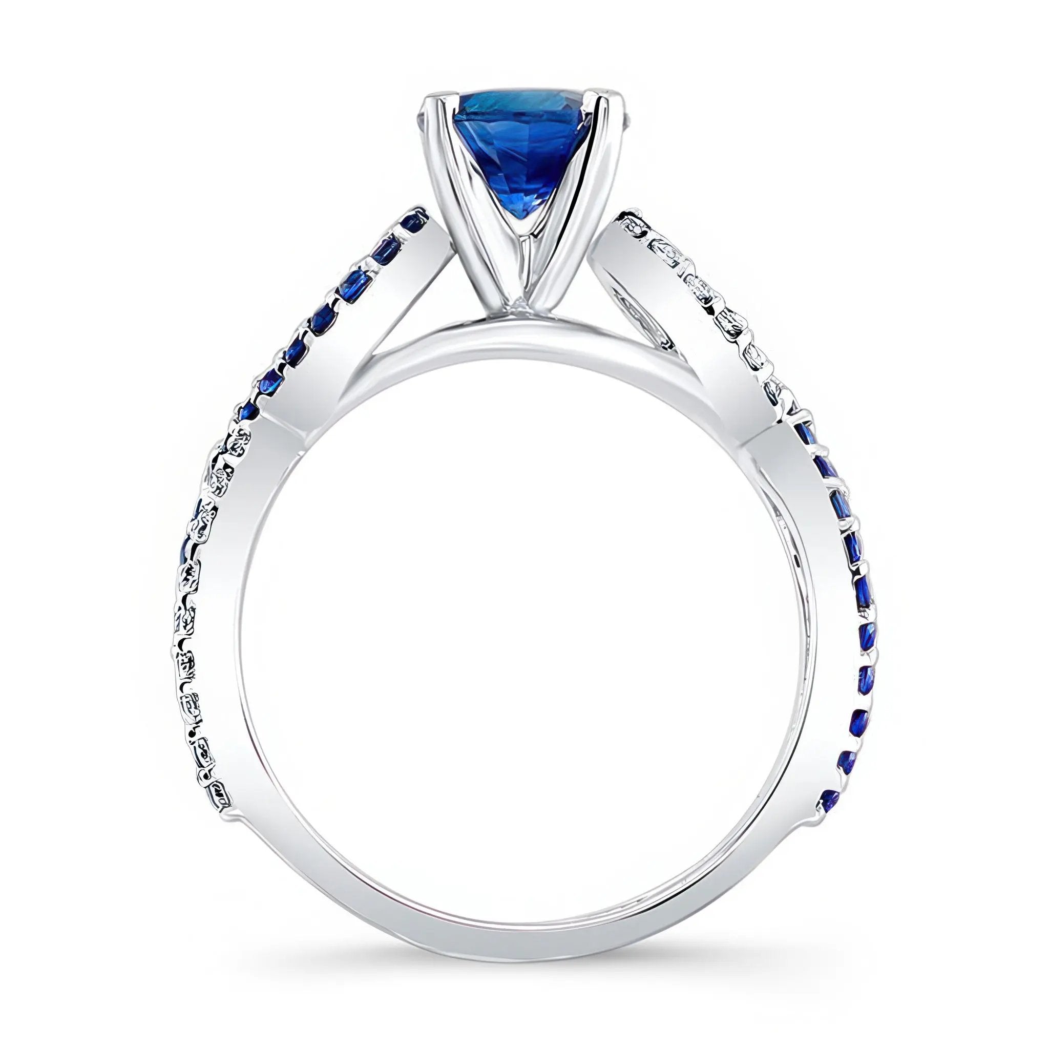 This sapphire infinity ring features a prong set round center with an artfully curving cathedral shank that crisscrosses down the shoulders adorned with shared prong set diamonds and blue sapphires for a glamorous look sure to be treasured.