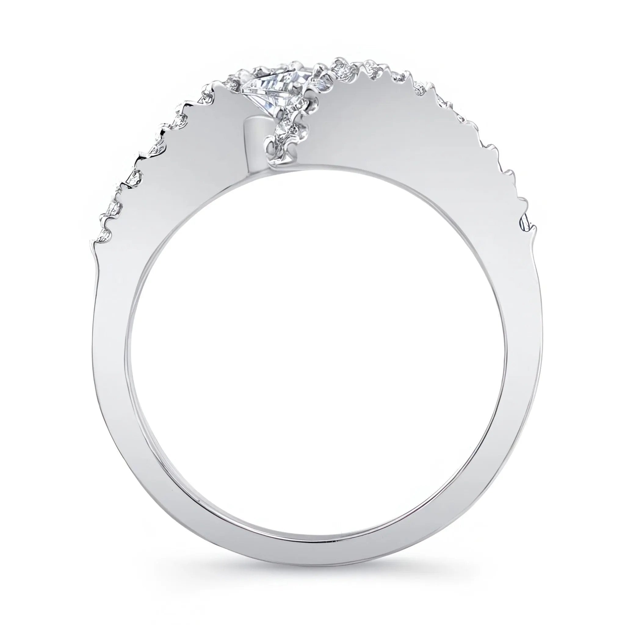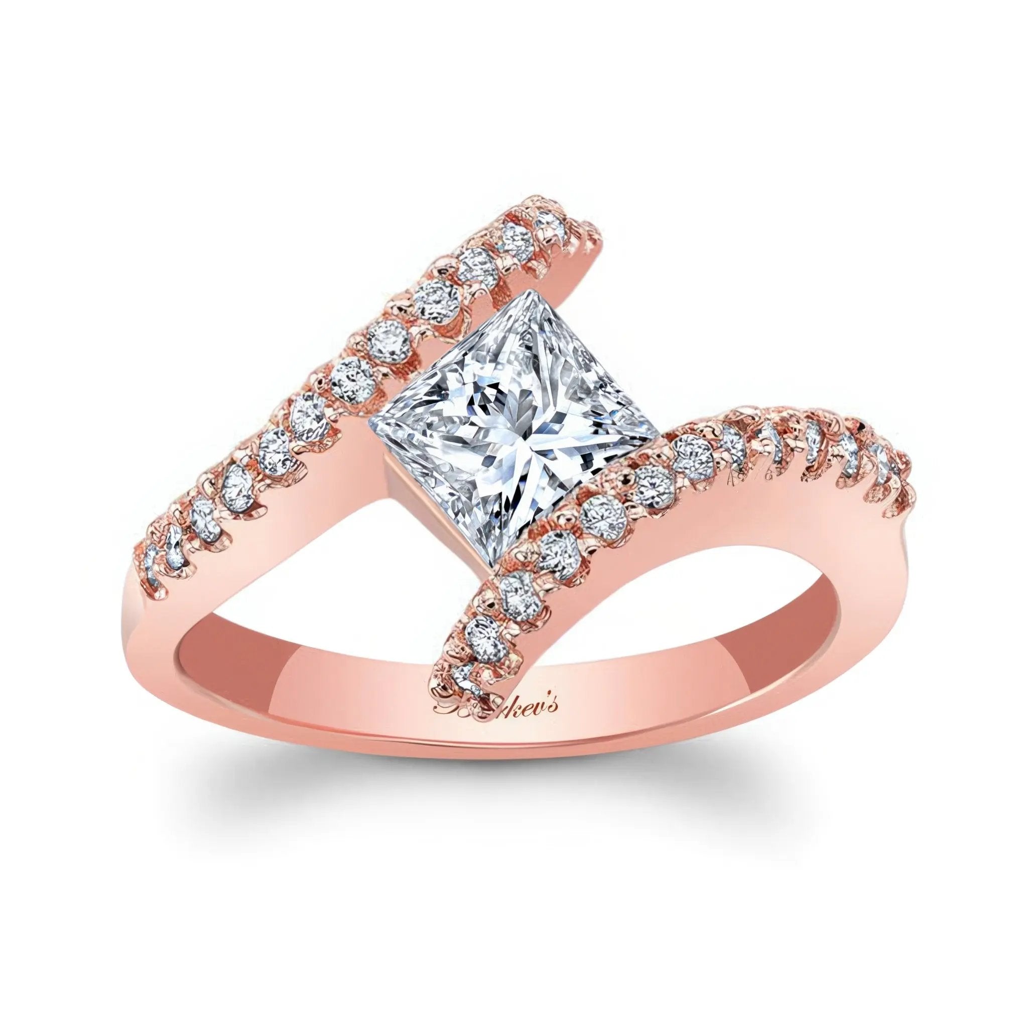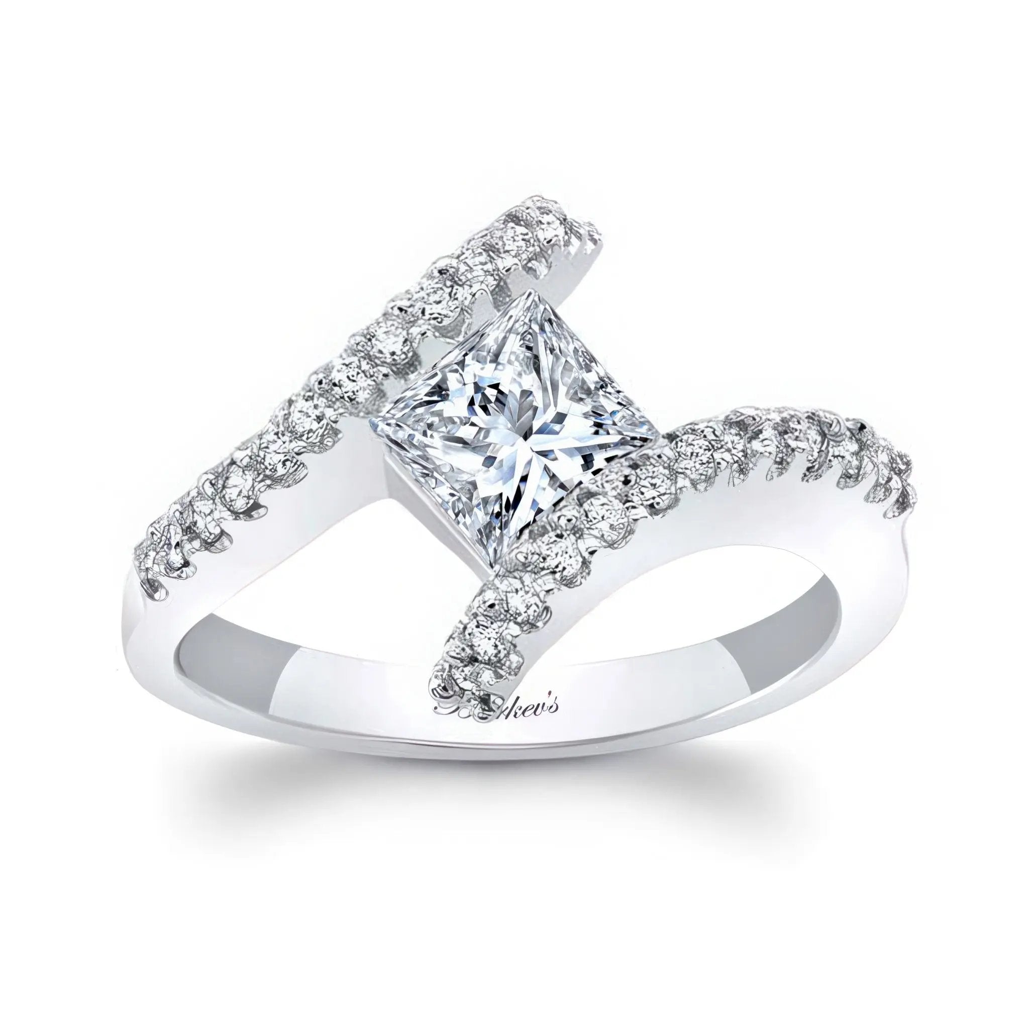This sideways princess cut lab diamond engagement ring gives the illusion of a tension style setting while pave set diamonds accent the band adding an overall shine to this dazzling design.