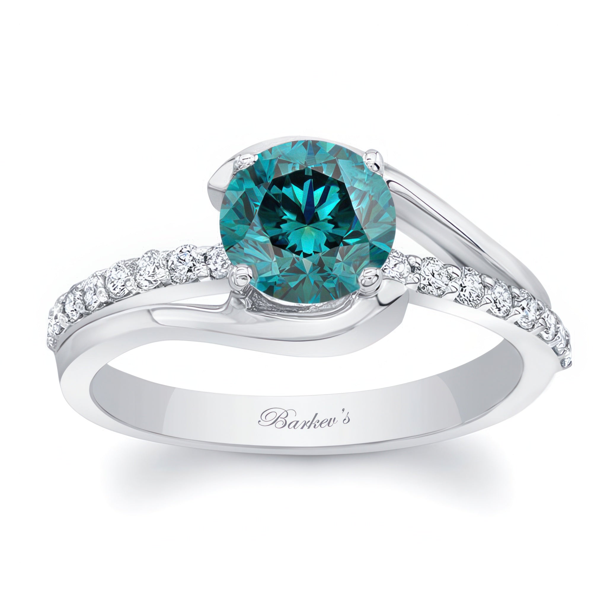 This simple 1 carat round blue and white diamond ring features a split shank that swirls to cradle the round center while a shared prong set diamond bridge crosses underneath for a dramatic fashion statement.