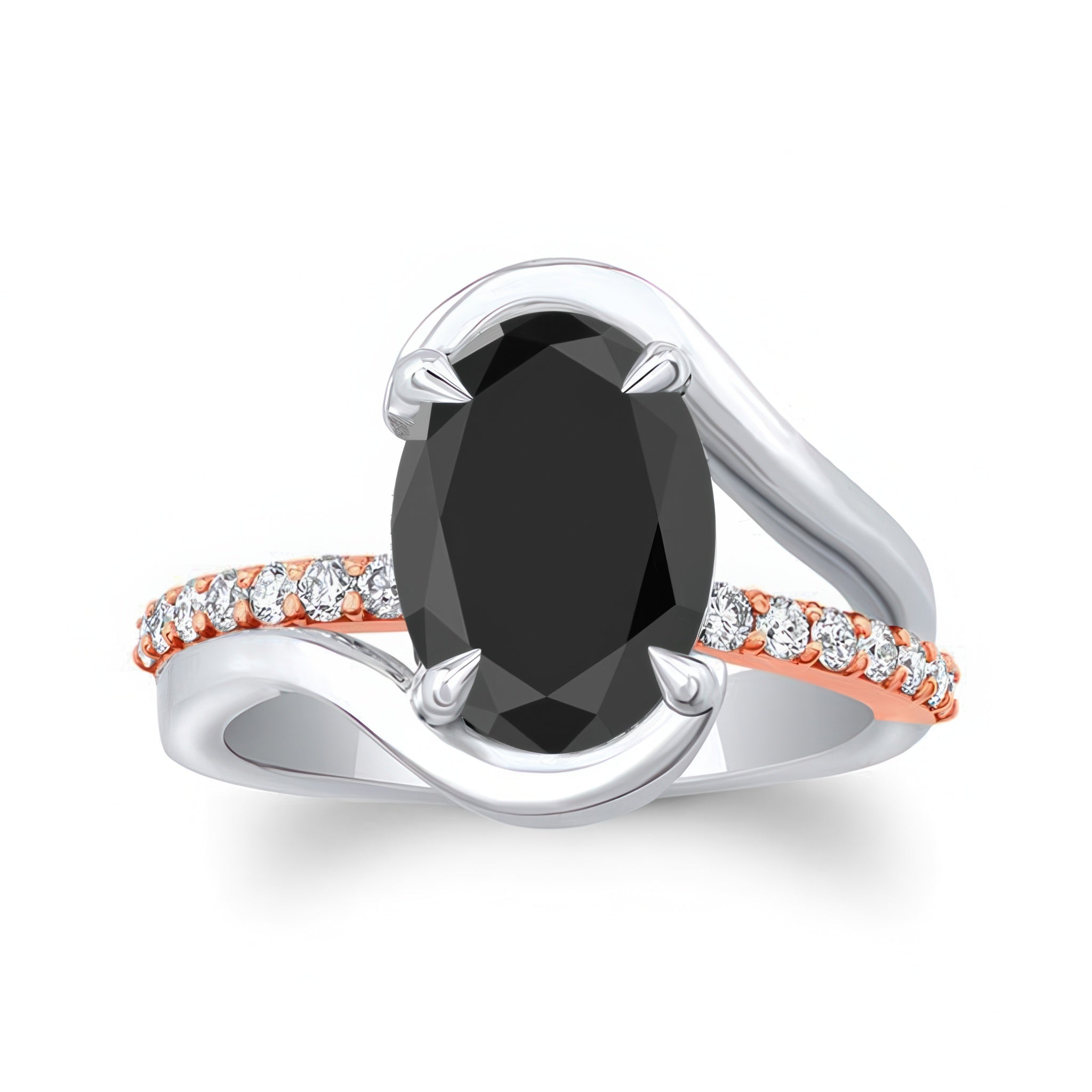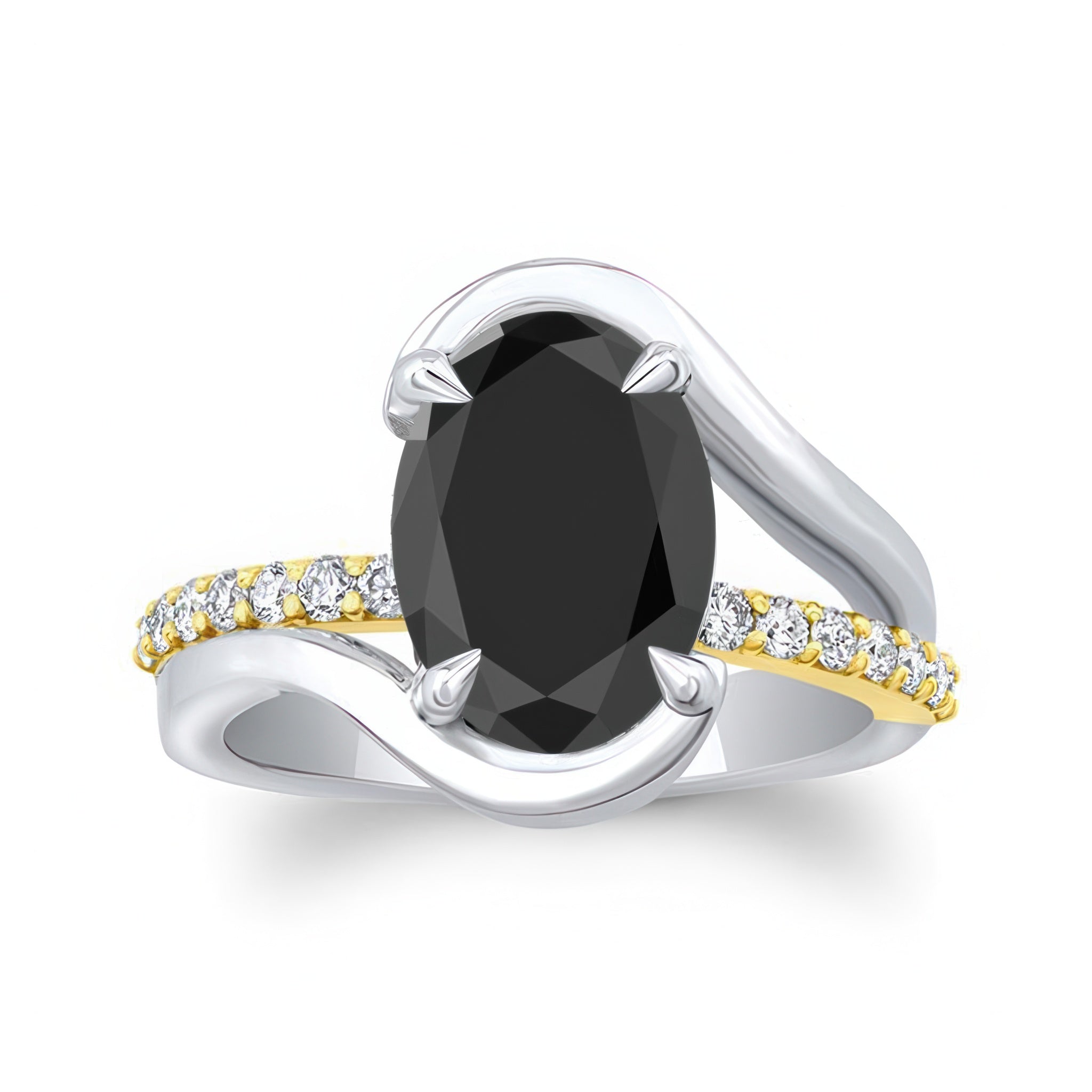 This simple 3 carat oval black and white diamond ring features a split shank that swirls to cradle the oval center while a shared prong set diamond bridge crosses underneath for a dramatic fashion statement.