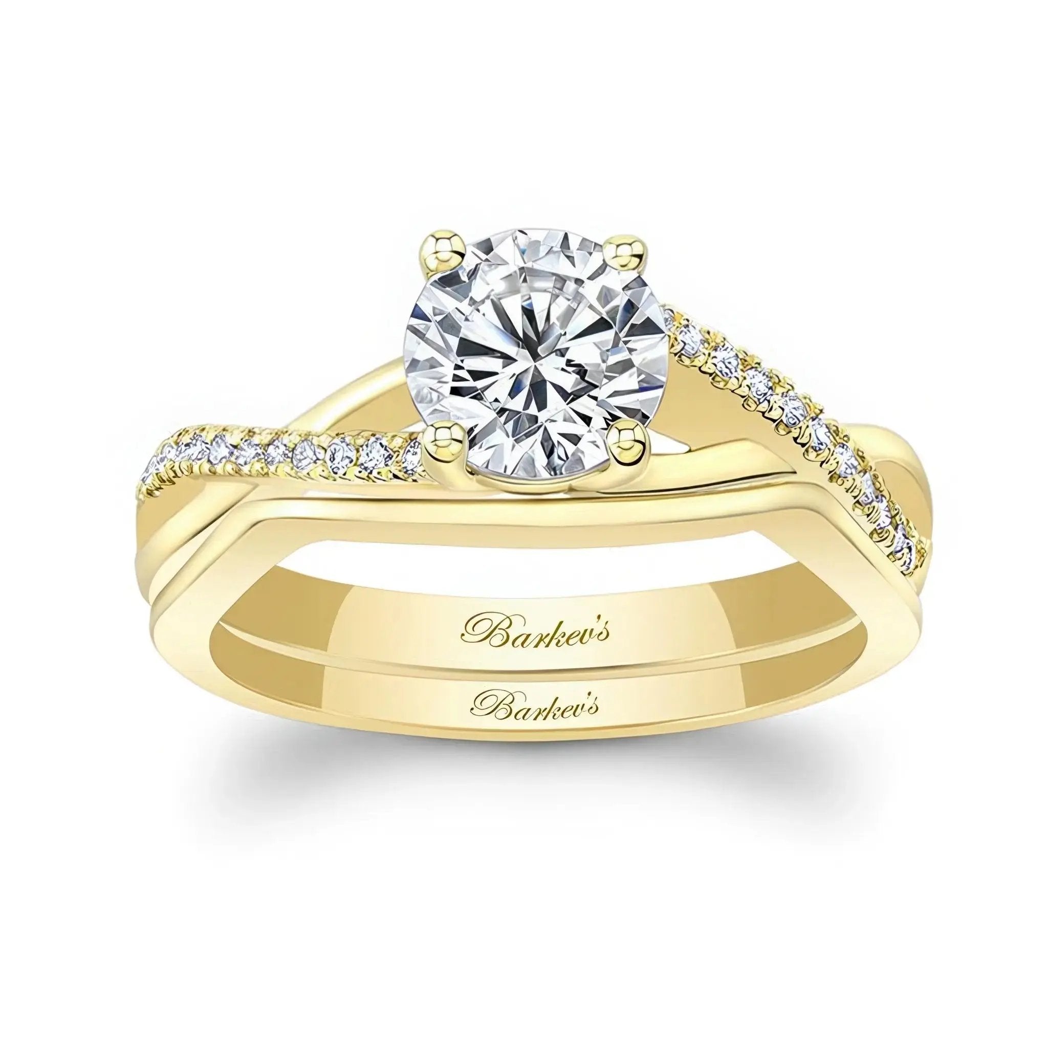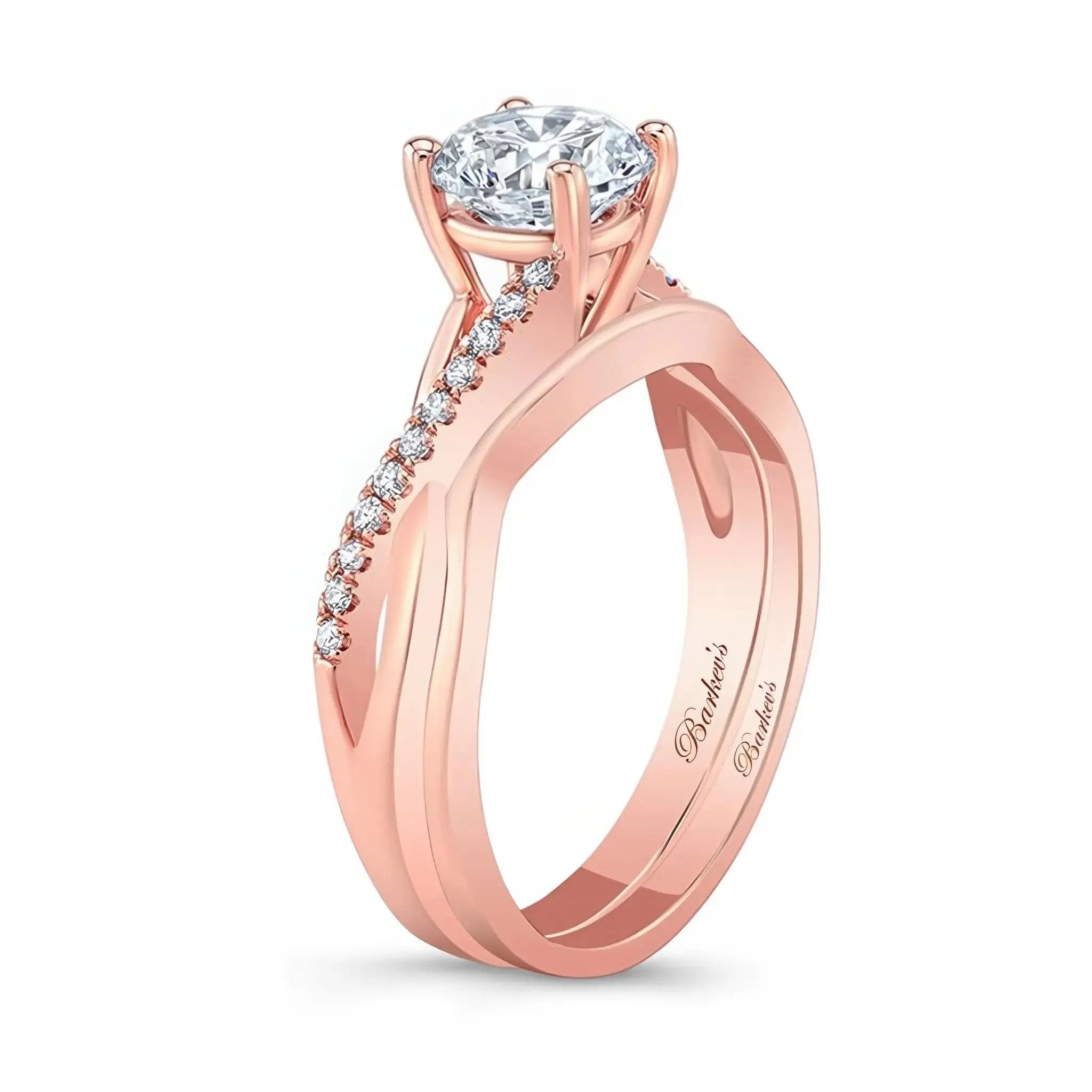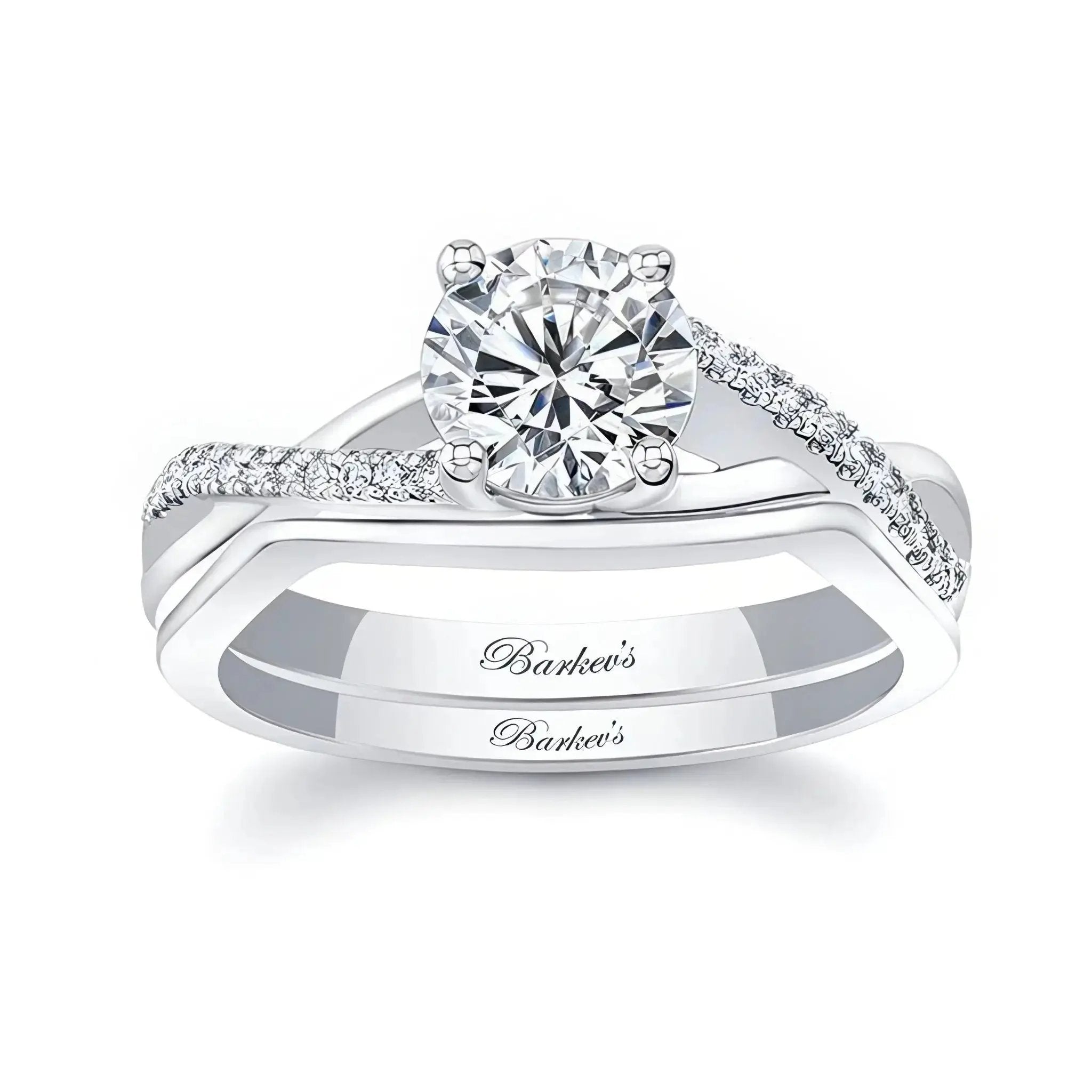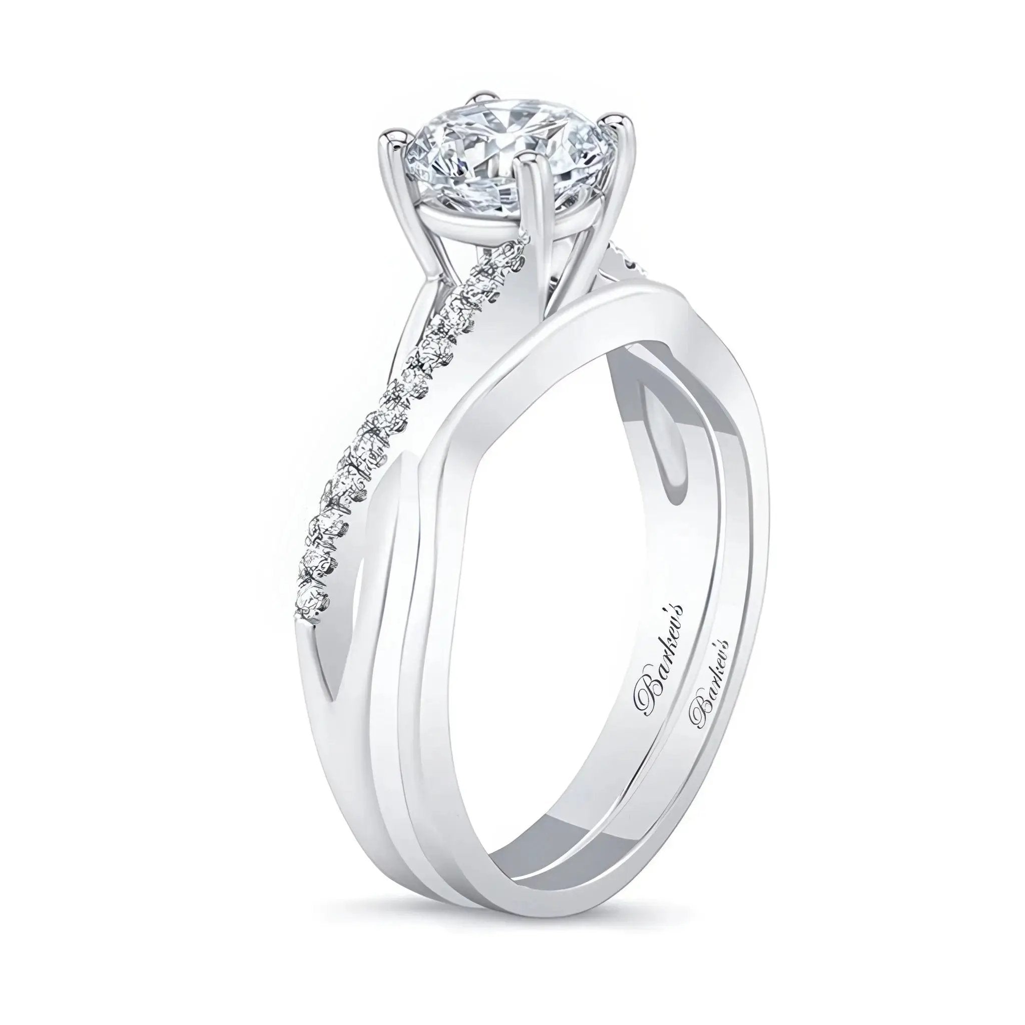 This stunning simple diamond bridal set features a prong set round center with intertwining shoulders adorned with shared prong set diamond melees. Comes with a matching wedding band.
