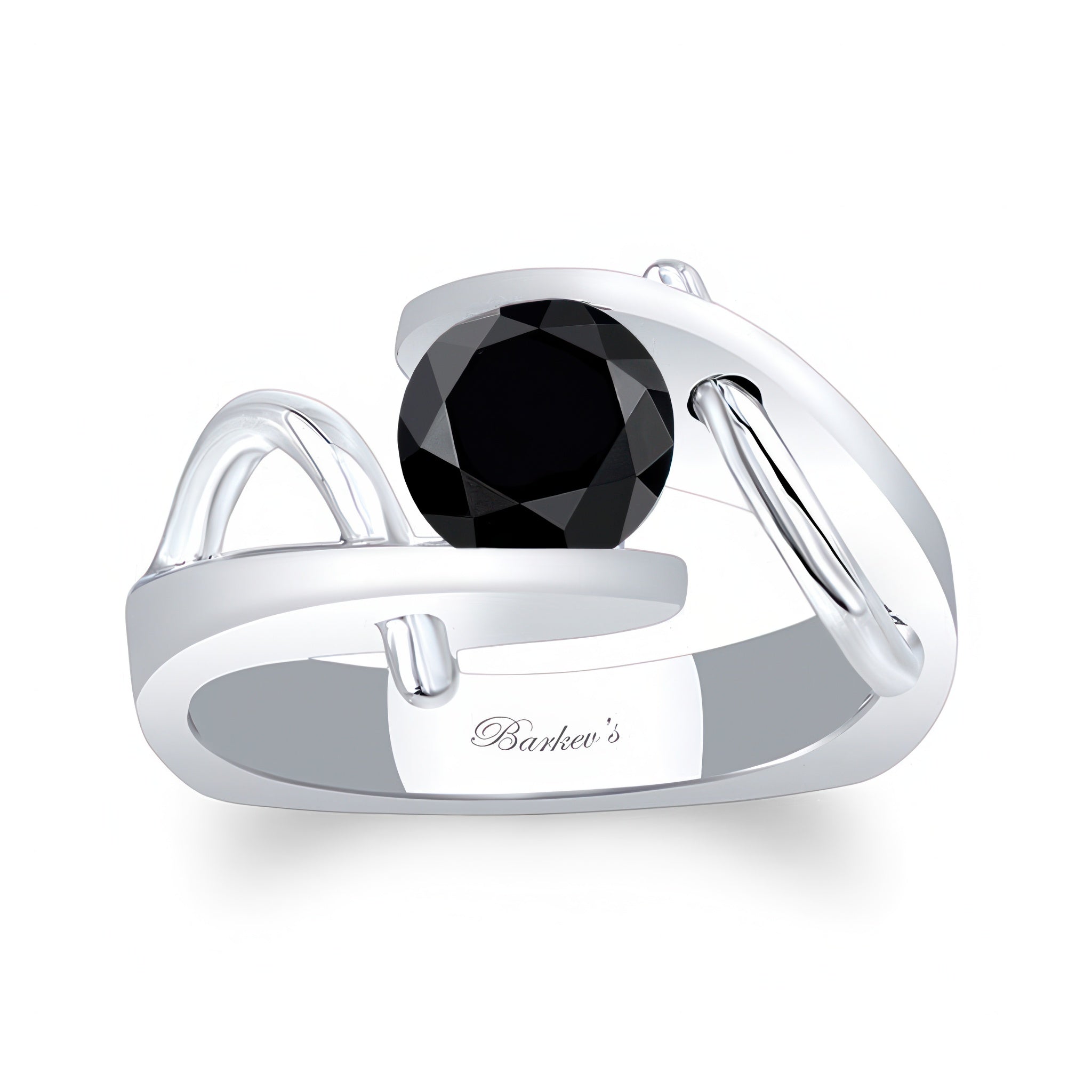 This solitaire channel set black diamond ring features a round center with bright polished shoulders adorned with two wire trims curving though the shank on both sides for a dramatic artistic flare.