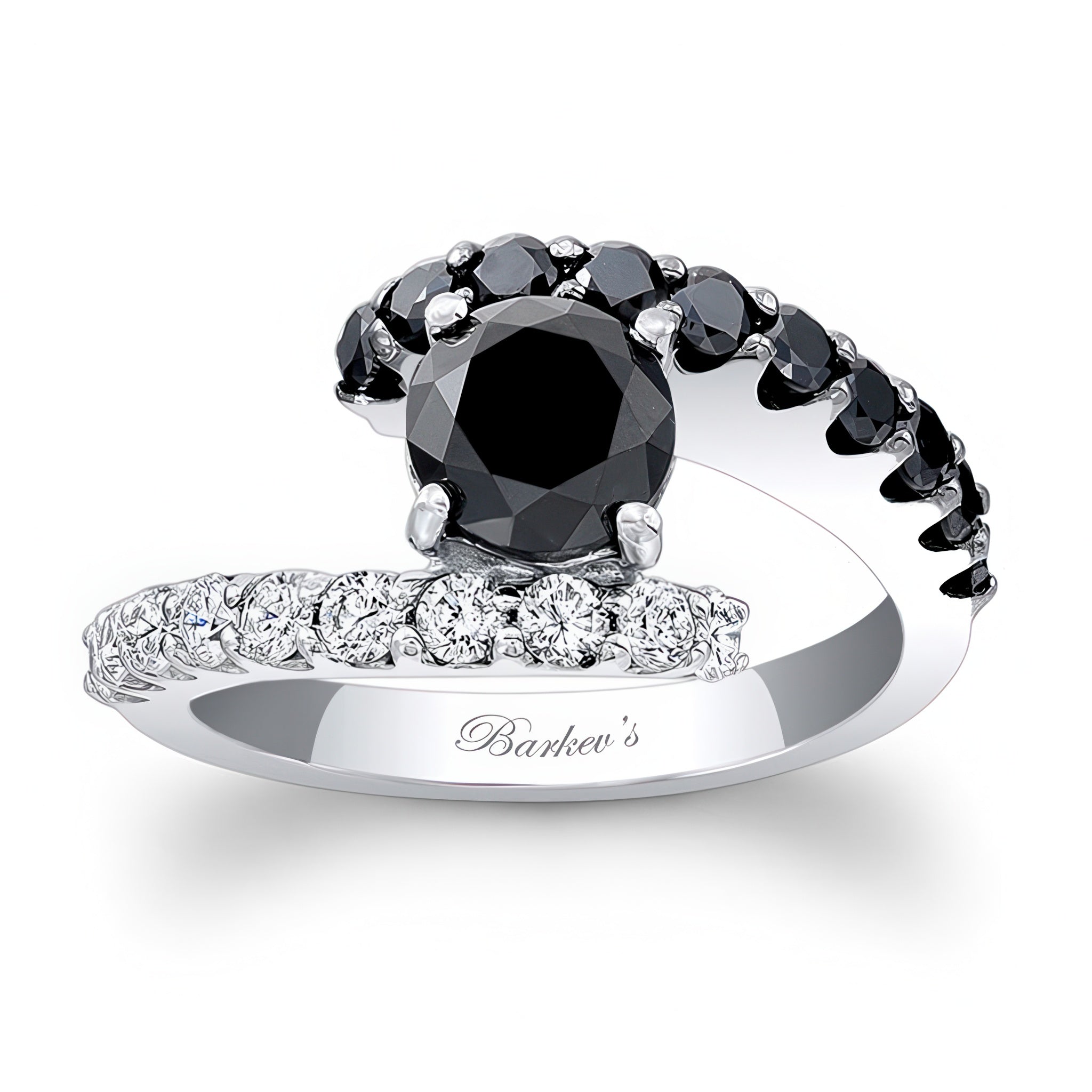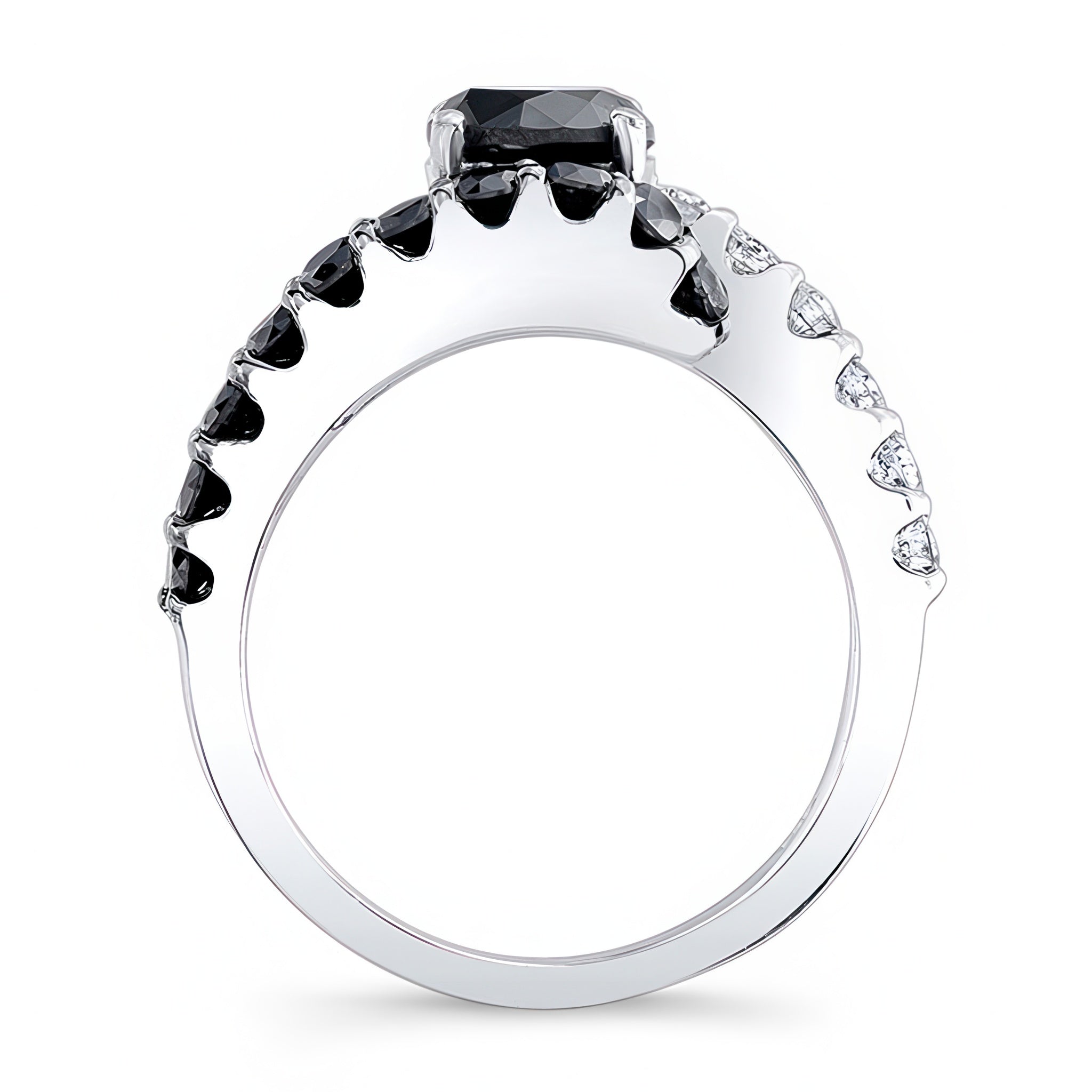This split band black diamond engagement ring features a split shank with a prong set round center and shared prong set black and white diamonds on the shoulders for a dramatic effect.