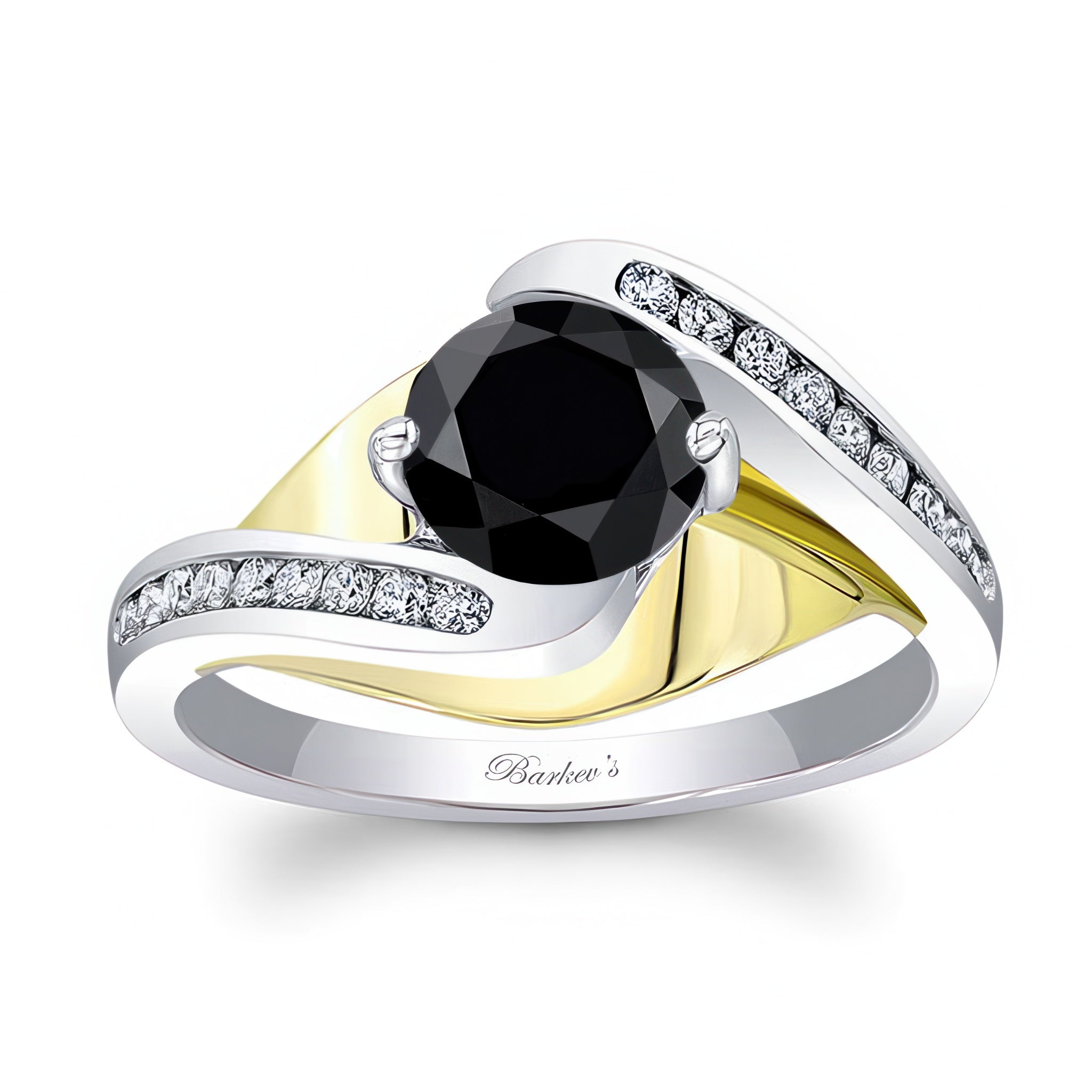 This split shank cathedral black and white diamond engagement ring features shoulders that rise up and taper towards the round center, with diamonds adorning the shank and a bright polished gallery adding to its modern contemporary feel.
