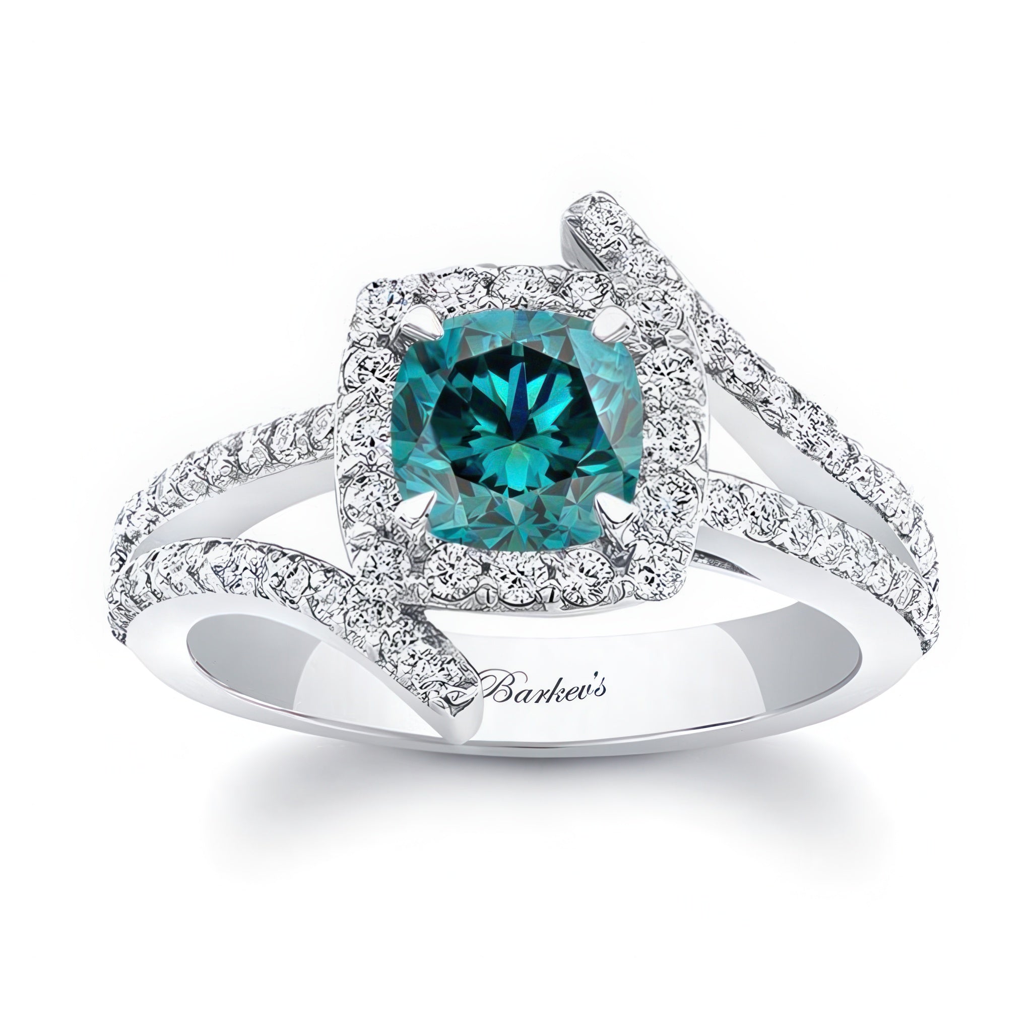 Split Shank Cushion Cut Blue And White Diamond Halo Ring