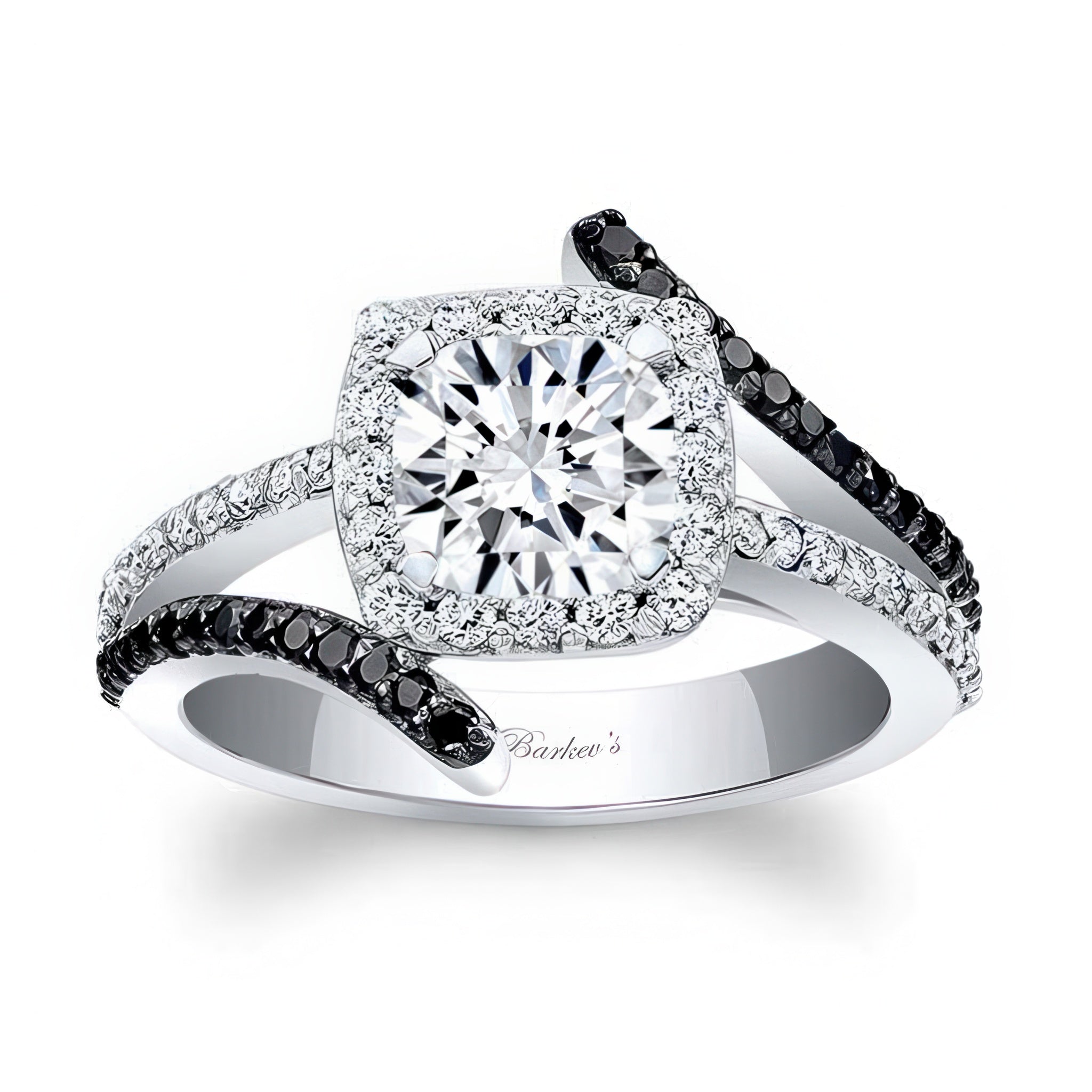 This split shank cushion cut moissanite halo ring with black diamonds features a prong set cushion center with a diamond halo and a split shank adorned with shared prong set black and white diamonds for a touch of sophistication.