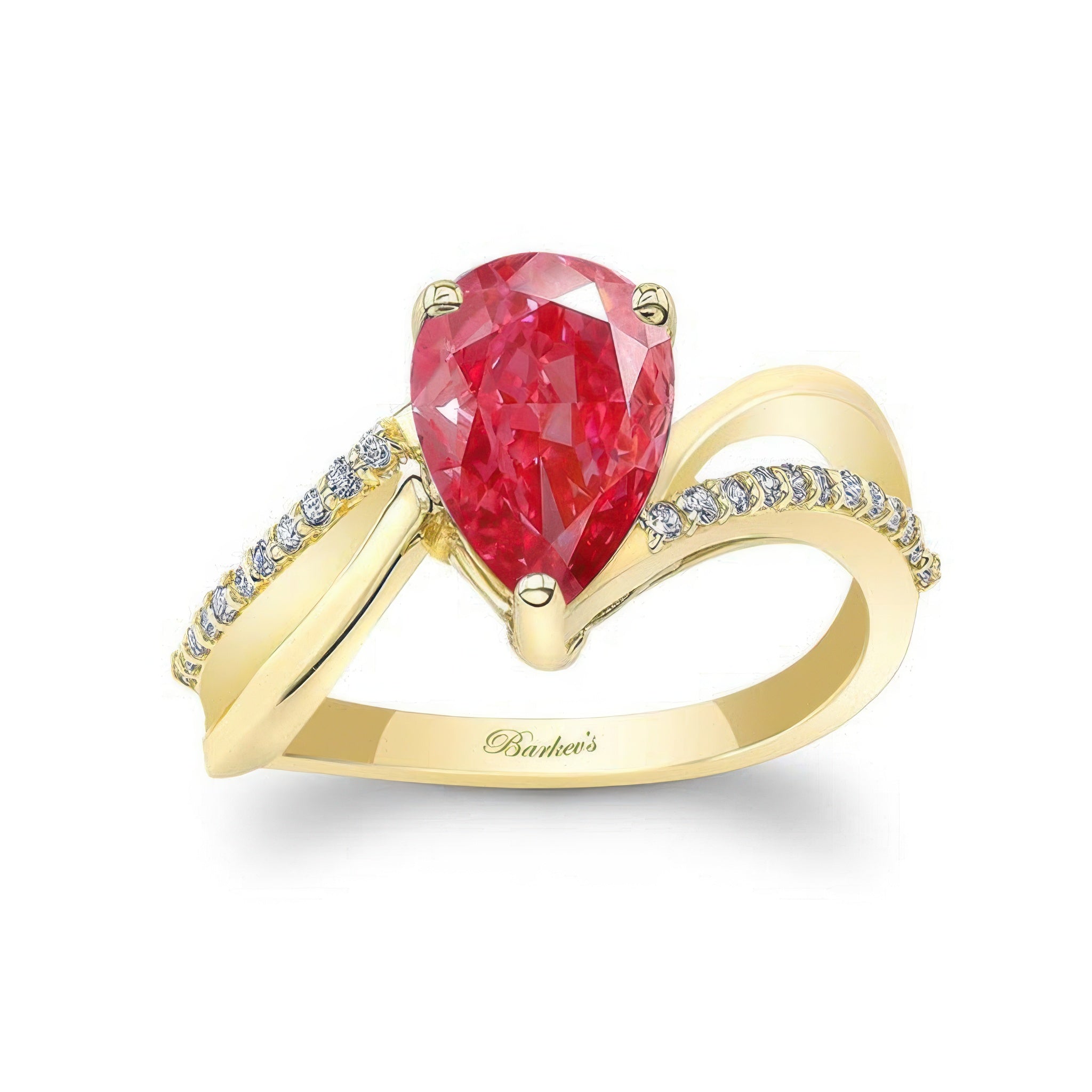 This split shank pear lab grown pink diamond ring features a center glorified by two graceful swirls, one of which is decorated by a row of prong set diamonds adding the final touch to its overall glamorous effect.