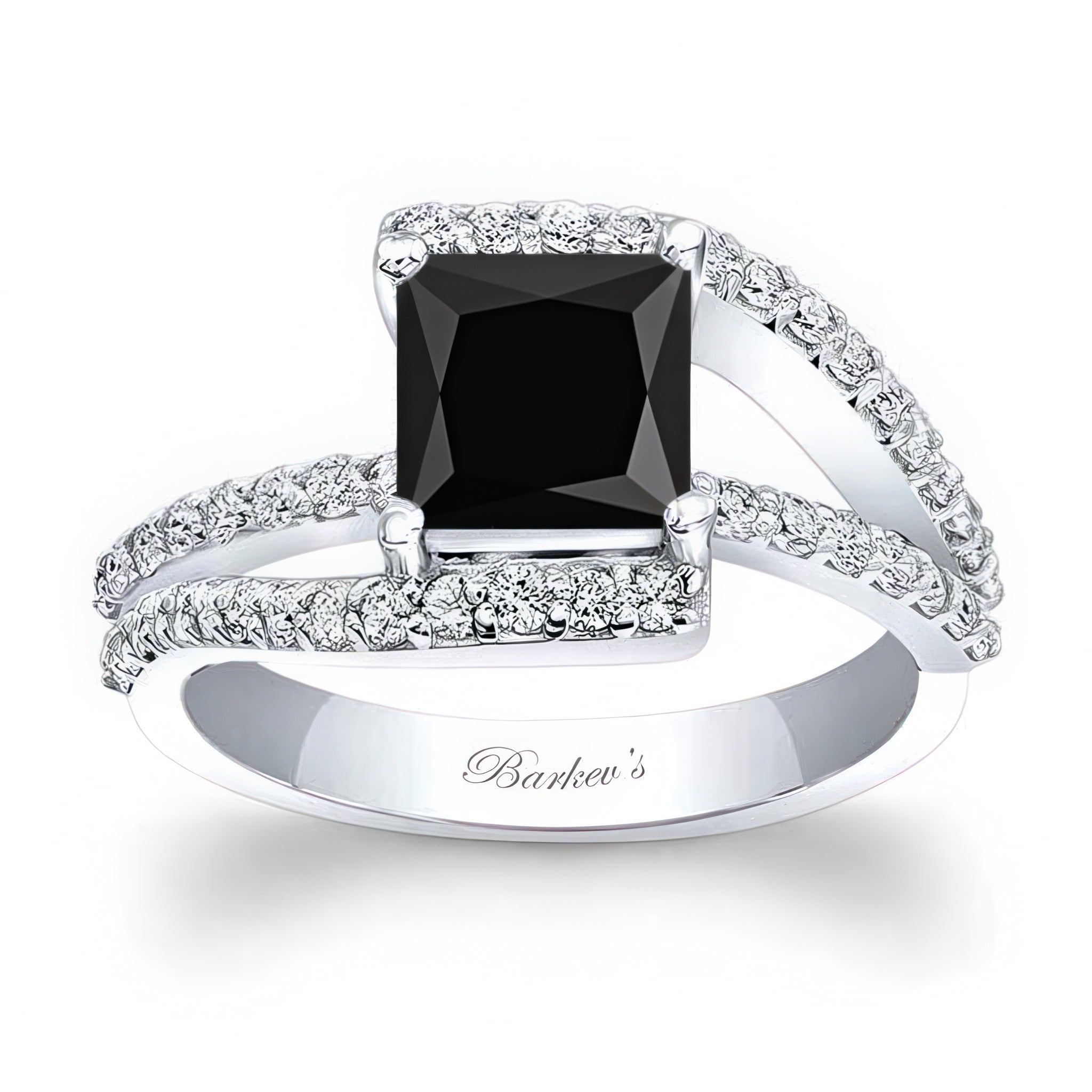 This split shank princess cut black and white diamond ring features a prong set center with shared prong diamonds on the shank, shoulders and bridge for an added touch of elegance.