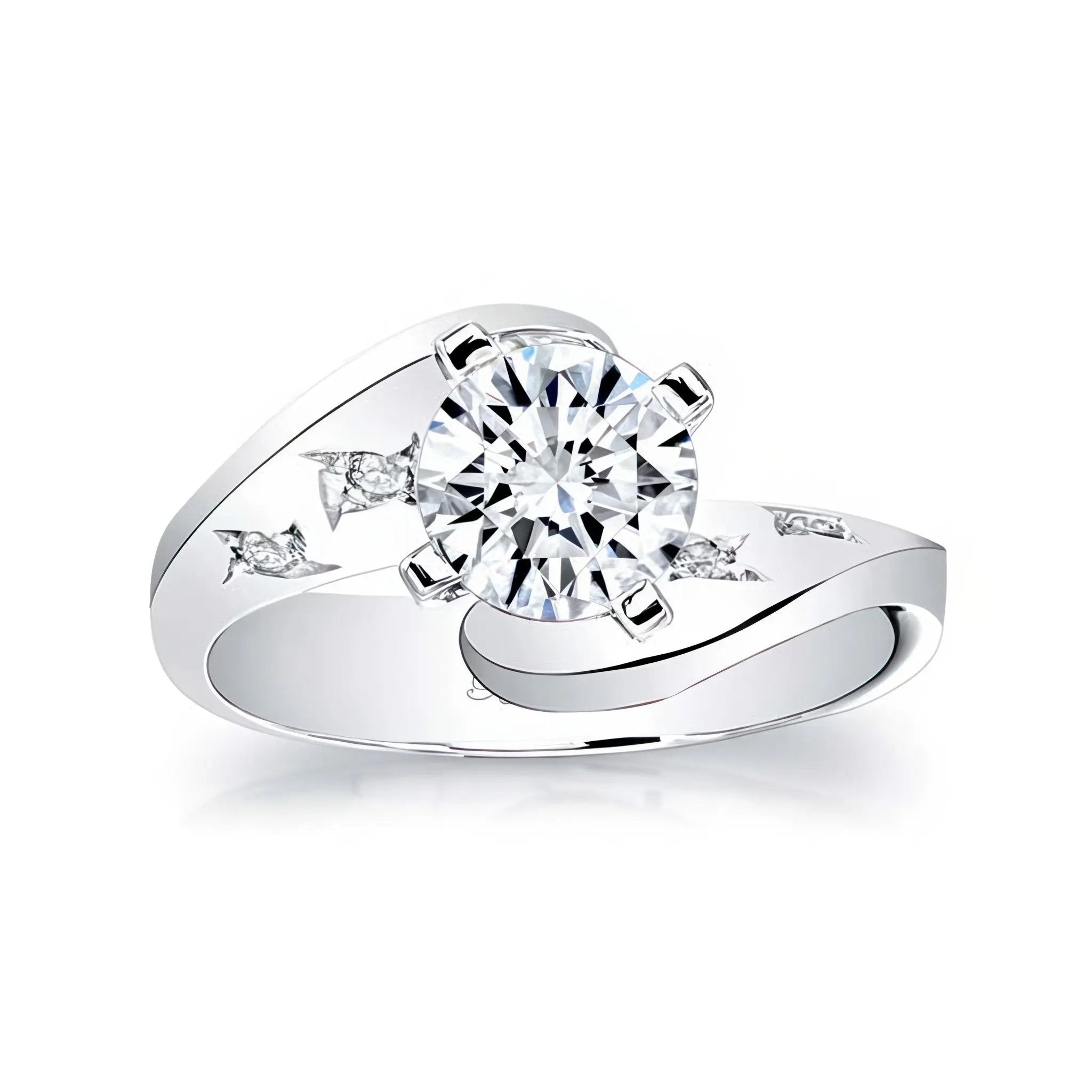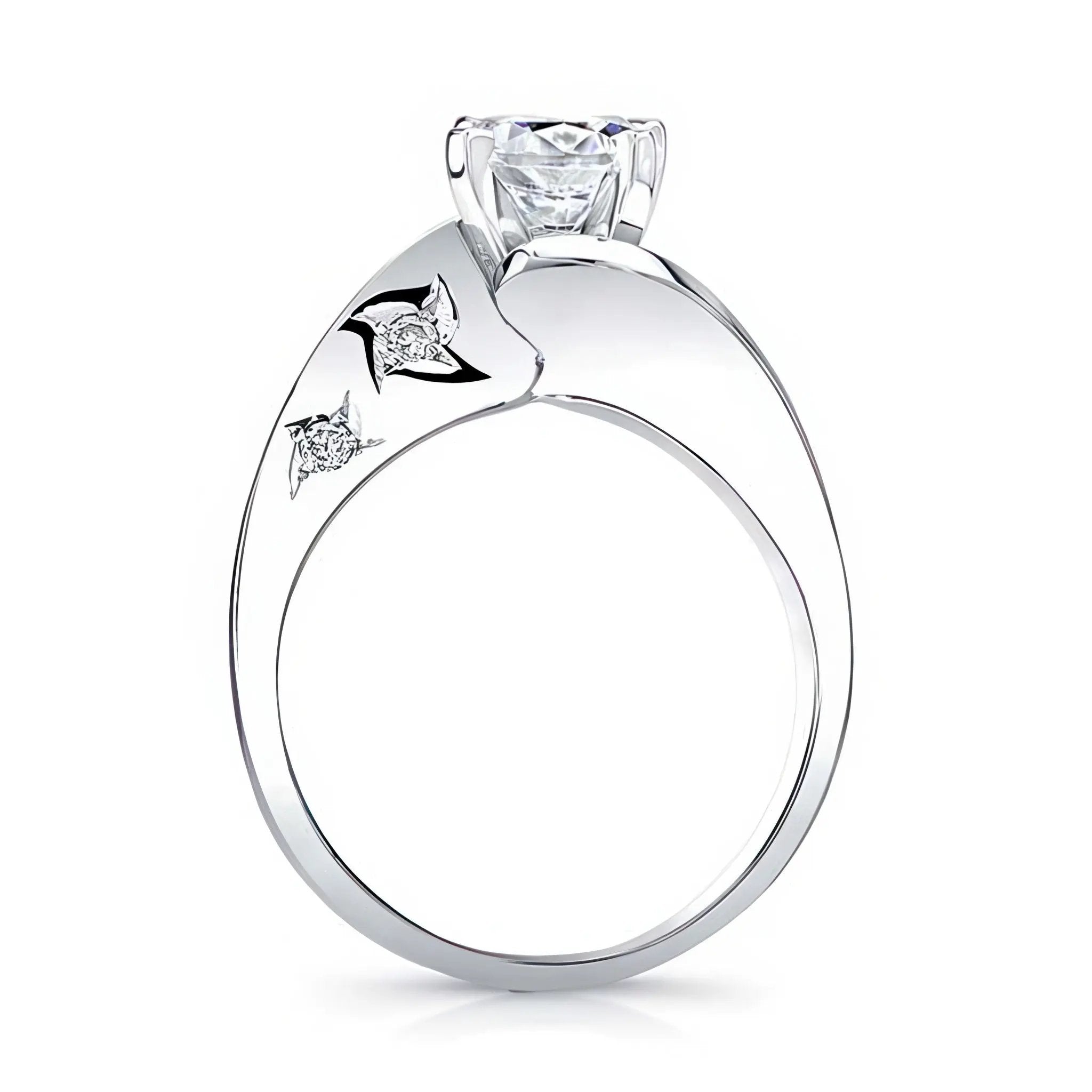 This split shank starnish moissanite engagement ring sports a prong set round center with our exclusive starburst set diamonds gracing the shoulders.