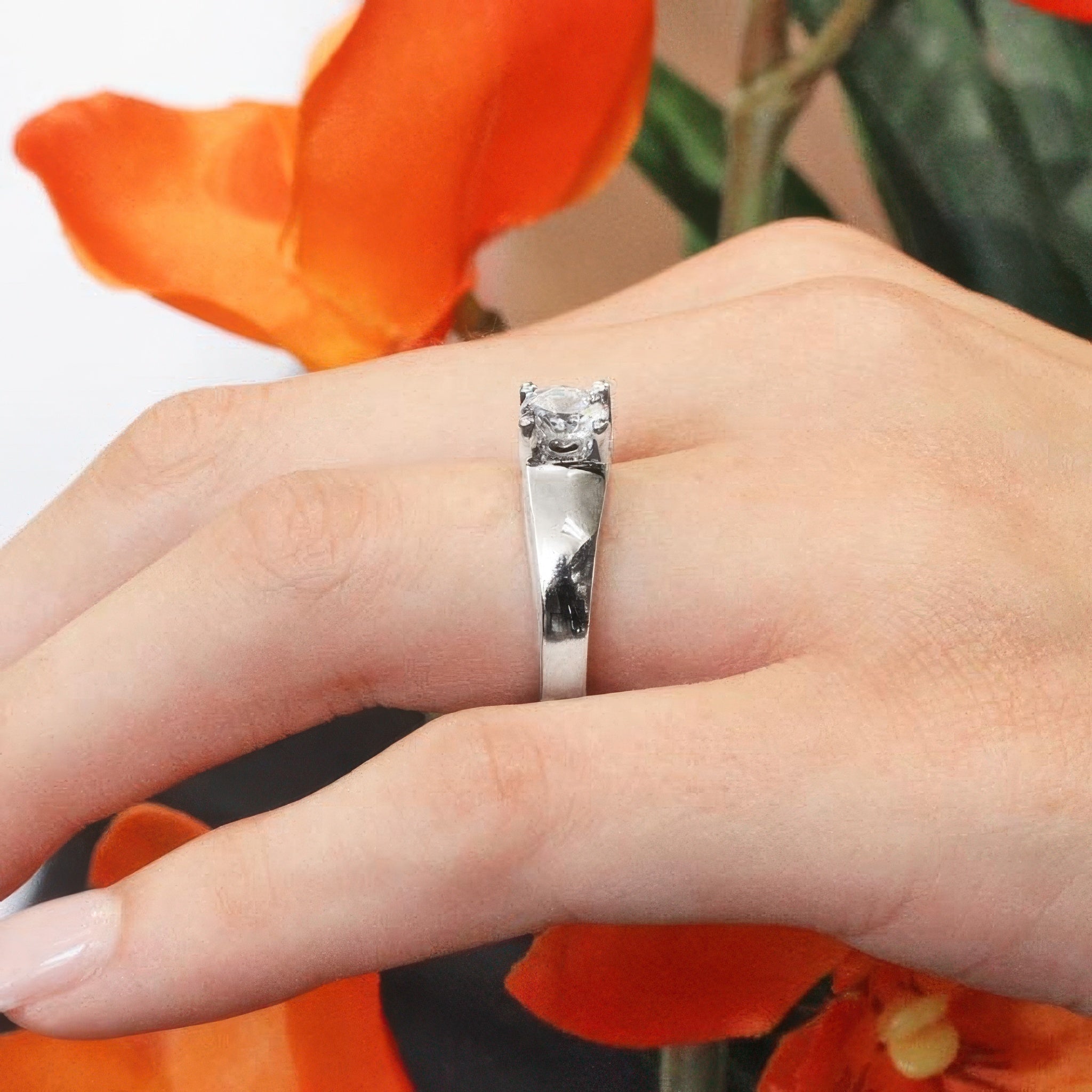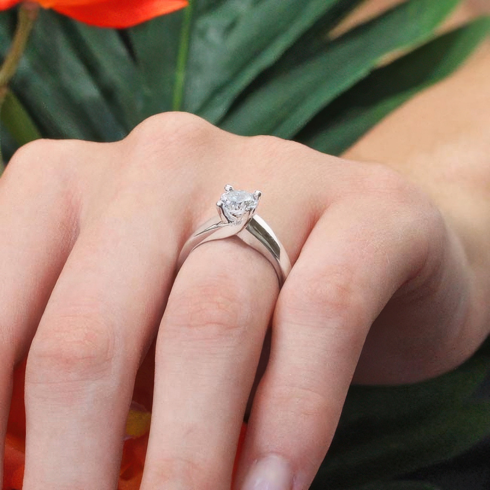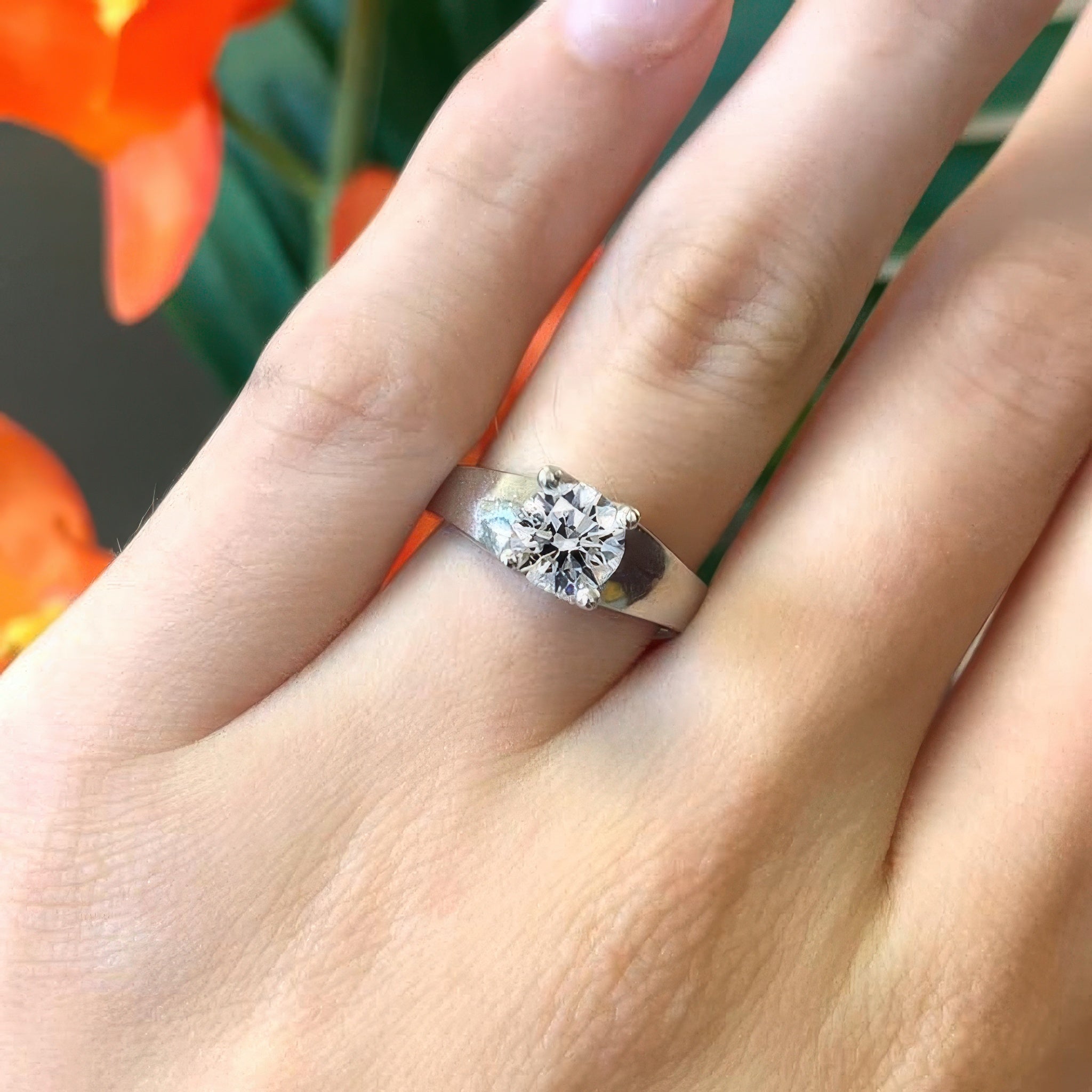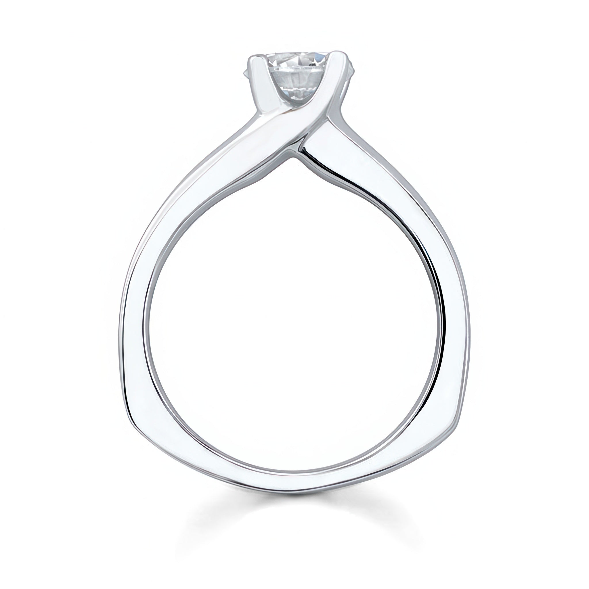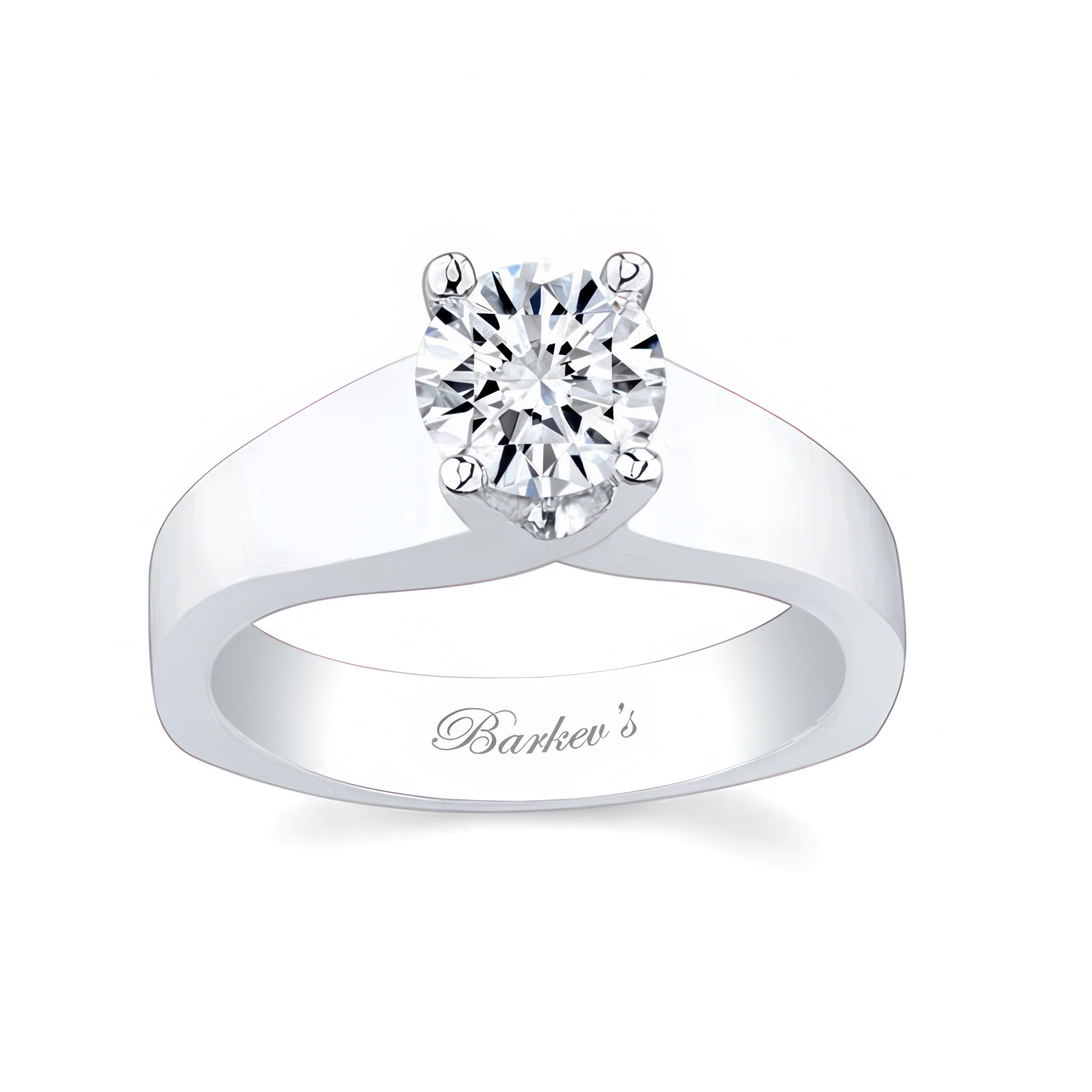 This square shank moissanite solitaire ring features a prong set round center with wide flat shoulders and a tapering square shank.