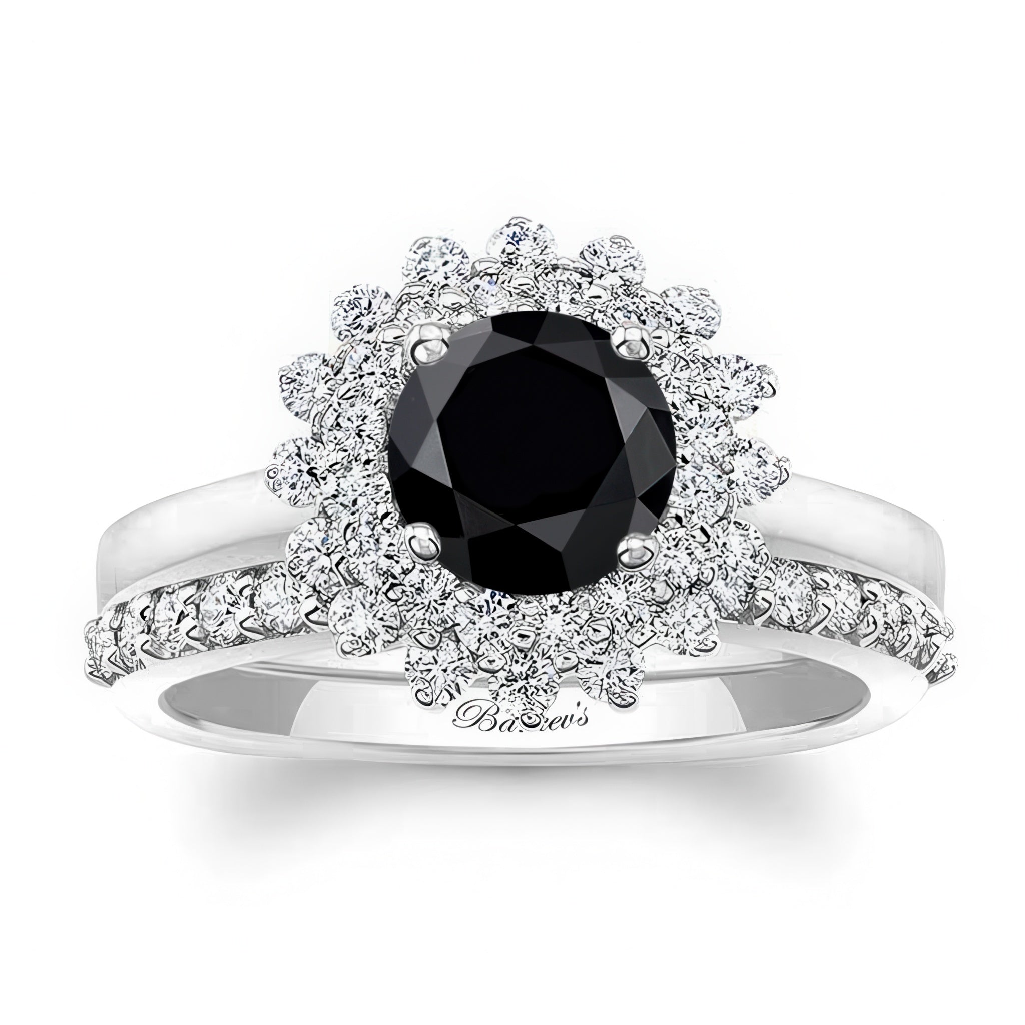 An exquisite starburst black and white diamond bridal set featuring an engagement ring with a prong set round center encircled with two diamond halos with the outer one giving the illusion of a burst pattern. The final touch is visible on the profile view with a dainty polished shank featuring a simple motif design. A shared prong set wedding band snuggles up close on the side for a stunning look.