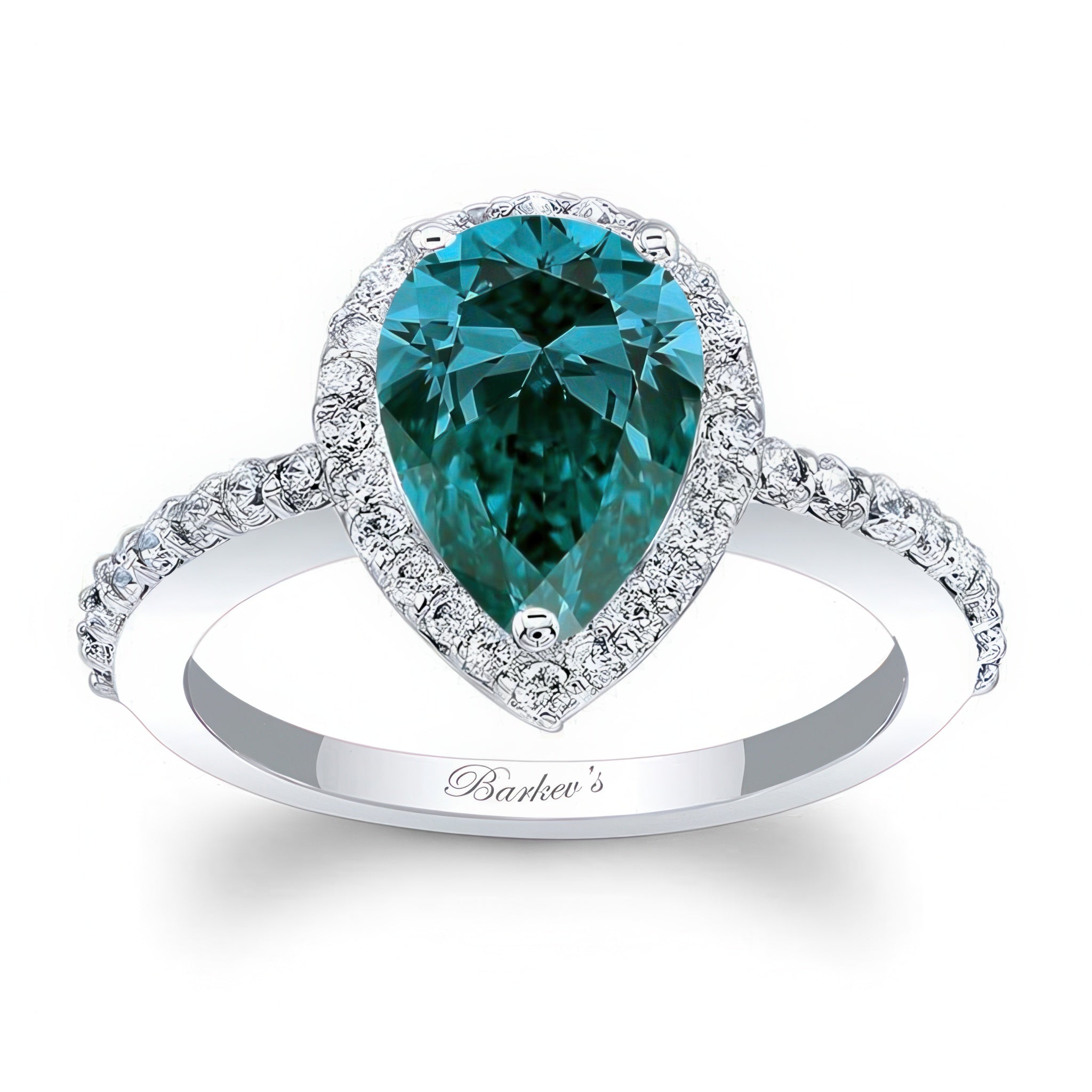 A classic teardrop blue and white diamond ring featuring a prong set pear shape 1 carat center encircled with shared prong set diamonds and a dainty shank adorned with diamonds for an elegant and sophisticated look.