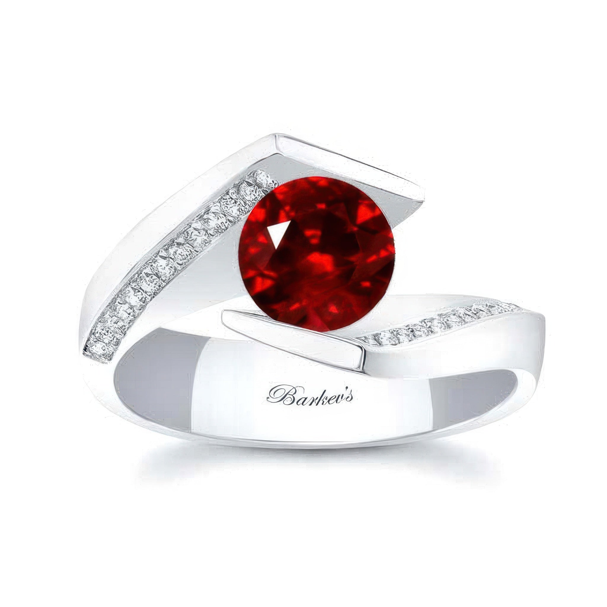 This stunning tension setting lab grown ruby and diamond ring is decorated by channel set diamonds on both sides of the shank, the ring gracefully twists whilst embracing the elevated center in a tension setting.