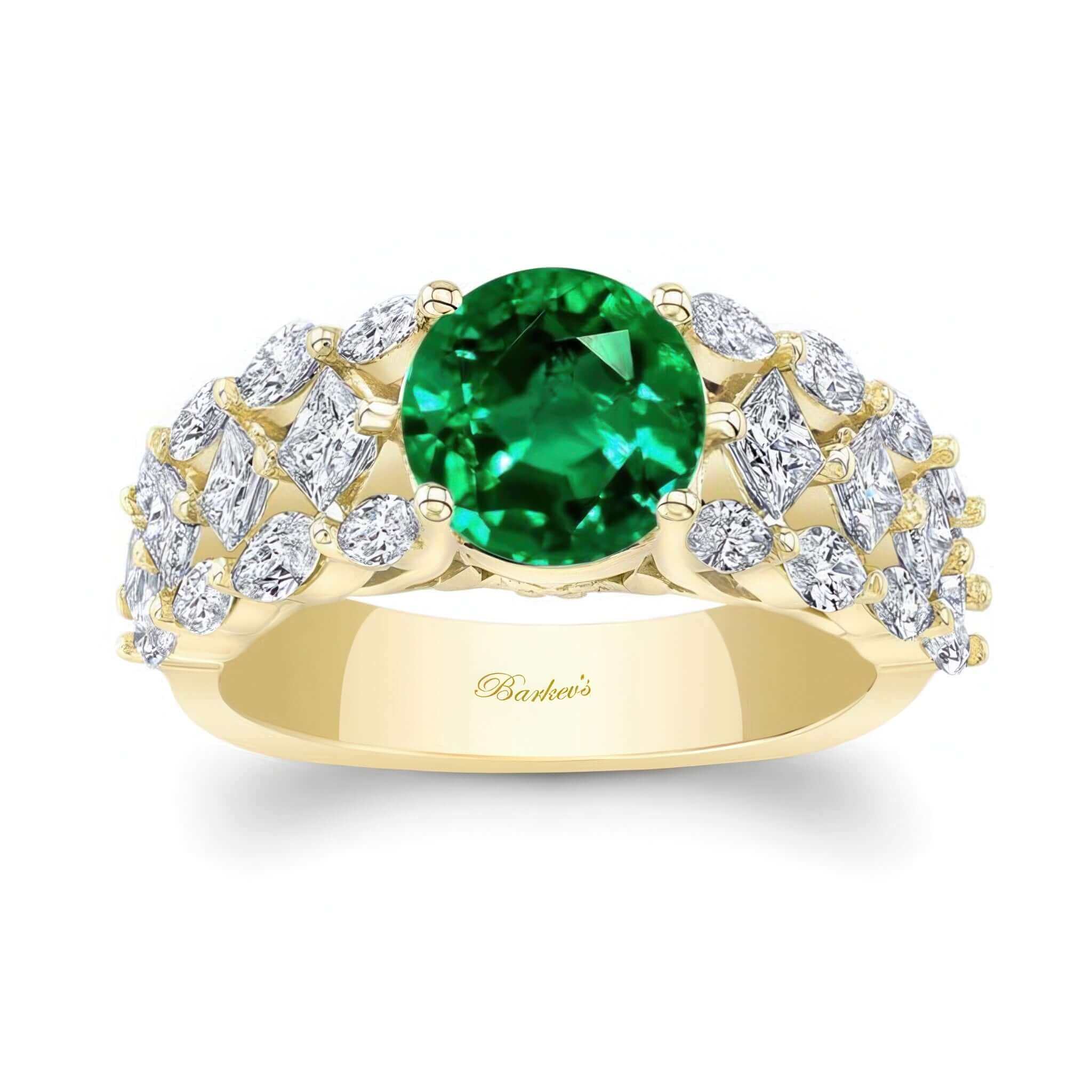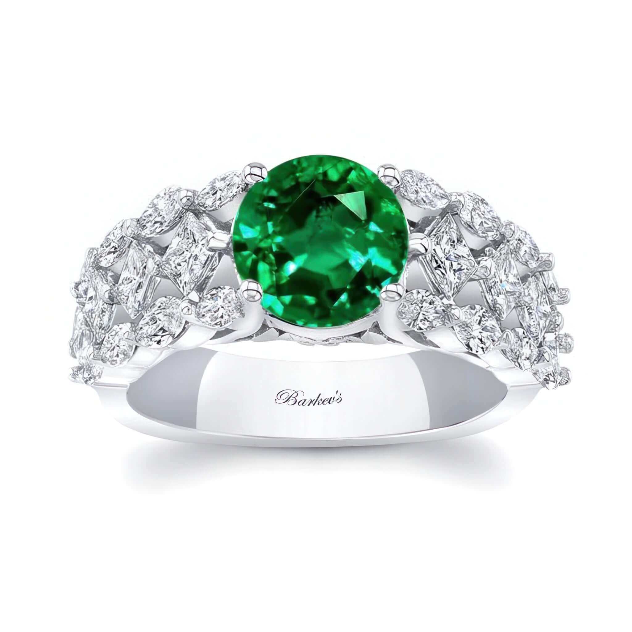 A bold three row emerald and diamond ring lined with stunning pave set marquise and princess cut diamonds around the shank. The ring is topped with a shimmering round center featuring a surprise peekaboo flower design.