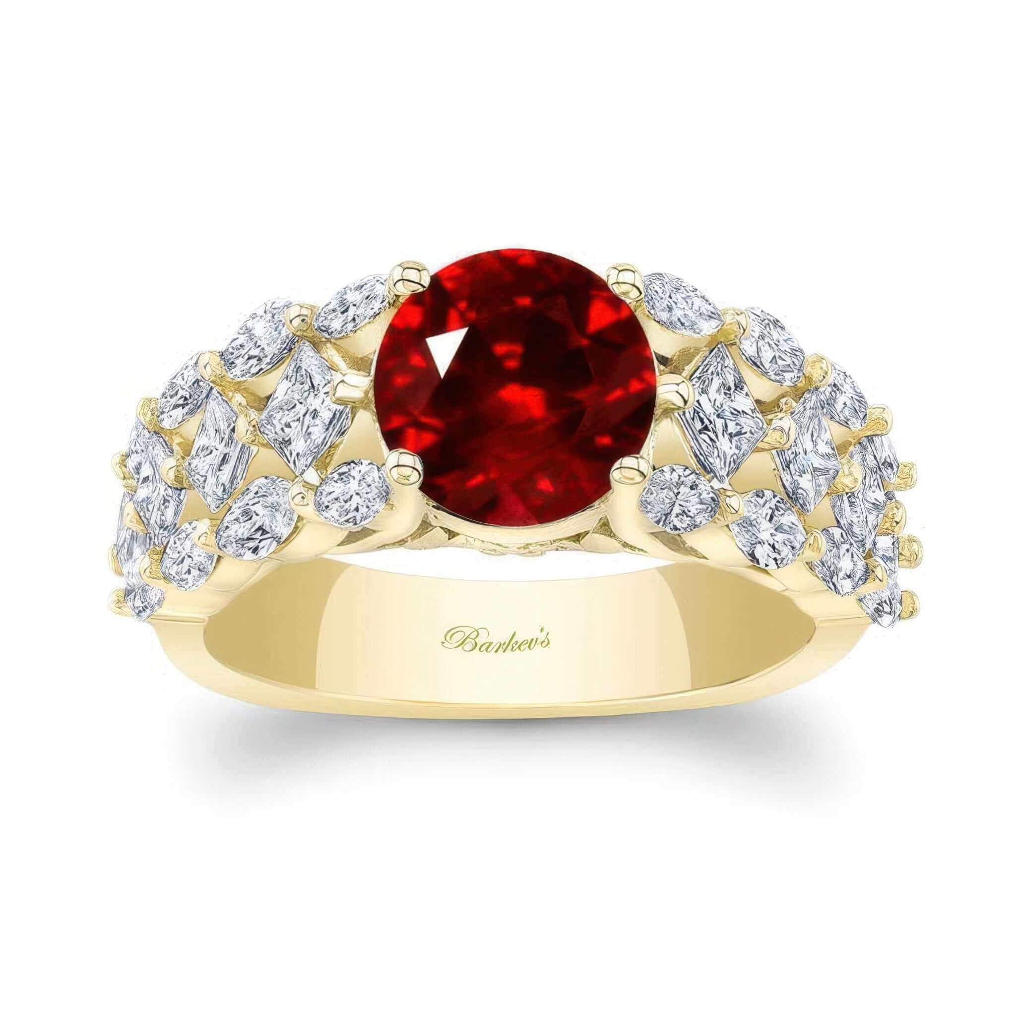 A bold three row ruby and diamond ring lined with stunning pave set marquise and princess cut diamonds around the shank. The ring is topped with a shimmering round center featuring a surprise peekaboo flower design.