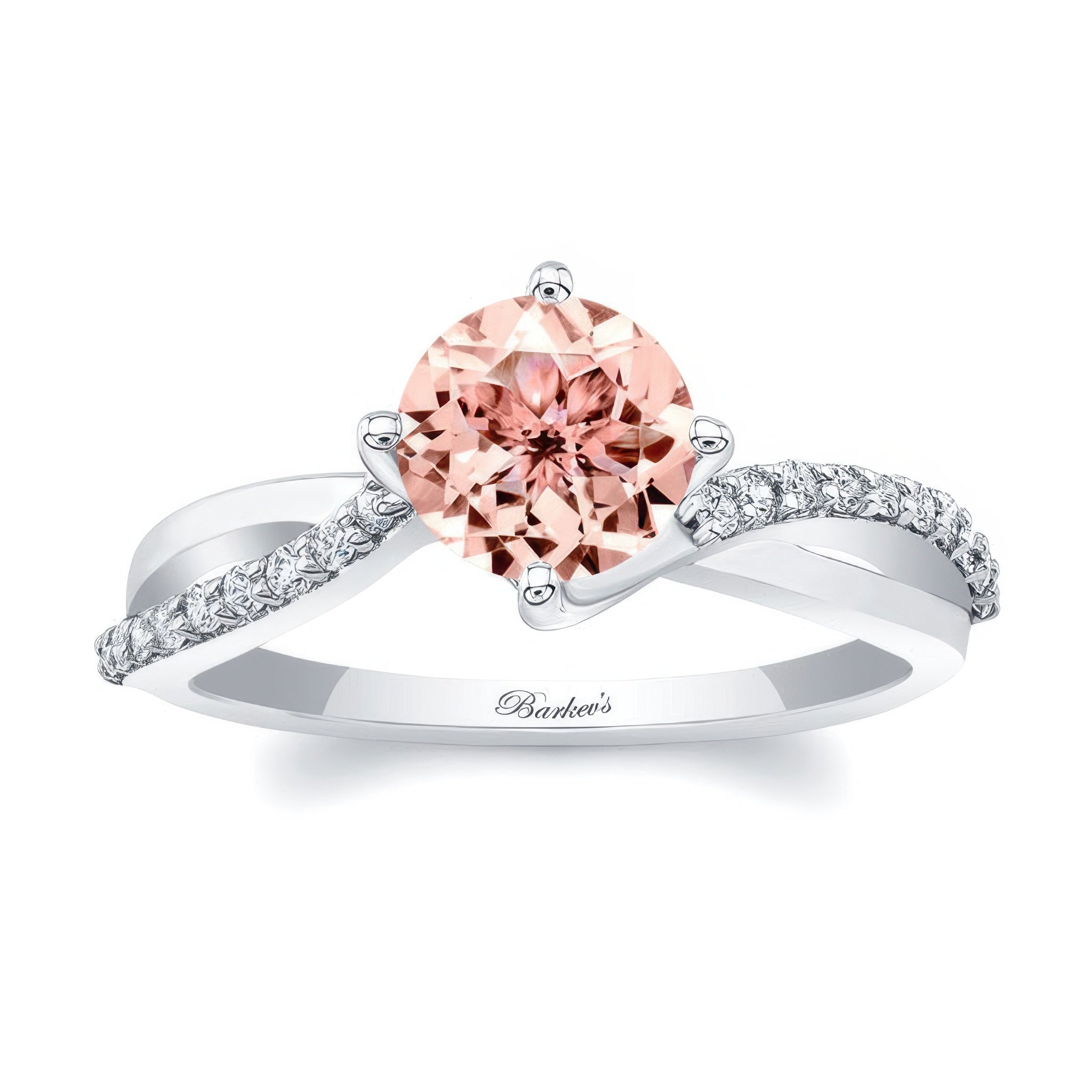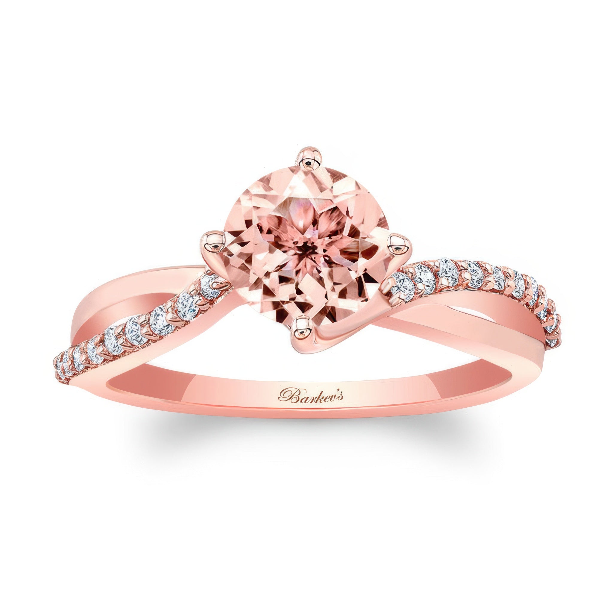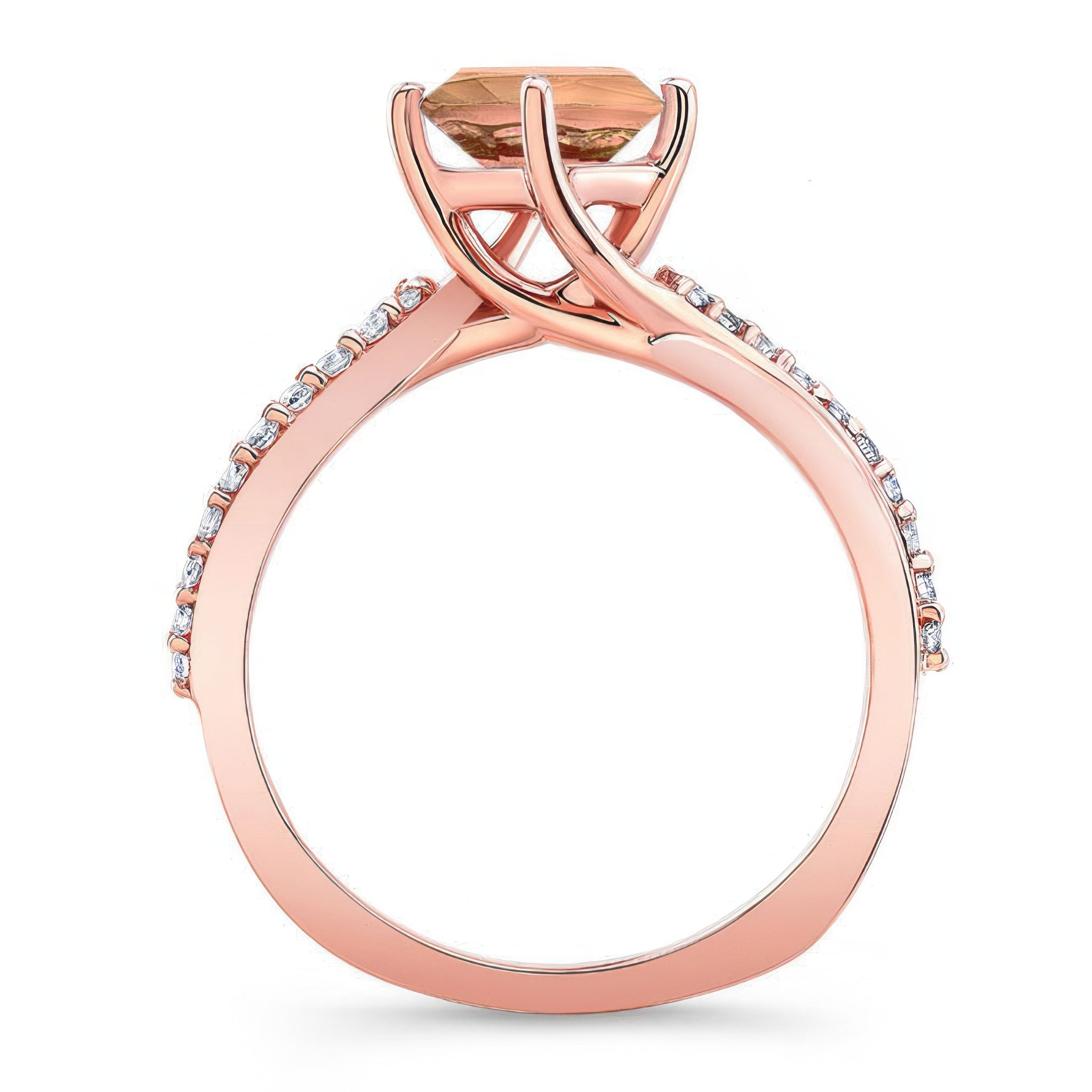 The twisting band gracefully curves upward, holding the round-cut morganite in an open-shoulder embrace that adds movement and lightness to the ring. Diamonds glimmer subtly along the band’s edges, enhancing the overall glow without overshadowing the centerpiece. The look is delicate but bold, romantic but modern.