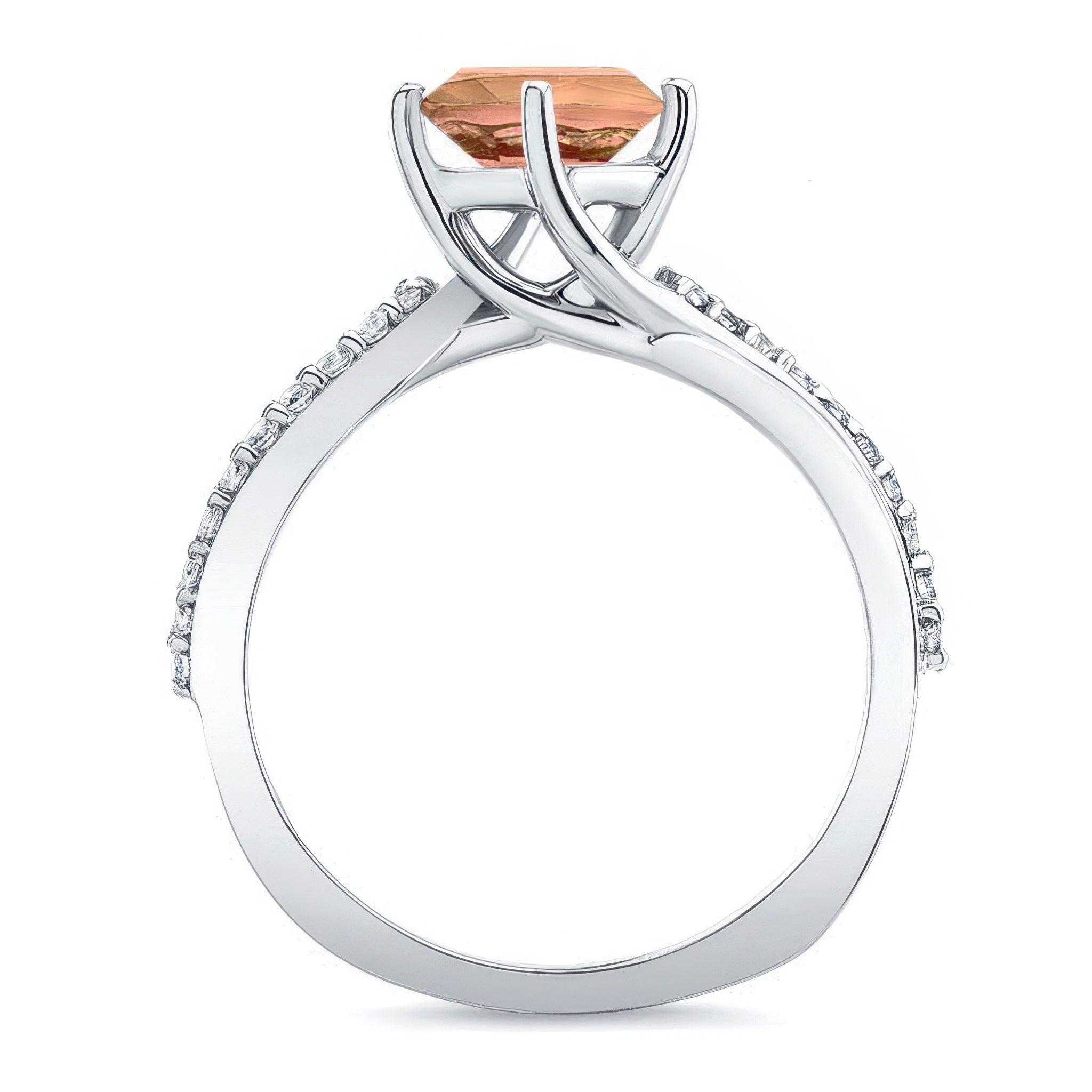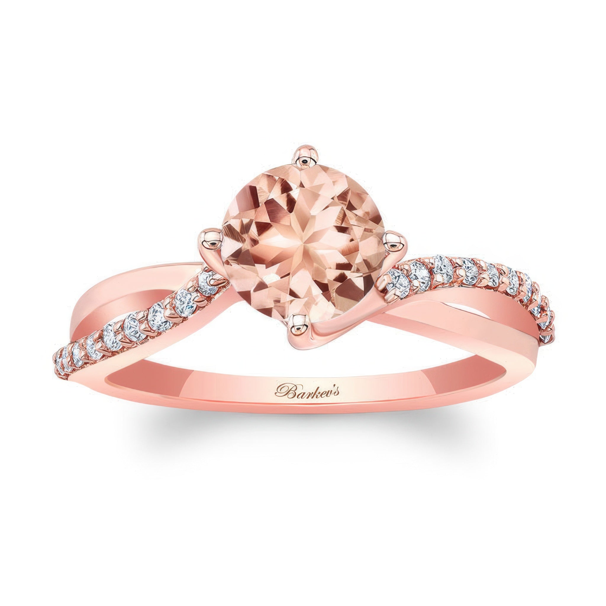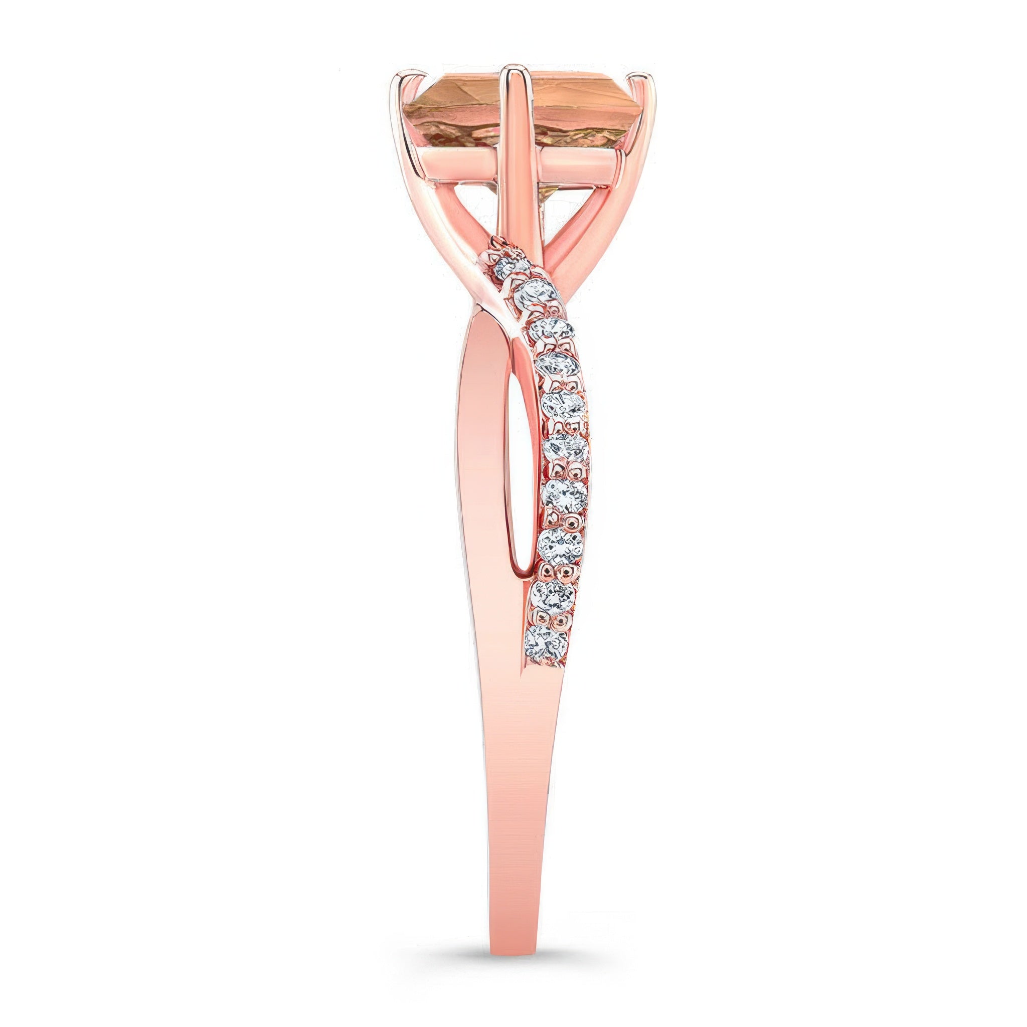 The twisting band gracefully curves upward, holding the round-cut morganite in an open-shoulder embrace that adds movement and lightness to the ring. Diamonds glimmer subtly along the band’s edges, enhancing the overall glow without overshadowing the centerpiece. The look is delicate but bold, romantic but modern.