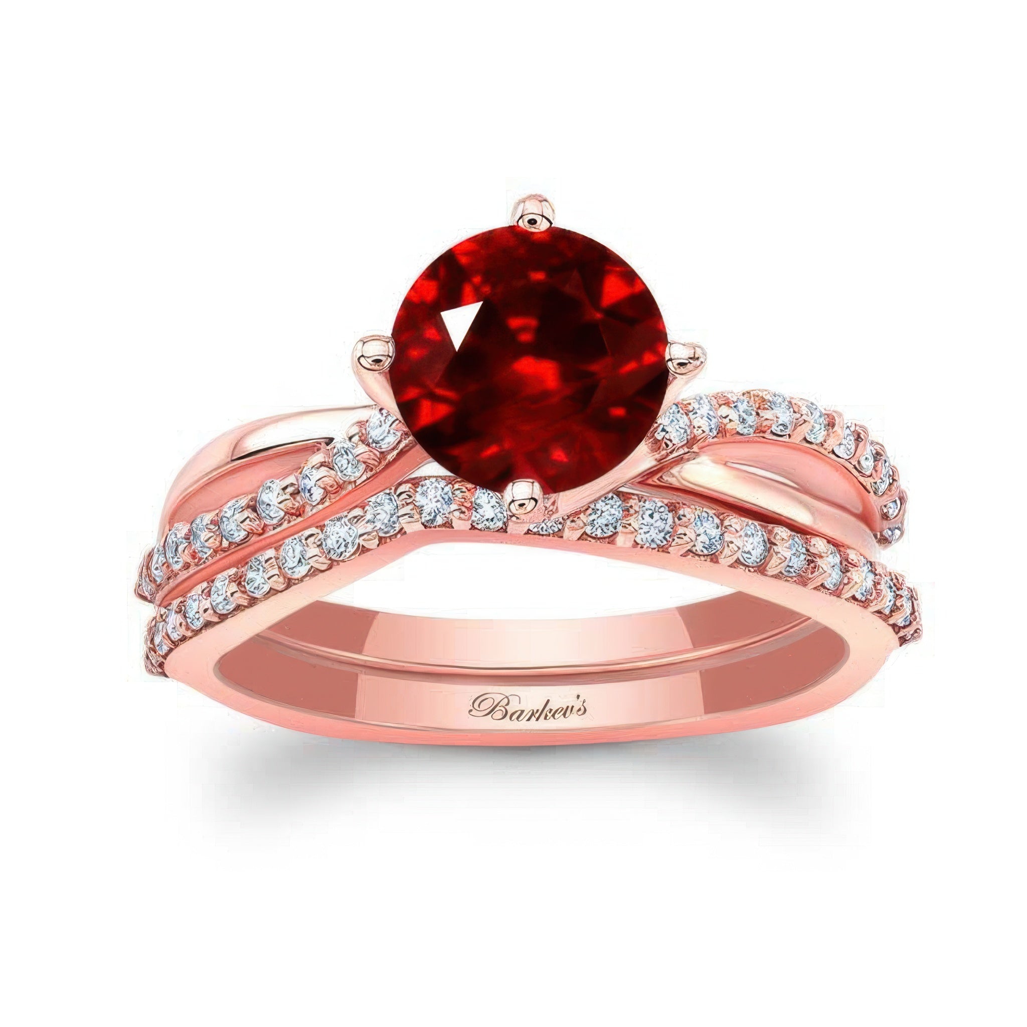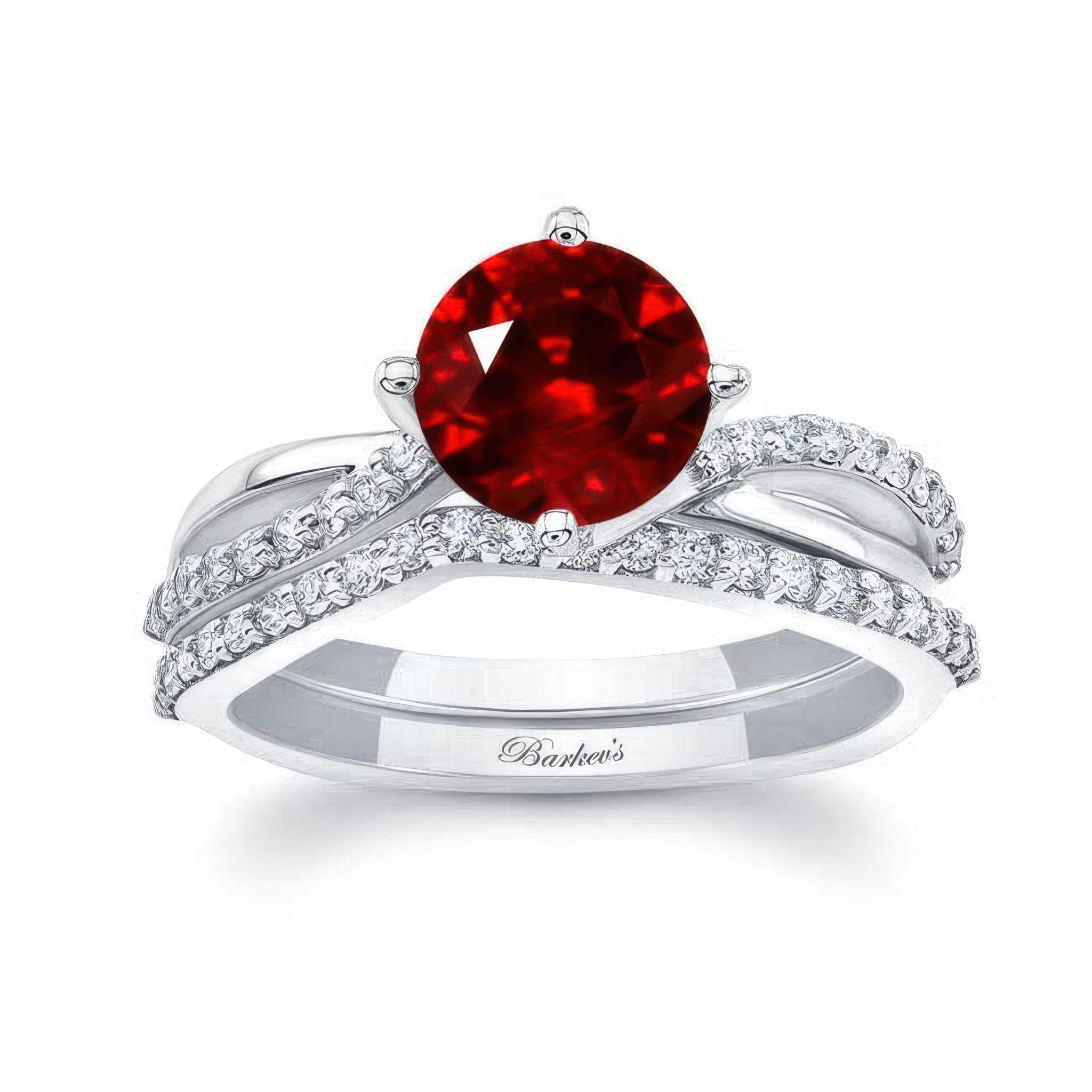 Shine in fiery red with our Twisted Ruby and Diamond Bridal Set. This dazzling duo begins with a vivid natural ruby engagement ring—a gemstone long associated with passion, courage, and enduring devotion. Its bold hue stands out against the elegant twist of the band and shimmering white diamond accents.