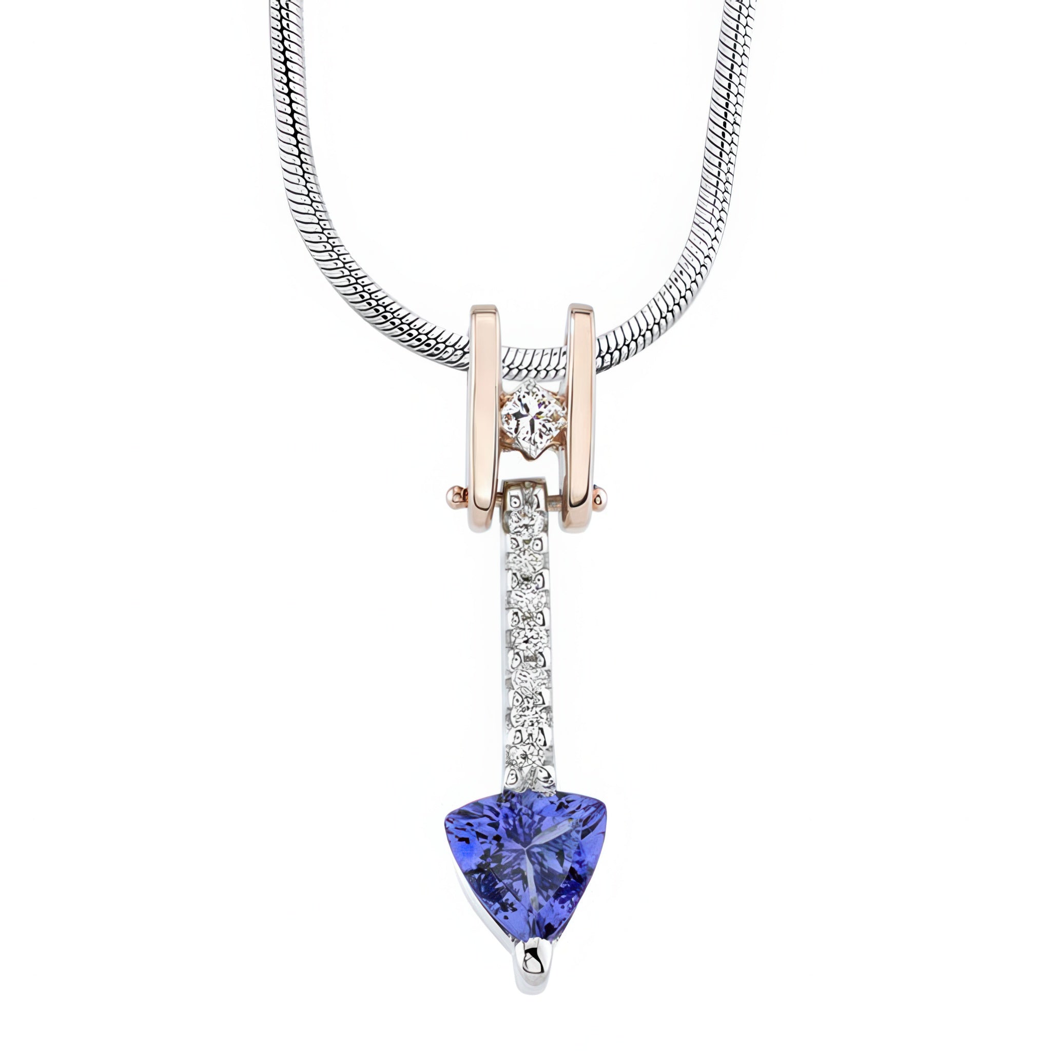 This stunning two tone tanzanite and diamond necklace features a channel set trillion cut tanzanite captured in the white gold shared prong set diamond center bar. A rose gold hinged bail sports a princess cut diamond, channel set on point, and captures the diamond and tanzanite bar at the bottom for an elegant necklace that swings on the chain.