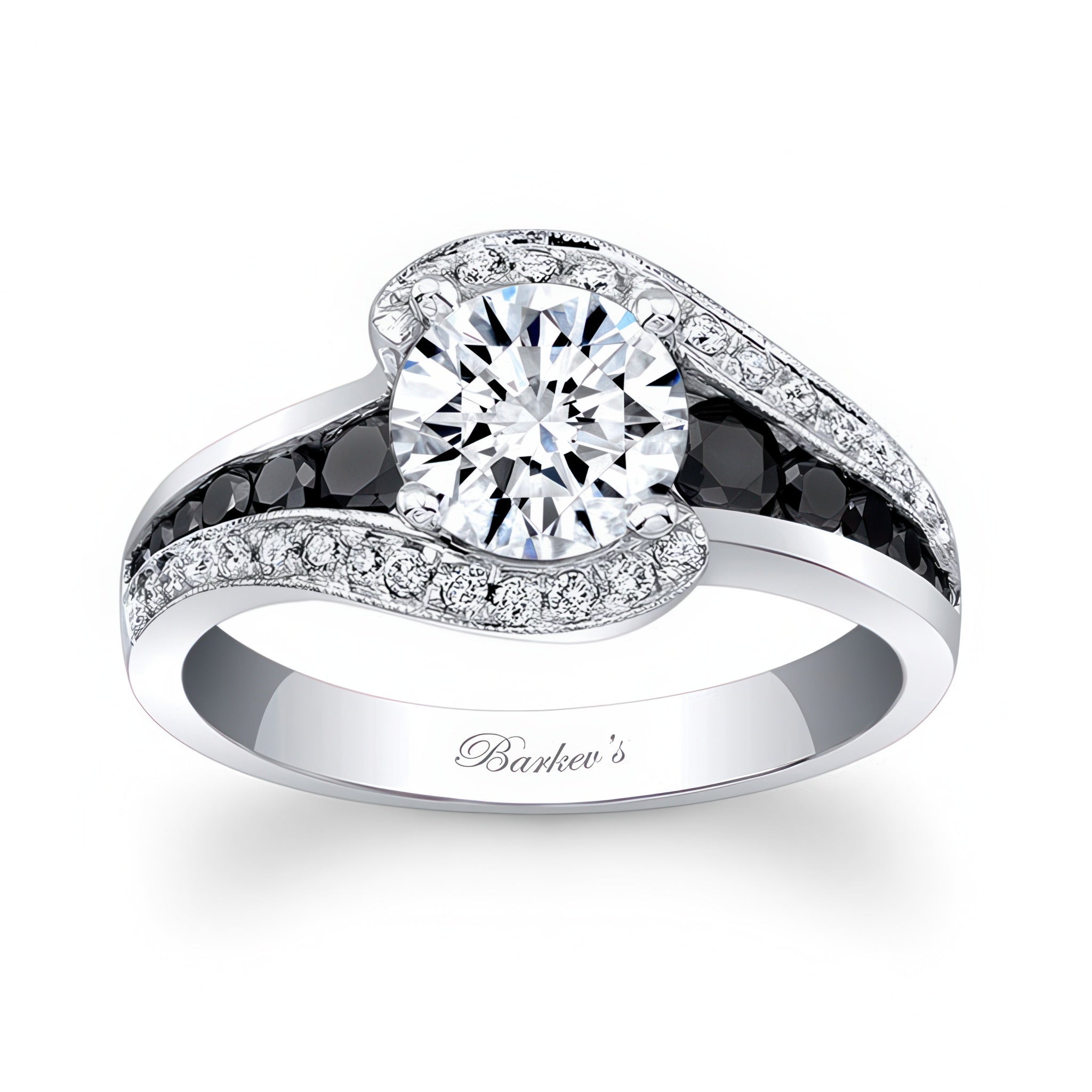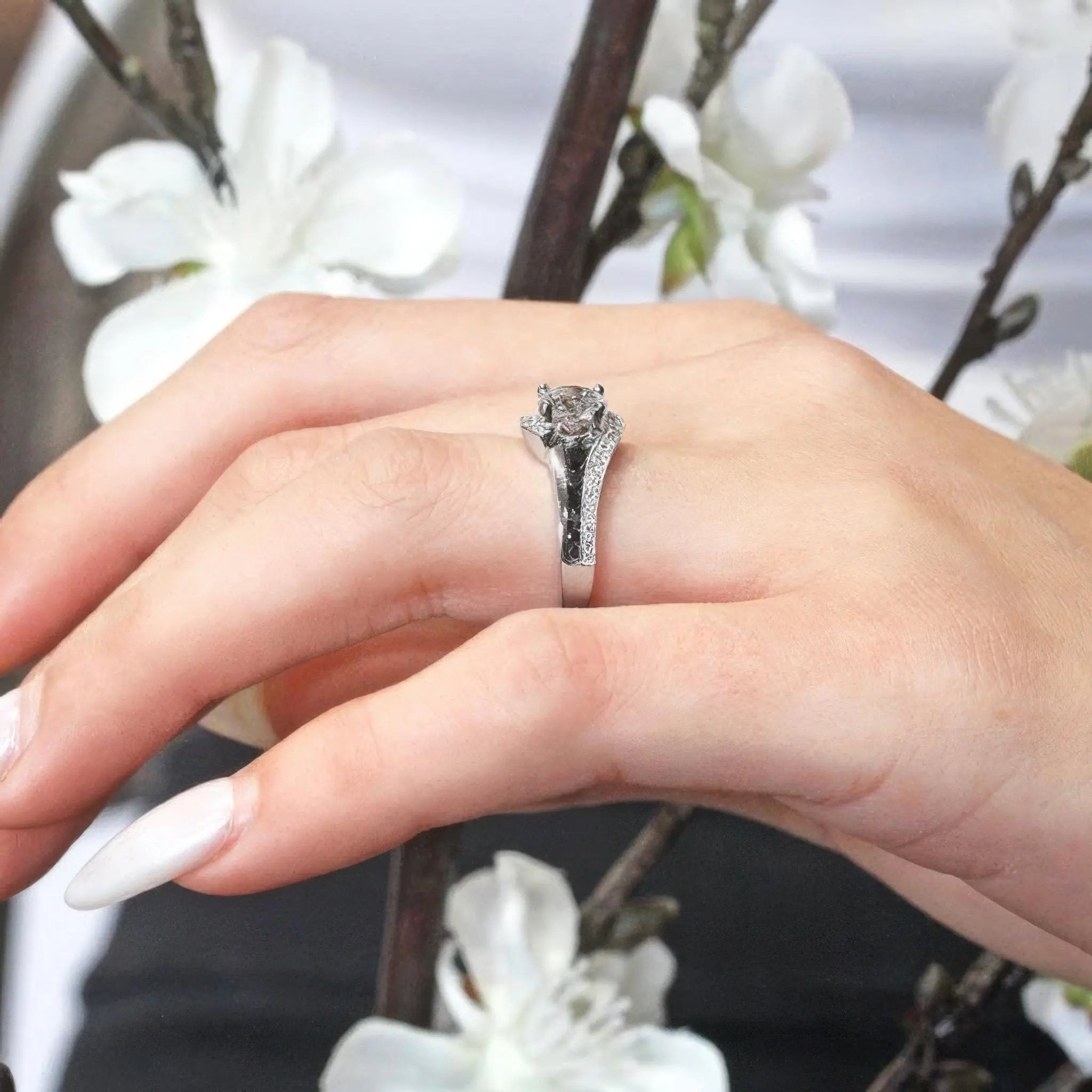 This unique black diamond accent engagement ring features a prong set round center. The shoulders split and curve up to the center with pave set diamonds, while channel set black diamonds grace the sides.