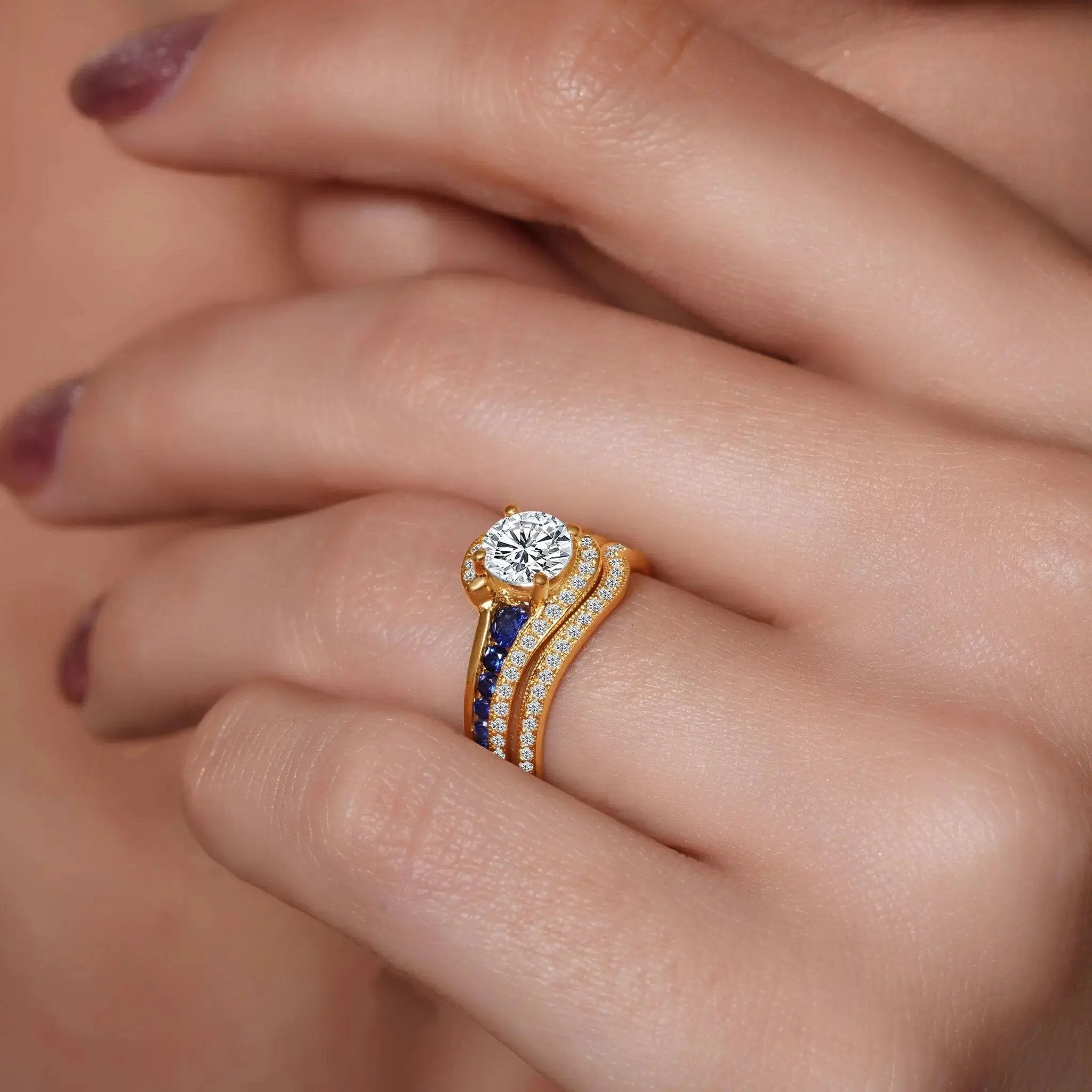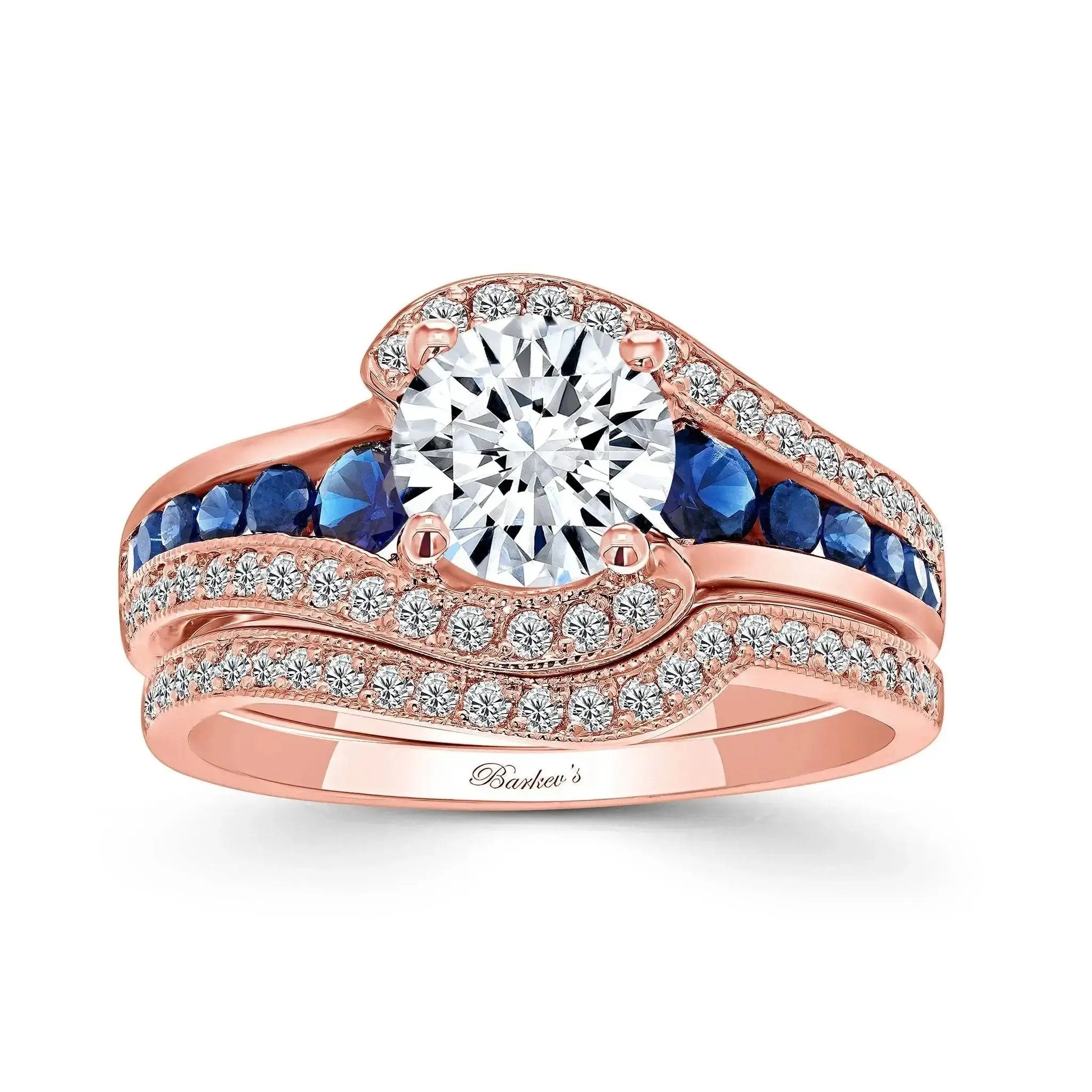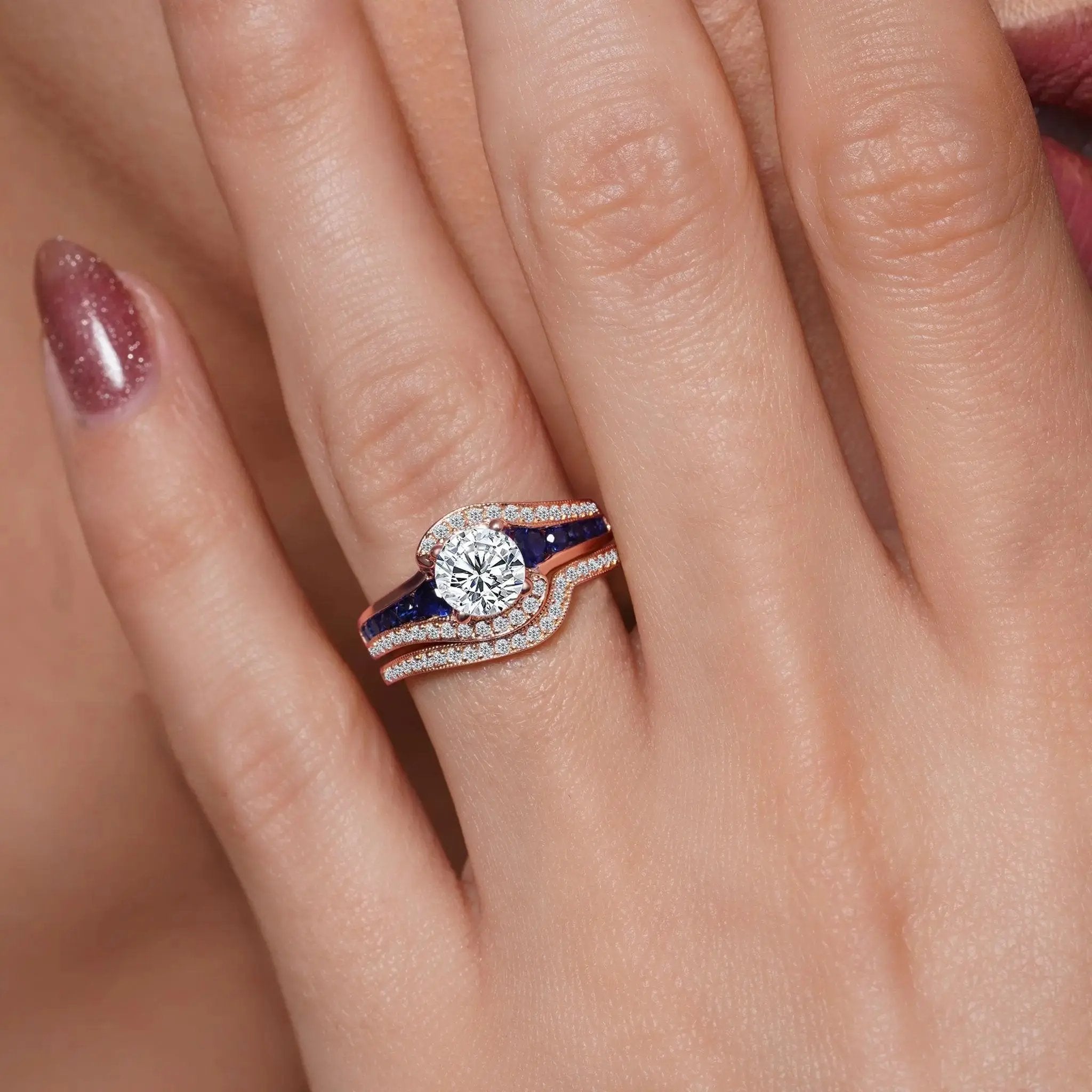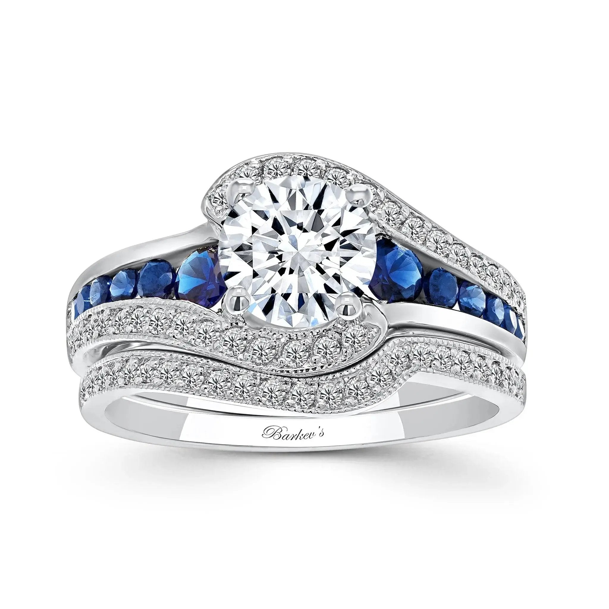 This unique blue sapphire accent bridal set features a prong set round center. The shoulders split and curve up to the center with pave set diamonds, while channel set blue sapphires grace the sides. Comes with a matching wedding band.