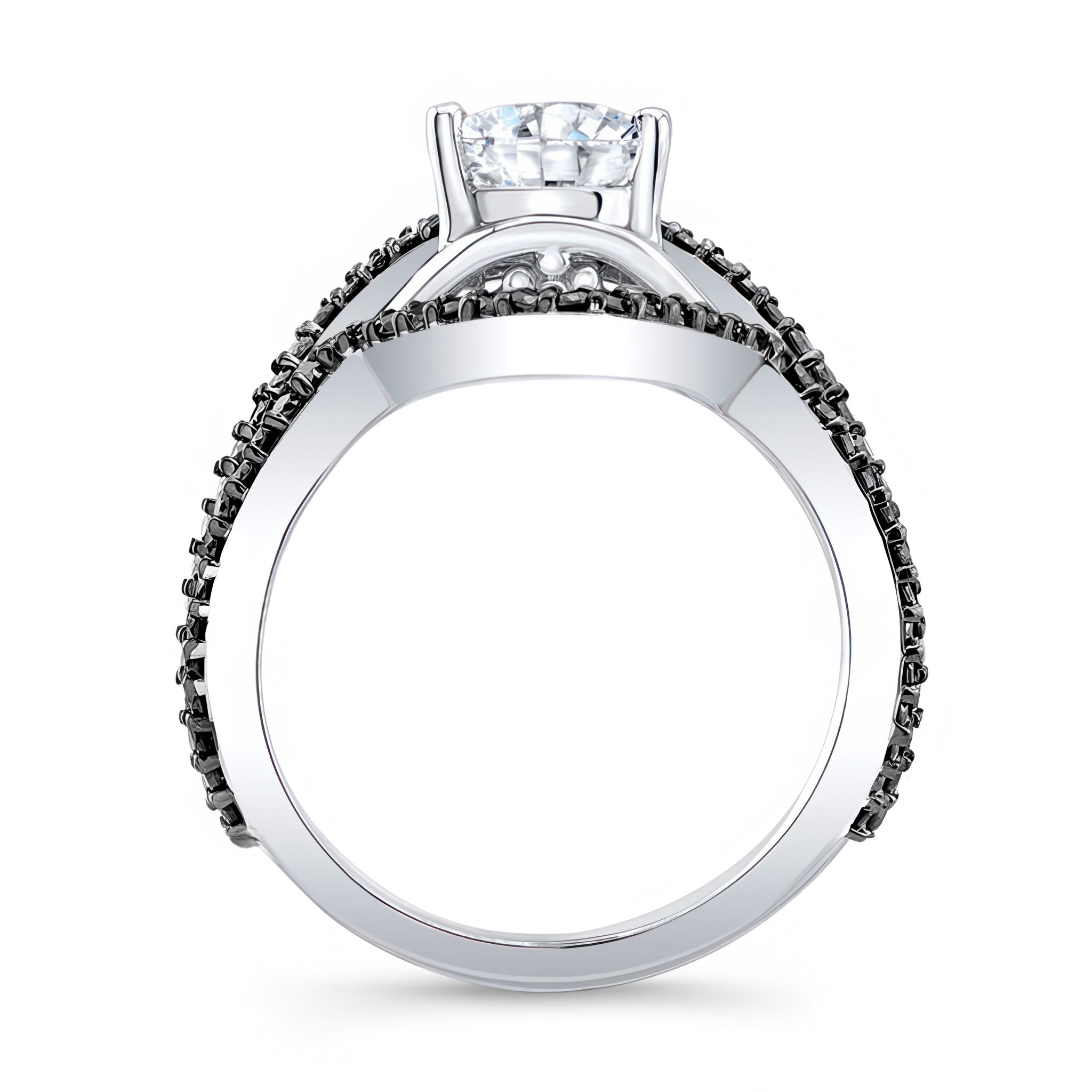 Set on a gracefully twisting band, the design offers both movement and comfort. The shared prong setting enhances the brilliance of every stone, while the hidden flower detail under the center adds a refined artistic flourish. This set is a perfect blend of daring style and timeless romance.