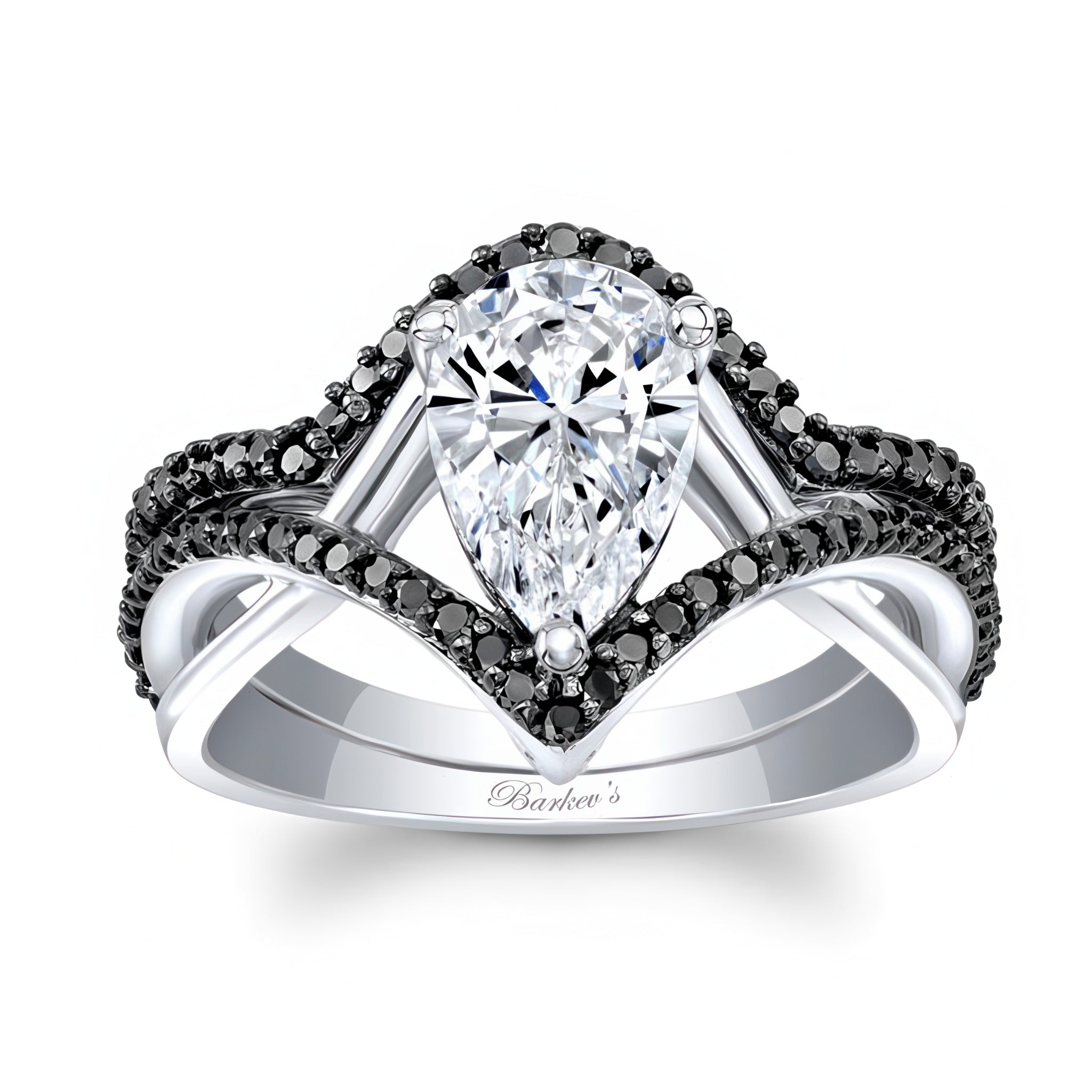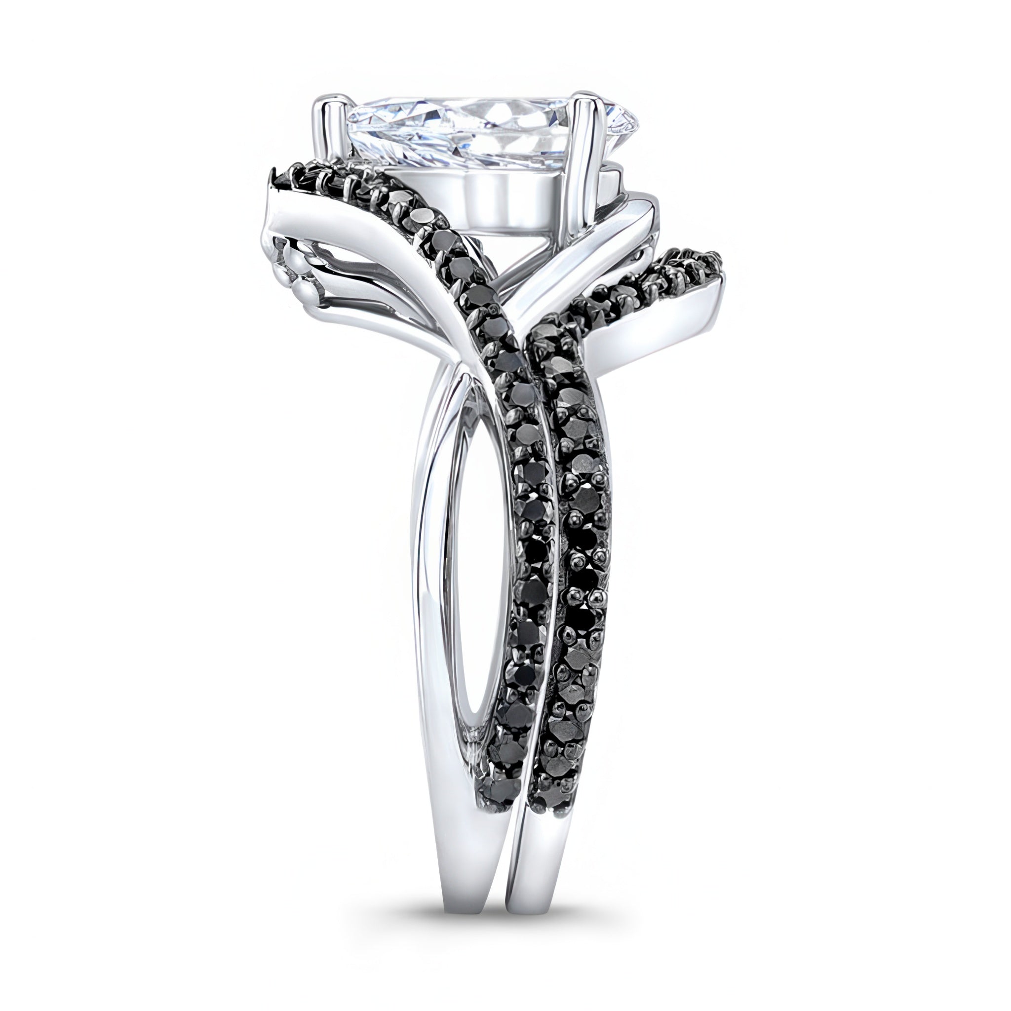 The Unique Pear Shaped Black Diamond Accent Wedding Set is for the bride who appreciates drama wrapped in elegance. Featuring a luminous pear-shaped white diamond center, this ring is enriched with black diamond accents that add intrigue and depth.