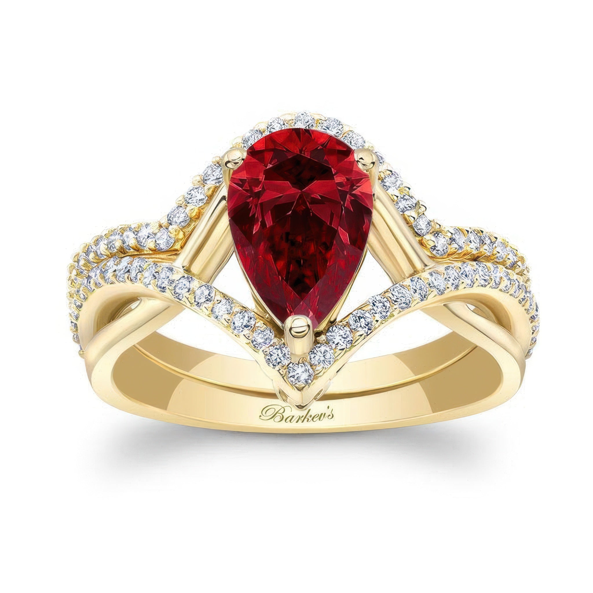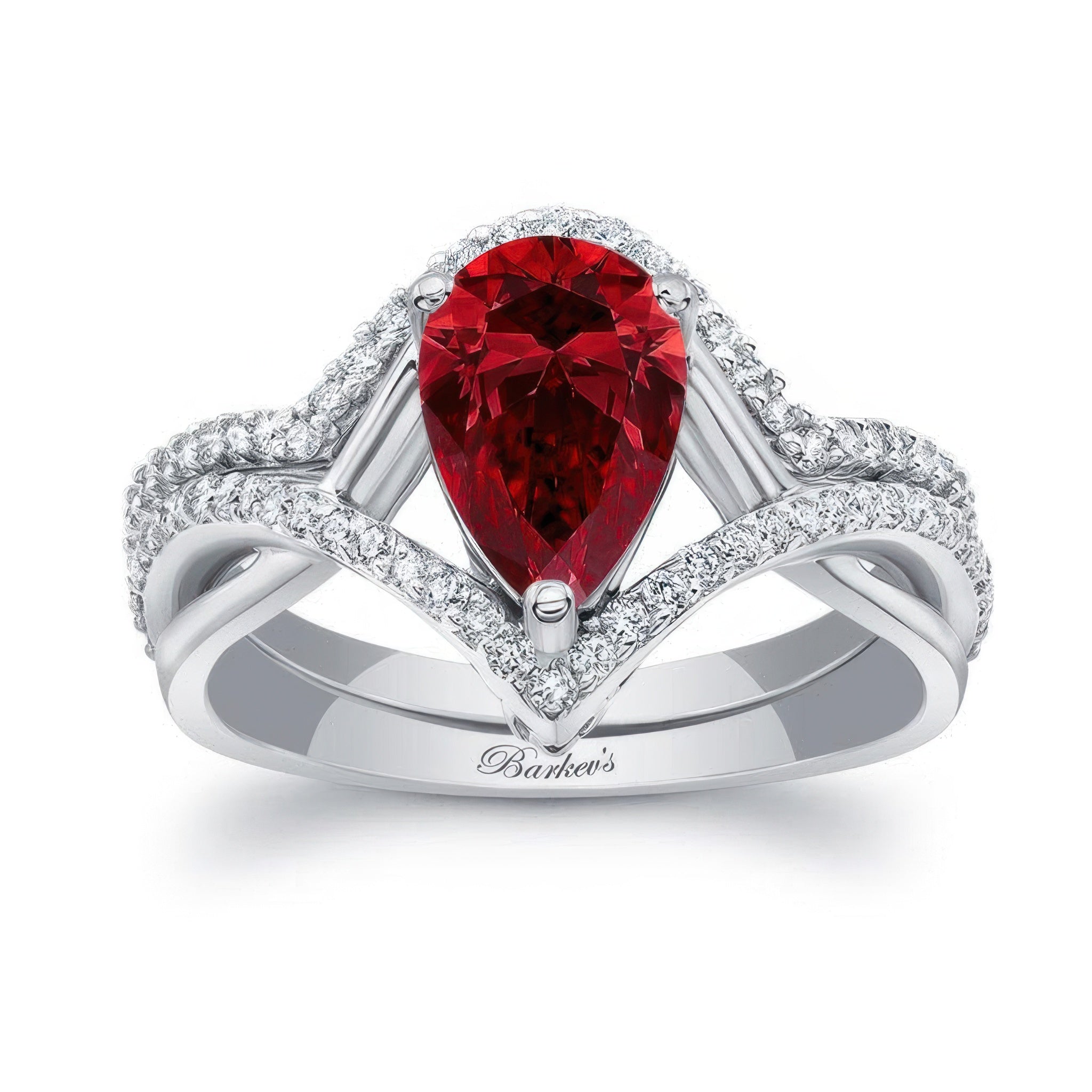 Make a statement with the passionate and elegant Unique Pear Shaped Ruby And Diamond Wedding Set. Featuring a striking pear-shaped ruby center stone surrounded by shimmering diamonds, this set celebrates love with vivid color and radiant brilliance.