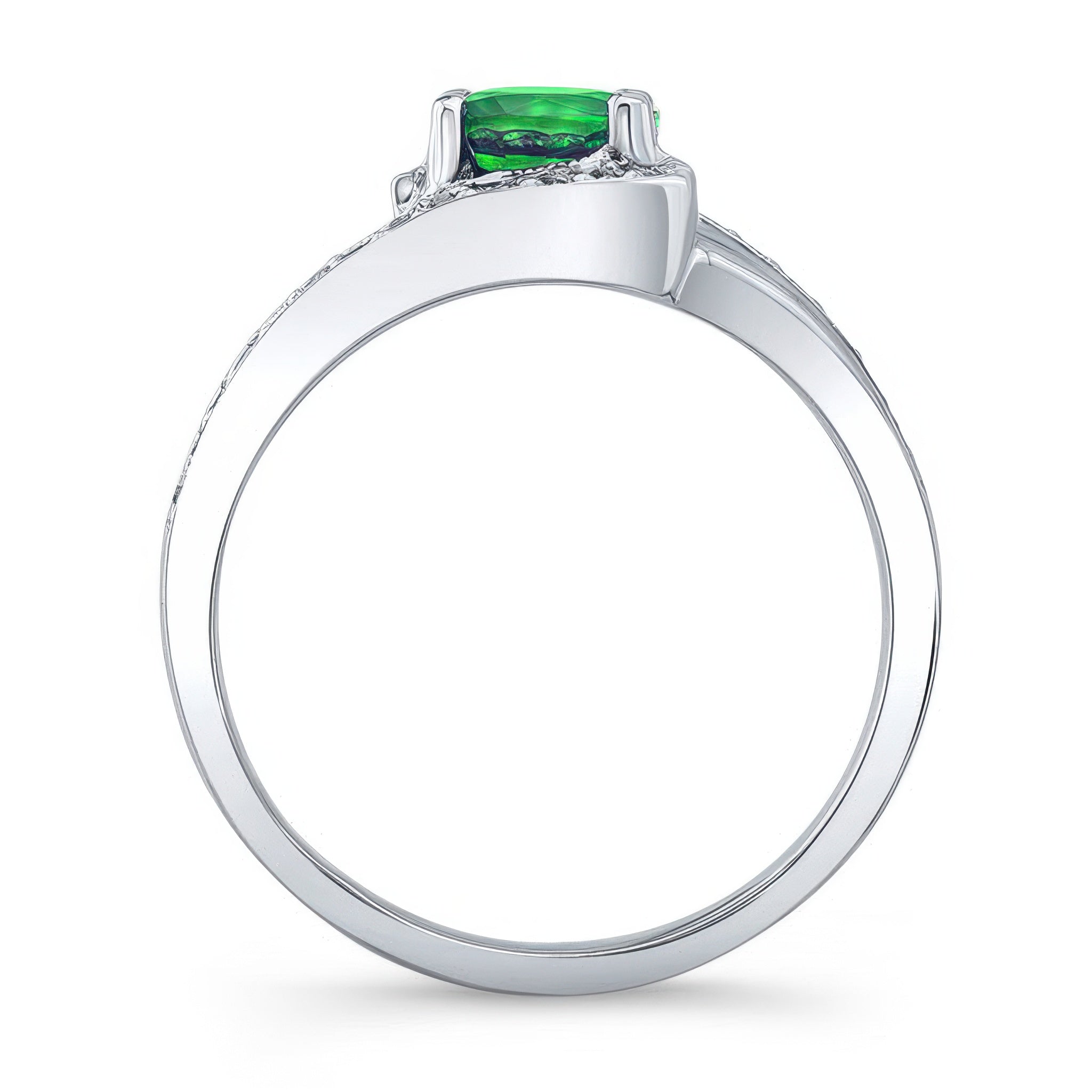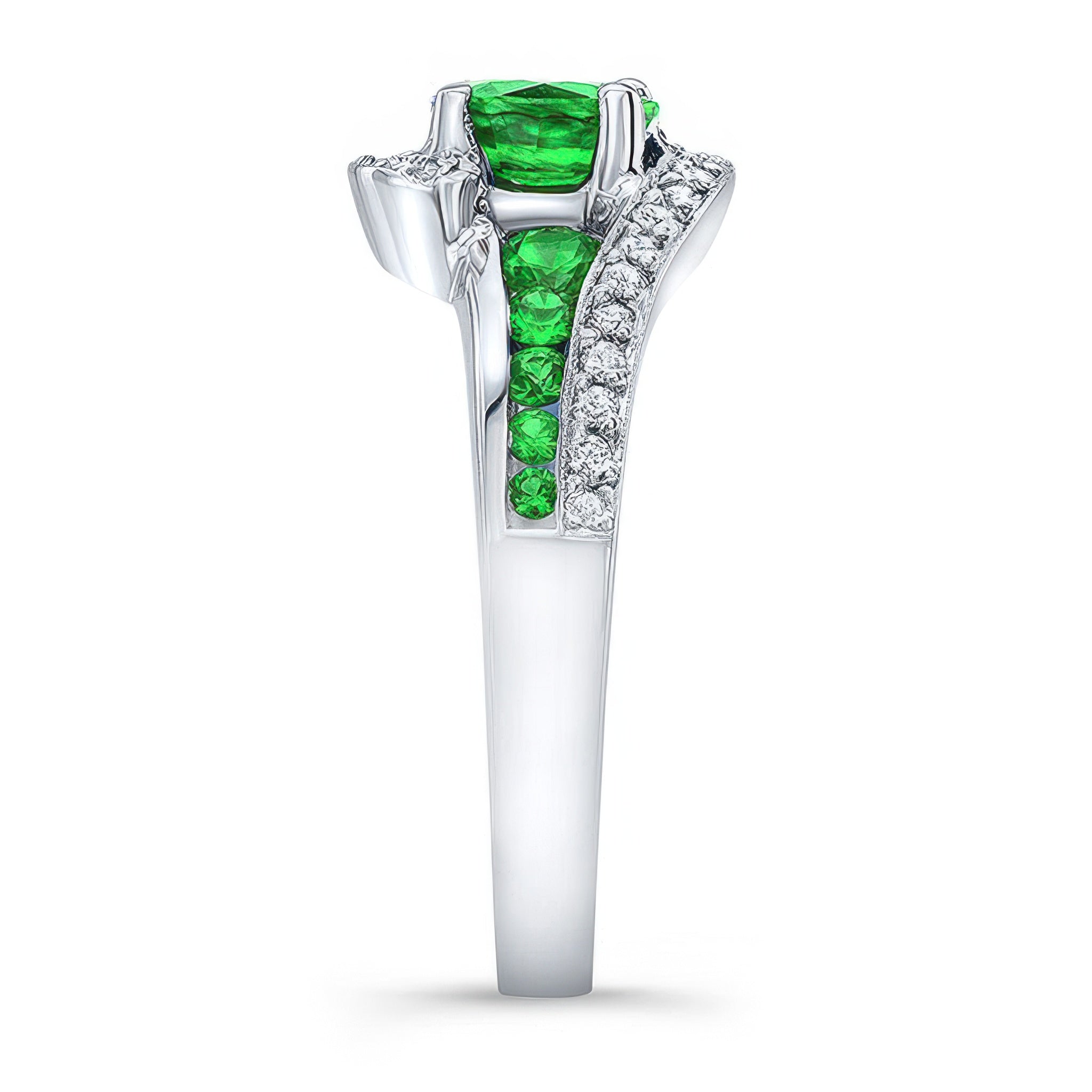 This unique tsavorite engagement ring features a prong set round tsavorite center. The shoulders split and curve up to the center with pave set diamonds, while channel set tsavorites grace the sides.