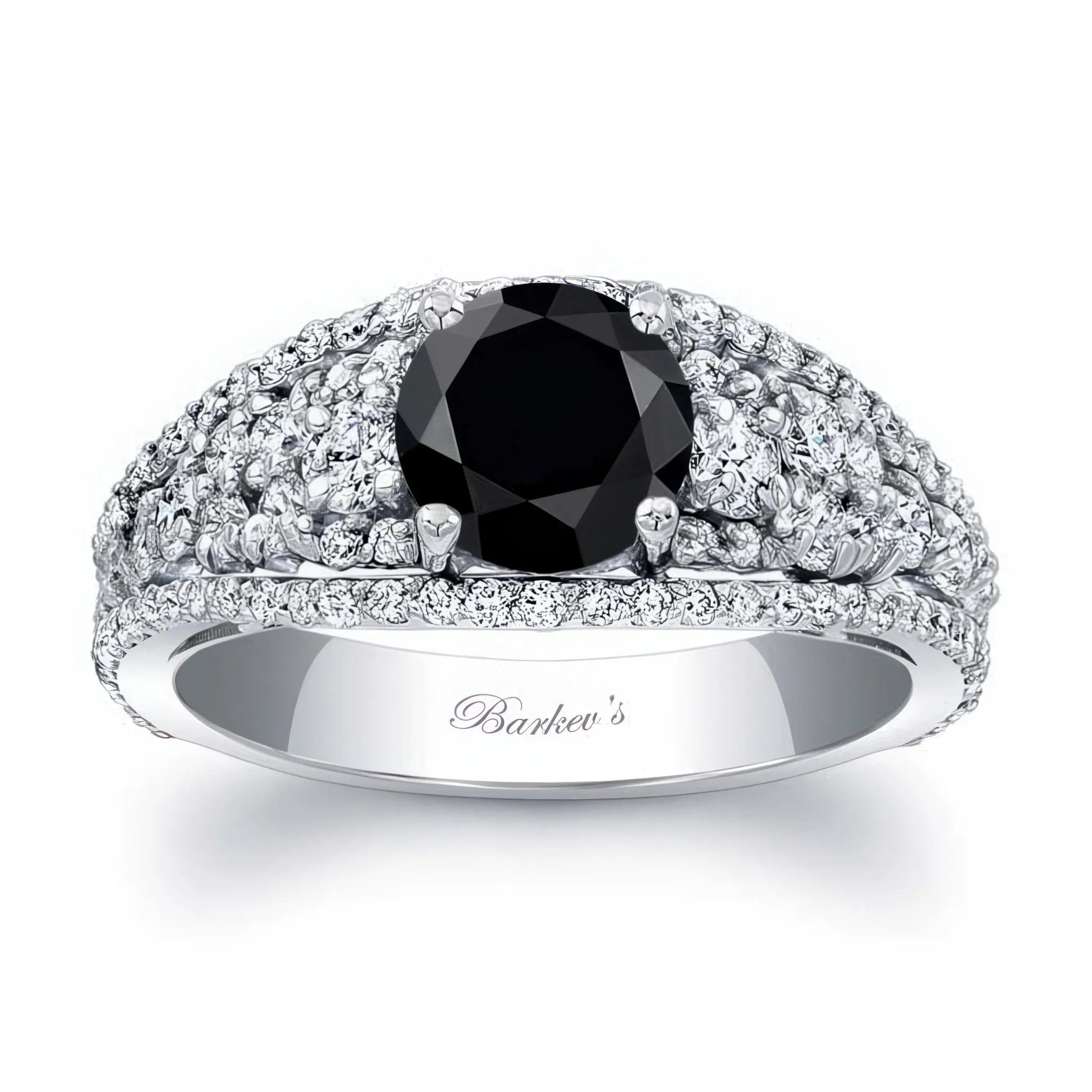 This vintage 1 carat black and white diamond engagement ring features a round center with various diamonds adorning the shank with a flower and vine motif visible from the sides for a touch of pizzazz.