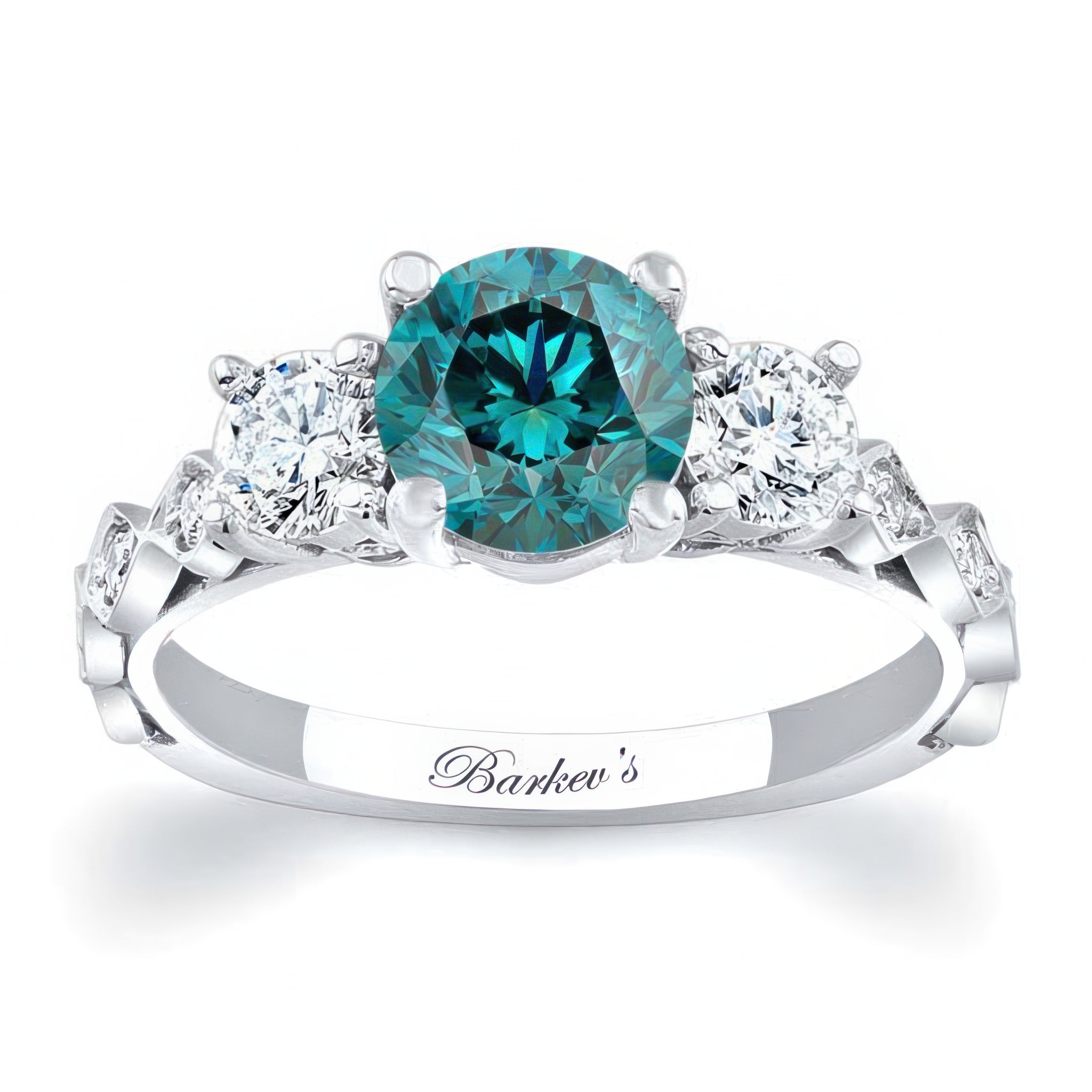 This vintage 3 stone blue and white diamond ring features a cathedral shank and three prong set round stones across the center while shared prong set diamonds grace the shank for an added touch of elegance.