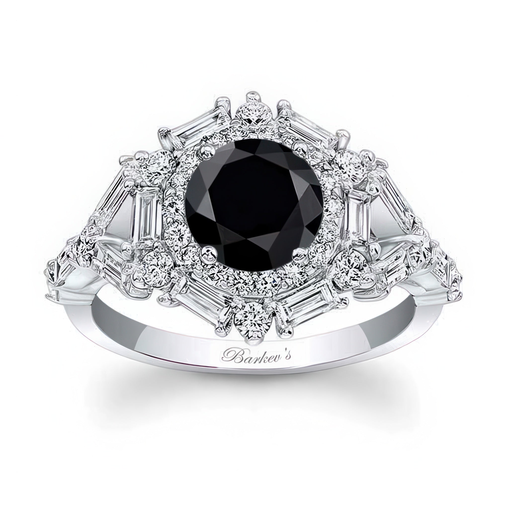 This vintage baguette black and white diamond engagement ring radiates sophistication with alternating baguette and round diamonds encircling the round center and continuing down the split shoulders for an added touch of elegance.