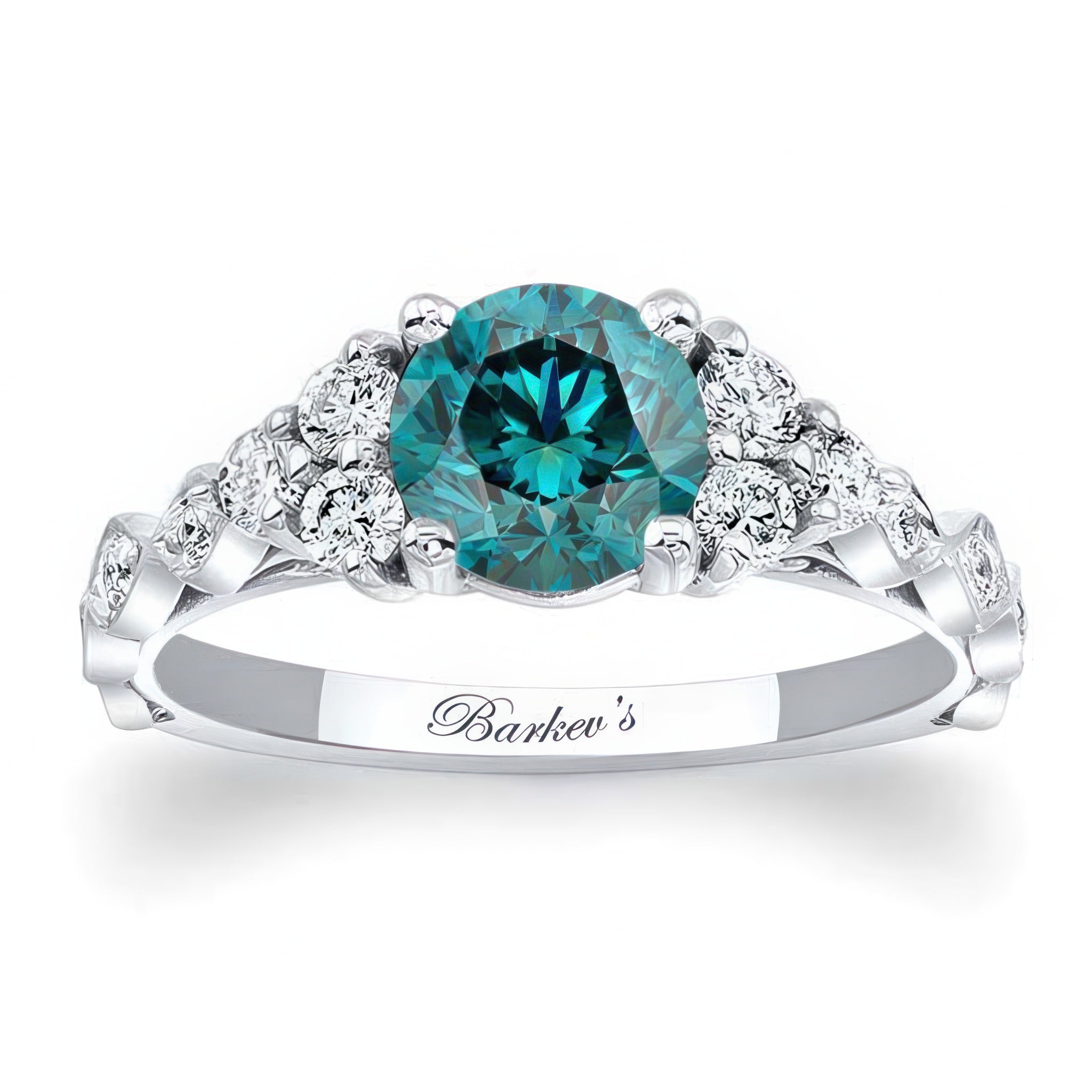 This vintage cluster blue and white diamond ring features a cathedral shank with a prong set round center embellished with diamonds on the shoulders and shank for an elegant traditional look.