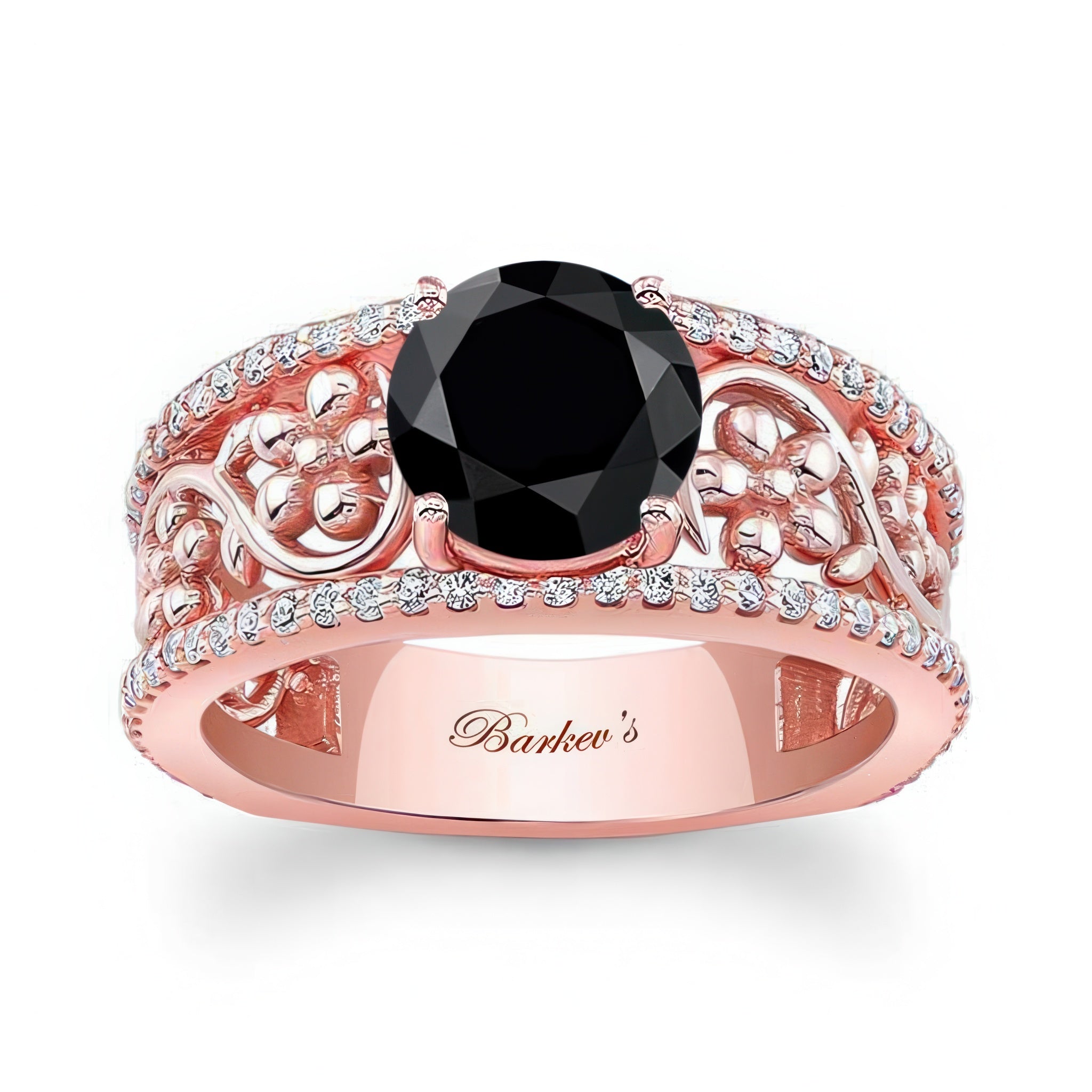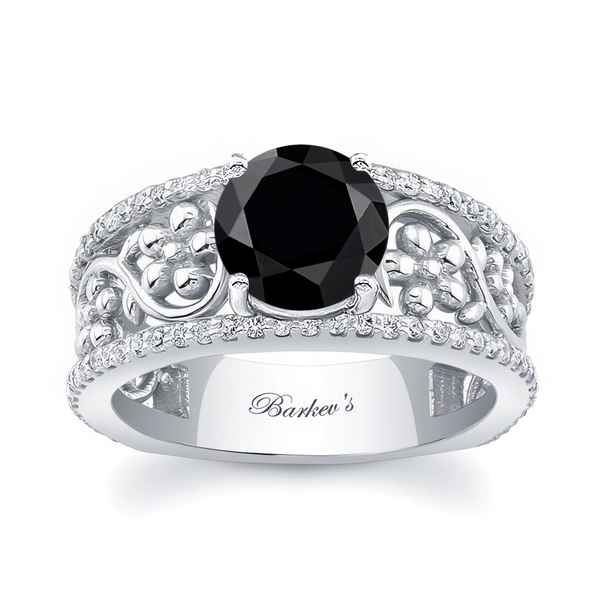 This vintage floral 2 carat black and white diamond engagement ring features a prong set round center with shared prong set diamonds on the outside ridges and an intricate flower and vine pattern in the middle for an elegant wide band look.