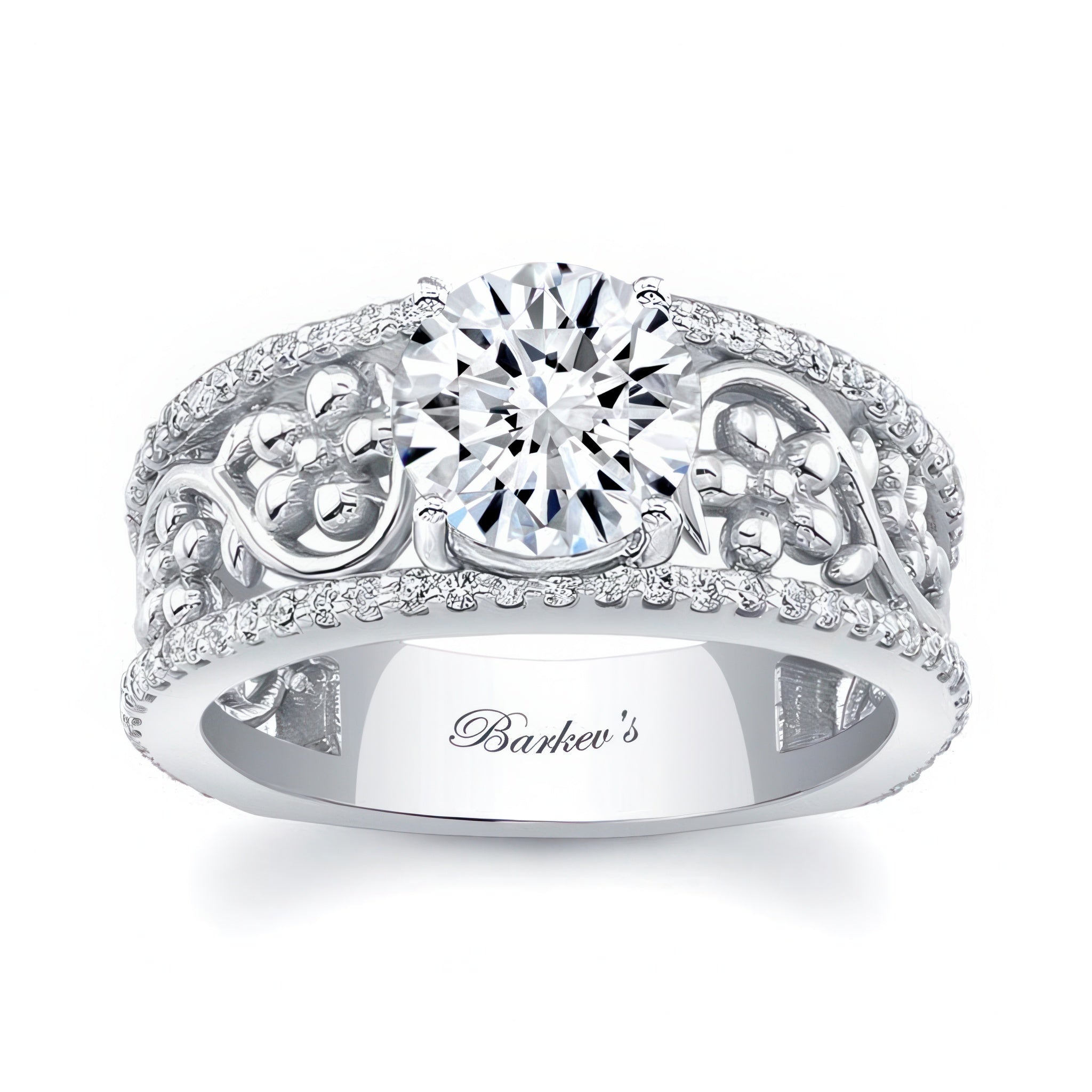 This vintage floral 2 carat engagement ring features a prong set round center with shared prong set diamonds on the outside ridges and an intricate flower and vine pattern in the middle for an elegant wide band look.