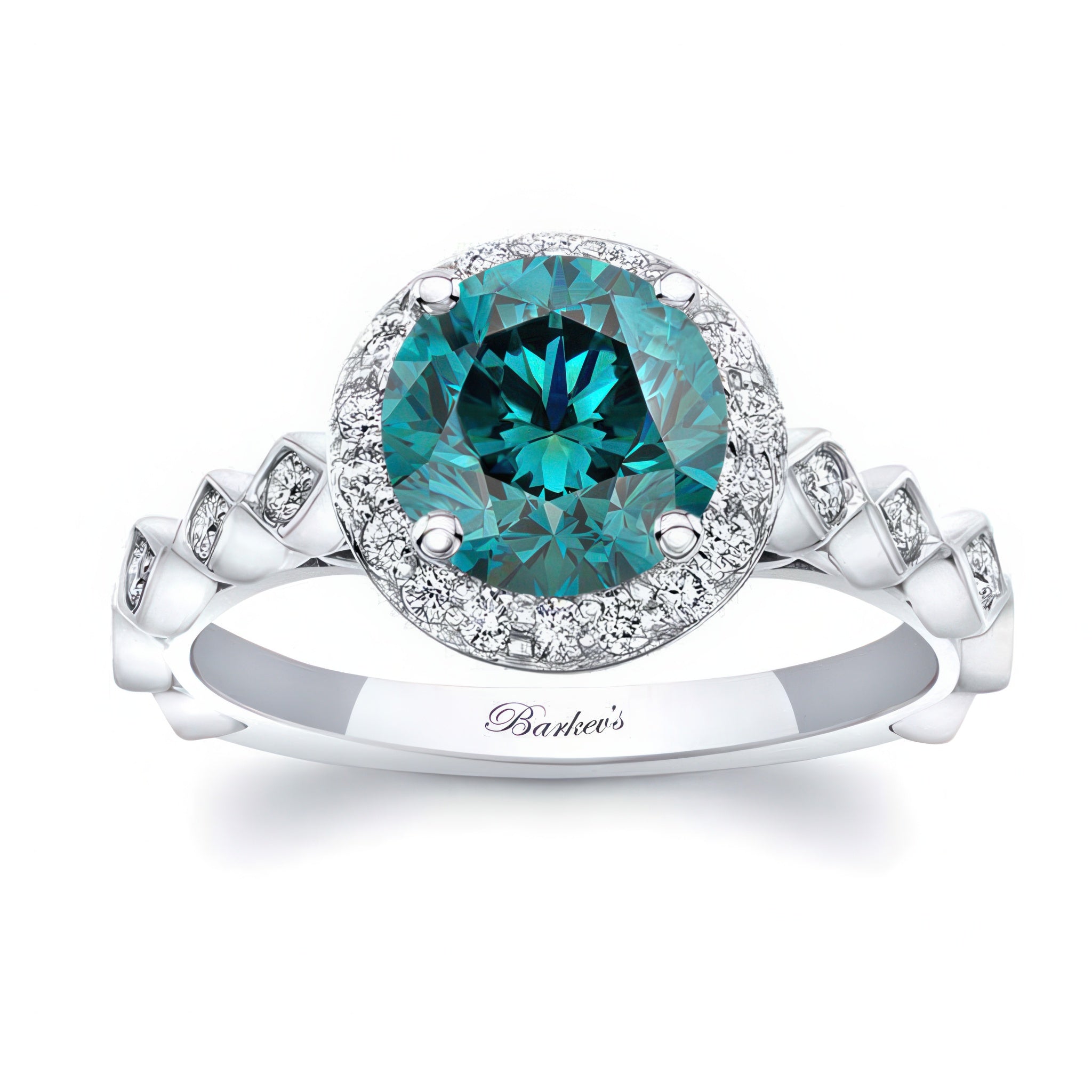 This vintage halo blue and white diamond engagement ring truly sparkles from every angle. The round prong set center is framed by micro pave set diamonds on top, and channel set baguette diamonds from the side. The ring is further embellished with shared prong set melees that grace down the cathedral shank.